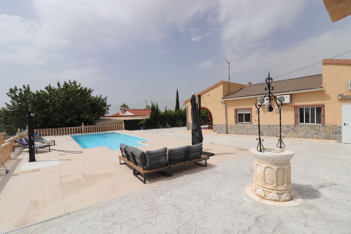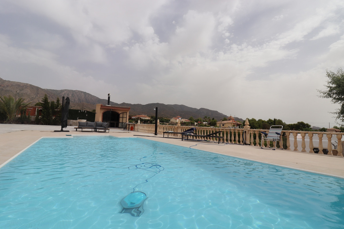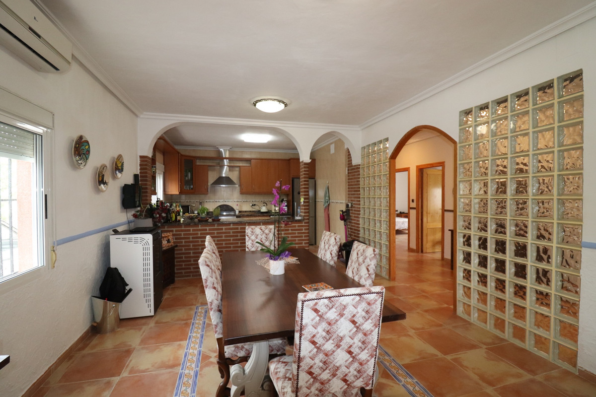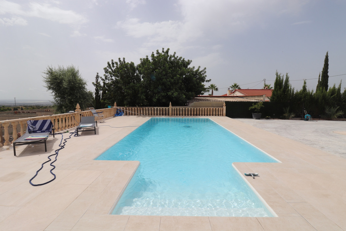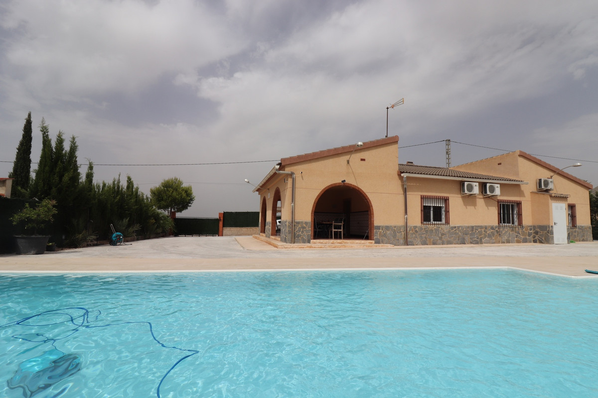 New listing direct from the owner! Beautiful detached country house in Albatera. This beautiful finca has neighbors but is privately located and has 4 very large bedrooms, each with air conditioning hot and cold. Upon entering the hallway, the living room and open kitchen are located on the left side of the house. The fully renovated bathroom has a walk-in shower and double sink. The open American kitchen is fully equipped with all necessary appliances and is in direct contact with the living room. The large living room has a fireplace but also a pallet burner and again an air conditioning cold and hot. The house is connected to electricity and water company Albatera. The wide veranda with direct contact with the large new swimming pool 10 x 5 and a separate outdoor kitchen with a professional barbecue makes outdoor living in this country house very pleasant. The large gardens and an olive grove give you a pleasant feeling of plenty of space and privacy. Located in a quiet area, 20 minutes from the beaches.