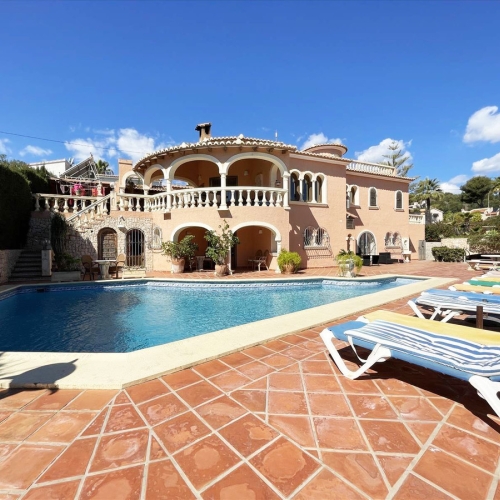 This traditional Spanish villa is located in a quiet area in Benissa a short distance from the coast. The ground floor comprises a spacious living-dining room, a fully equipped, modern kitchen and three double bedrooms, each with a private bathroom. The master bedroom is on the first floor and has a very spacious bathroom with sea views, a dressing room and a large terrace from where you can also enjoy the beautiful views of the Peñon de Ifach and the sea. Both the living room and all bedrooms on the ground floor have direct access through sliding windows to the spacious covered terrace. From the terrace you have views over the large swimming pool surrounded by a beautiful mature Mediterranean garden with several palm trees. On the other side of the villa is a large driveway with a carport and parking space for several cars. In the basement there is another laundry room and a storage room. The villa has underfloor heating, air conditioning, shutters, automatic irrigation and solar panels. In less than 5 minutes you reach the coast of Benissa where there are several idyllic beaches. In less than 10 minutes you reach the tourist port village of Moraira and in just 15 minutes you are in the lively seaside town of Calpe.
