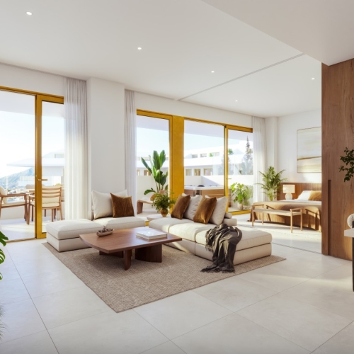 Modern new-build residential development located in Los Pacos, Fuengirola, one of the most sought-after residential areas on the Costa del Sol. The project offers 1, 2 and 3-bedroom homes with spacious layouts, contemporary Mediterranean design and excellent natural light. The properties feature large terraces conceived as an extension of the living space, with the option to add a private pool in many units. All homes are delivered with fully fitted and equipped kitchens, complete bathrooms with designer finishes, climate control systems and large-format porcelain flooring indoors and outdoors. A key highlight is the flexible layout concept, allowing one bedroom to be integrated into the living area through a sliding partition wall, ideal for a home office, guest room or extended living space. The communal areas are designed to enhance everyday living and include a saltwater outdoor swimming pool with solarium, children’s pool, fully equipped indoor gym, sauna, changing rooms, coworking space, communal laundry room and landscaped gardens with low water consumption. Excellent road access via the A-7 and AP-7, as well as a nearby commuter train connecting directly to Málaga city centre and the airport, make this development ideal as a permanent residence, holiday home or investment opportunity.