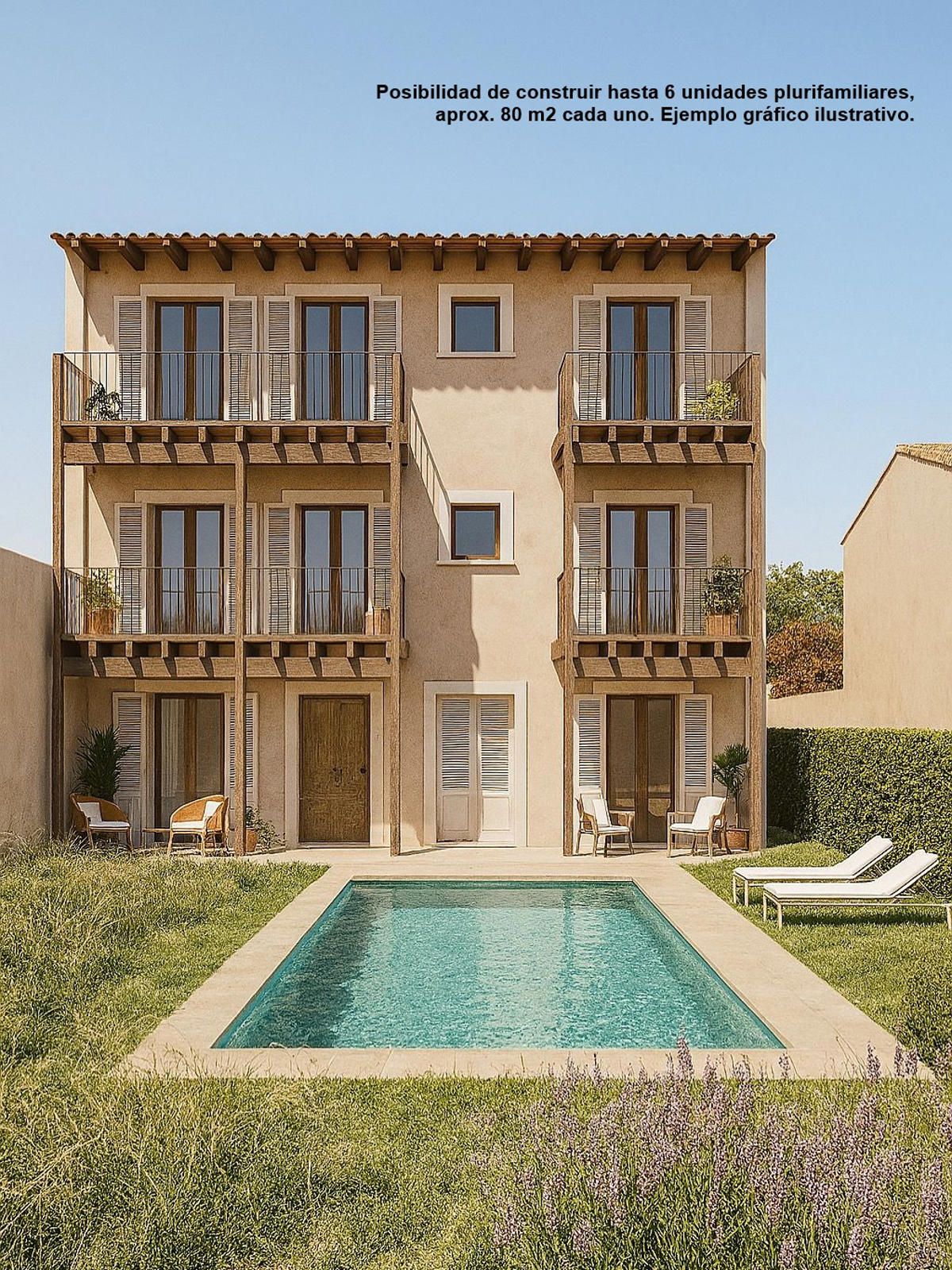 298 m2 Building plot for sale in Sa Pobla, on which up to 624 m2 and a swimming pool can be built. The basement and ground floor can be constructed with up to 100% and 2 upper floors can be built with up to 60%. It is possible to build a single-family home or up to 6 residential units with a minimum area of 80 m2 each. The quiet plot is completely fenced and offers plenty of privacy. It is located on a paved road with electricity, water and sewage connections at the entrance of the plot, which can easily be connected to the future house. This plot in Sa Pobla is ideal for investors or those who want to build their own large home with a spacious garden.If you are looking for the ideal mix of affordable housing with plenty of space, proximity to the beach and excellent facilities, Sa Pobla is just the place for you. With a train station, so you can comfortably reach Palma and Inca in only a few minutes, health centre, numerous shops, services, schools and sports facilities you can really find everything for daily life in Sa Pobla. Furthermore, the village is known for its fertile land and its excellent restaurants, which prepare the authentic Mediterranean flavour of the island like few others.A house for the whole family or individual apartments - this urban plot in Sa Pobla can be transformed into what you are looking for. Design the project entirely to your own taste, with the room layout you need and the kitchen, tiles and pool to complete your dream. Accompany the fascinating process, as your home is built piece by piece on the red earth to become the starting point for your daily adventures. Your friends and guests will be amazed when you invite them to the first barbecue in your new home.
