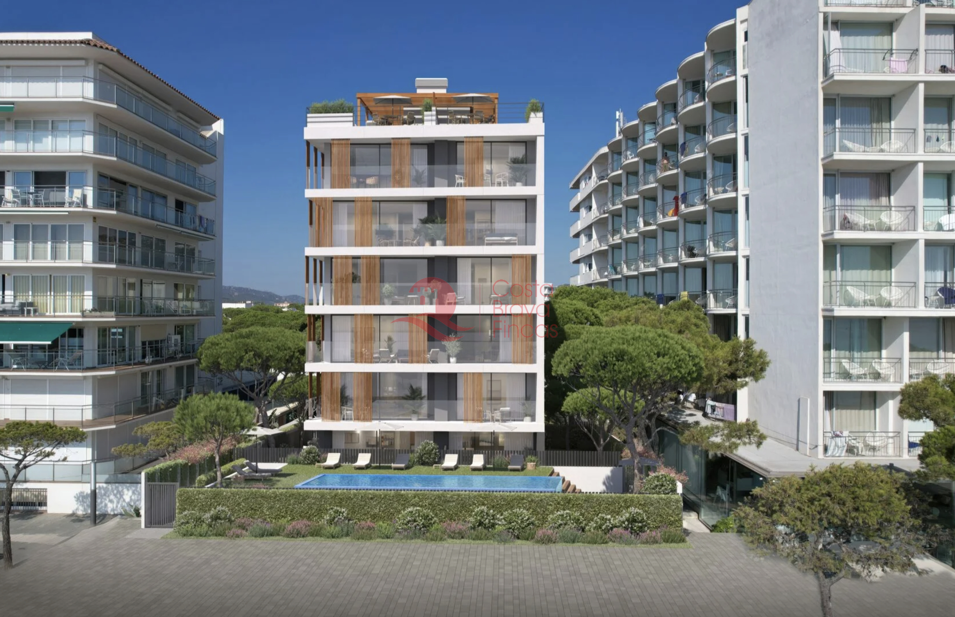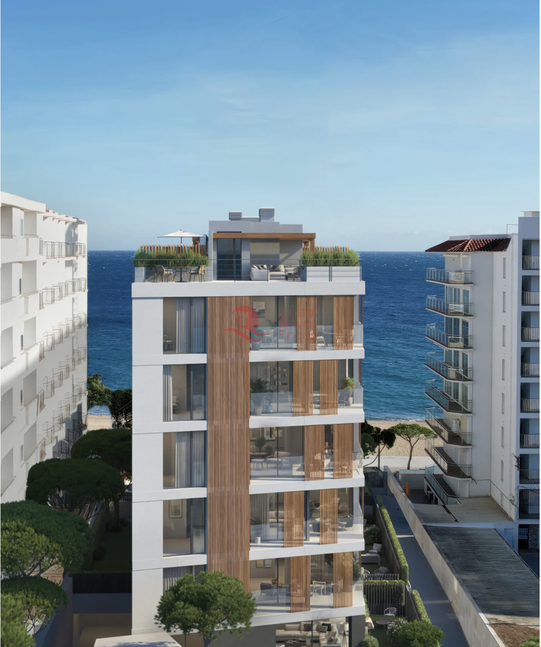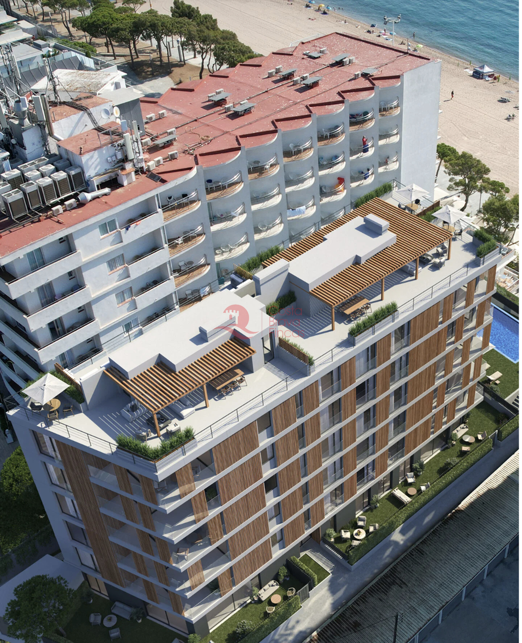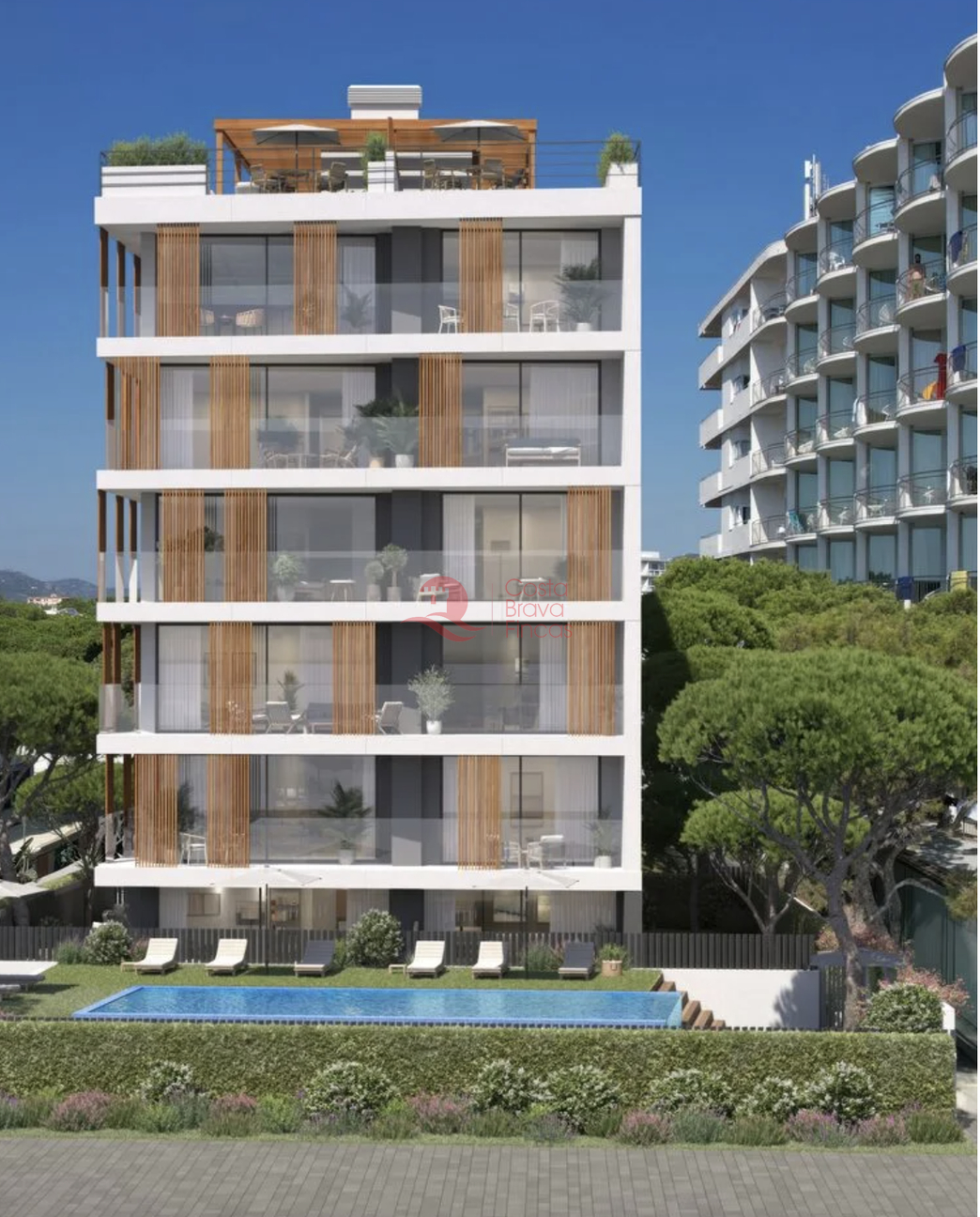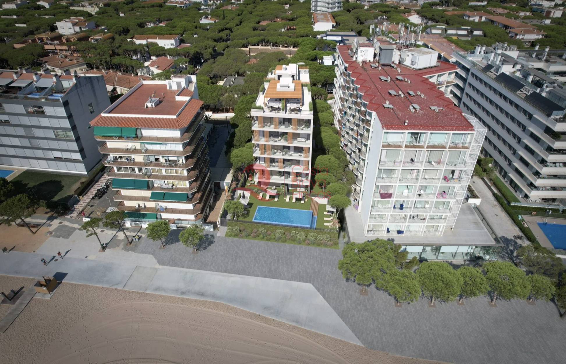 Exclusive building on the frontline of the sea in Platja d'Aro. Complex of 18 unique homes with spectacular panoramic views of the sea and mountains. Large windows flood each space with natural light, and their layouts have been designed to offer maximum comfort and functionality. The building features elegant common areas and a large infinity pool that seems to blend with the horizon. The architecture combines light concrete, noble wood, and extensive glazed surfaces, achieving a warm, bright aesthetic that is perfectly integrated into the environment. The vegetation surrounding the building provides privacy, freshness, and a relaxing atmosphere. Thanks to its studied orientation and natural ventilation, the homes remain pleasant even in the height of summer, allowing enjoyment of both sunny terraces and balconies and shaded areas for relaxation. All residences are delivered fully finished: parquet floors, modern and functional kitchens, noble materials such as stone and natural wood. Ready to move in and enjoy from day one. The main common area is undoubtedly the beach, located right in front of the building and separated only by a pleasant pedestrian walkway. Within the private grounds, sun loungers and umbrellas accompany the infinity pool, creating a perfect space to relax and embrace the slow pace of an authentic seaside village. In the heart of the Costa Brava, in Platja d’Aro, this location enjoys the Mediterranean climate year-round. Literally situated on the beach, it offers direct access to one of the most beautiful coasts in Spain. Just a few steps away, you will find a diverse array of dining options, walking paths, and outdoor activities: from morning runs to seaside strolls at sunset.