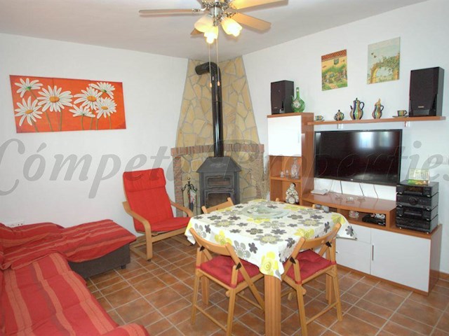The inside of the property comprises a living-dining room with a wood burner to warm up in winter, a fully equipped kitchen with a breakfast bar, 2 double bedrooms and a family bathroom with bathtub. At the back of the property there is a carport to park the car on the shade.