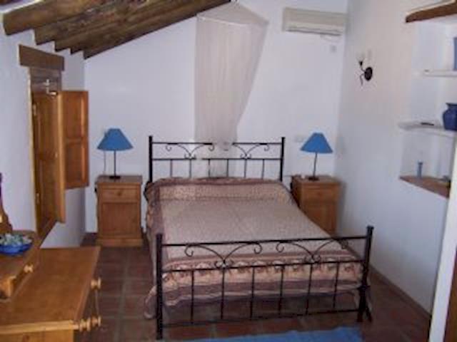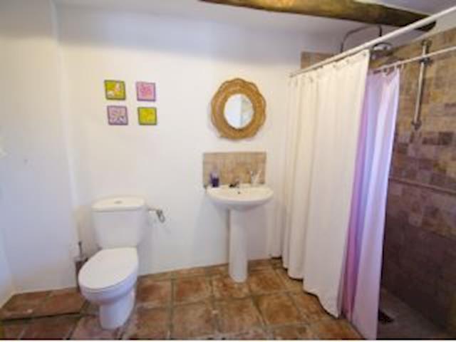 A terracotta staircase leads to the upper floor on which there is a double bedroom, a twin bedroom and a charming master bedroom with balcony and ensuite facilities with both bath and shower. All bedrooms have ac/heating systems. There is also a family bathroom on this floor.