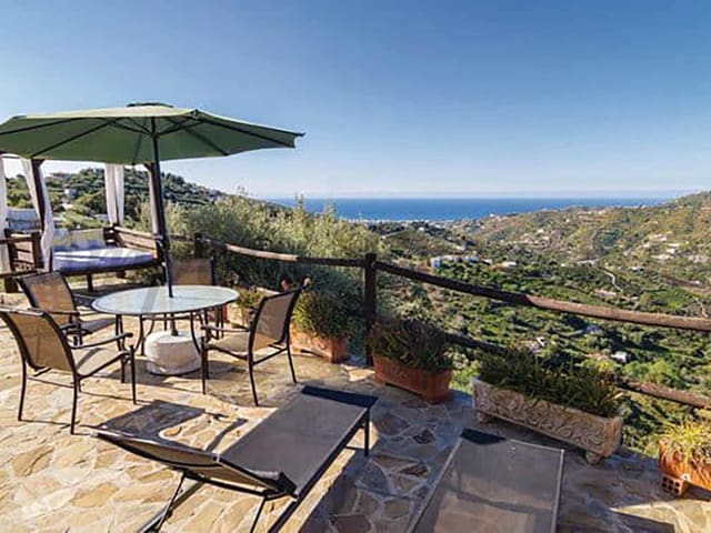 Villa Cortijo El Amigo is a charming country house located in Torrox, Malaga, in the heart of the Costa del Sol, ideal for a peaceful and comfortable holiday with family or friends. This detached villa can accommodate up to 4 people and has 2 bedrooms, one with a double bed and the other with two single beds, as well as 2 full bathrooms. The house is equipped with air conditioning and offers Wi-Fi in all rooms. The living room has comfortable sofas, a decorative fireplace, TV and direct access to the terrace with sea views, while the kitchen is fully equipped with a dishwasher, oven, microwave, coffee maker, toaster and washing machine, as well as a practical outdoor barbecue. Outside, there is a 7x4 metre private south-west facing swimming pool surrounded by sun loungers, a pergola, an outdoor dining area and a shower, all with spectacular views of the Mediterranean Sea. Villa Cortijo El Amigo combines rustic Andalusian charm with all modern comforts, making it the perfect retreat to enjoy the sunny climate of the Costa del Sol.