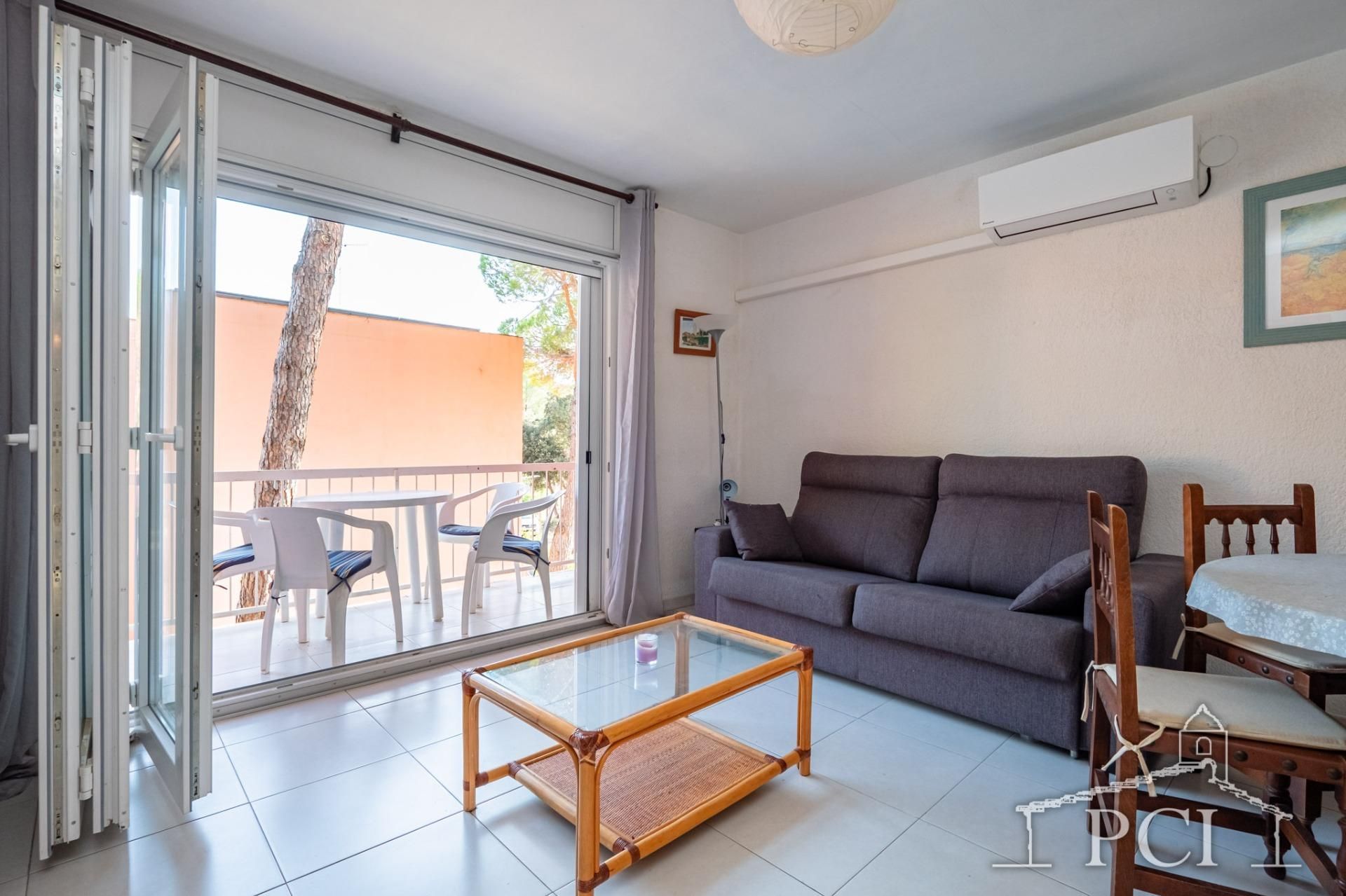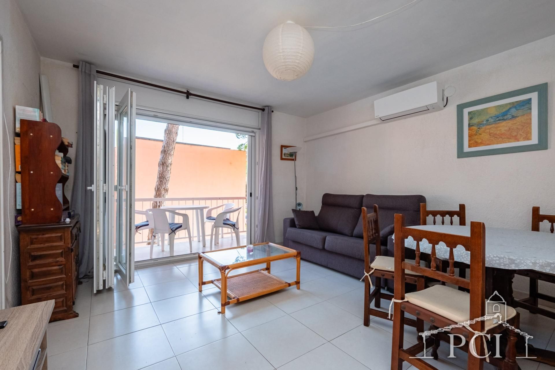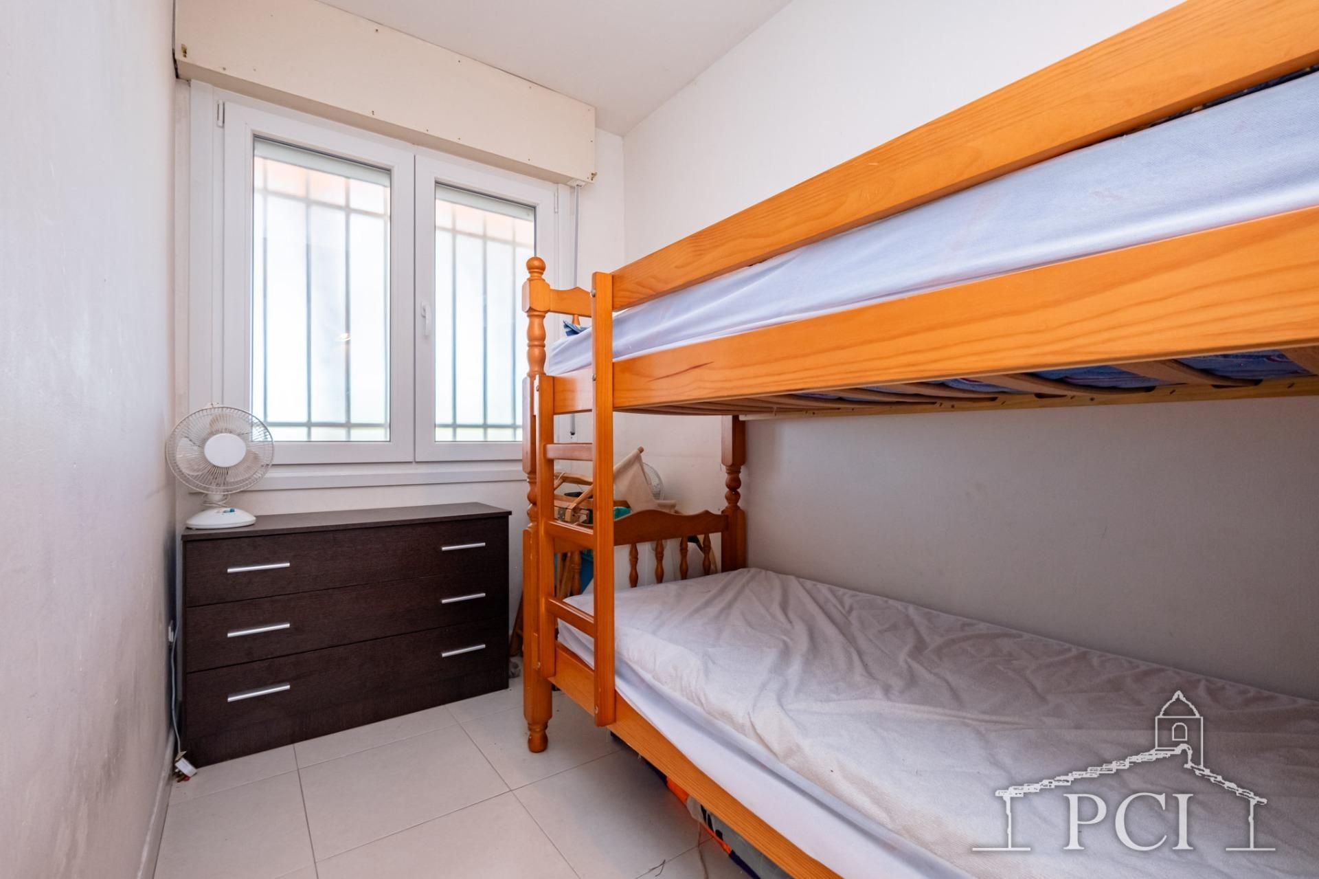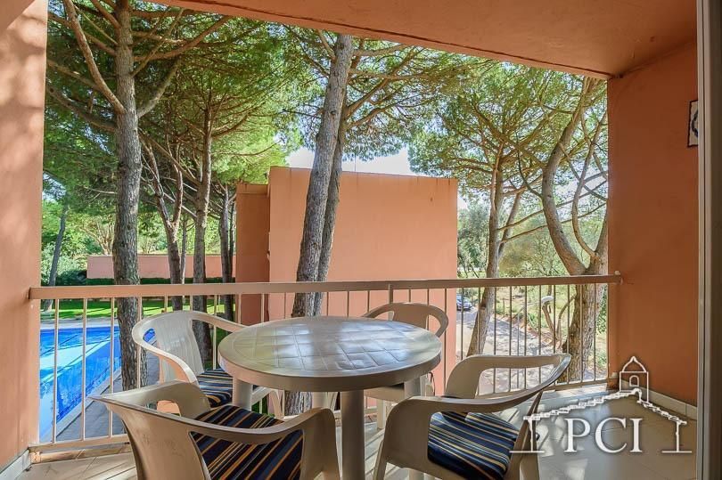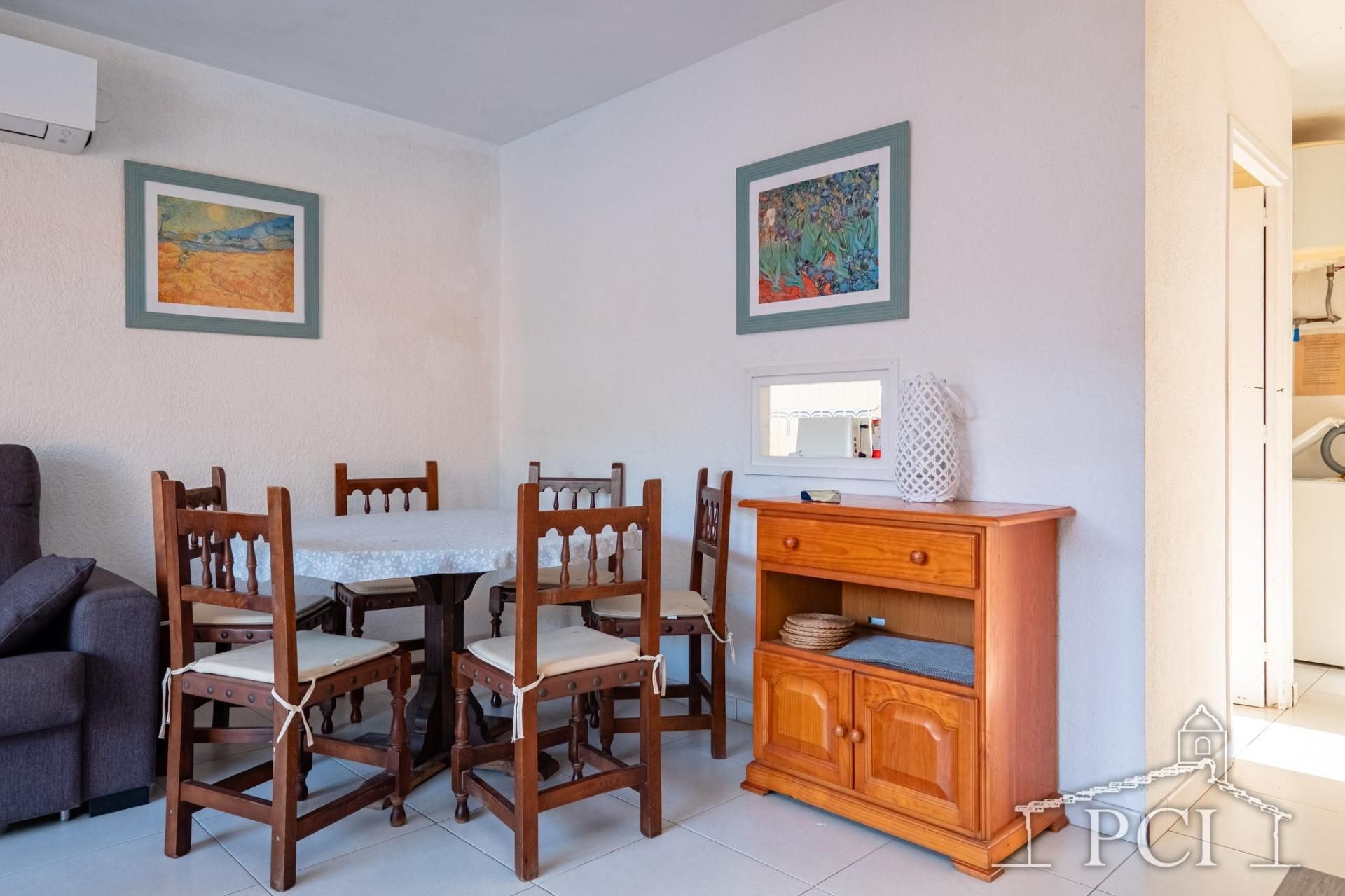 Bedrooms: 2 Bathroom: 1 Communal pool Surf.Apartment: 46 m2 Surf.Terrace: 7 m2 Apartment in a well maintained community with pool, gardens and parking space. At 2.5 km from the beach. It is composed: Living room with large bi-fold doors leading to terrace, sperate kitchen, 2 bedrooms (one with bunk beds), 1 bathroom. Year of construction: 1978 Facing: East. Community expenses: € 800 per year. Air conditioned in the living room. New aluminium carpentry and double glazing, all with fly screens. Additional purchase fees: 10% tax + Notary fees + land registry fees[IW]