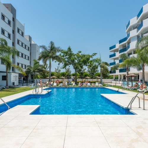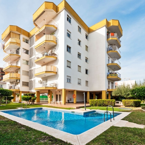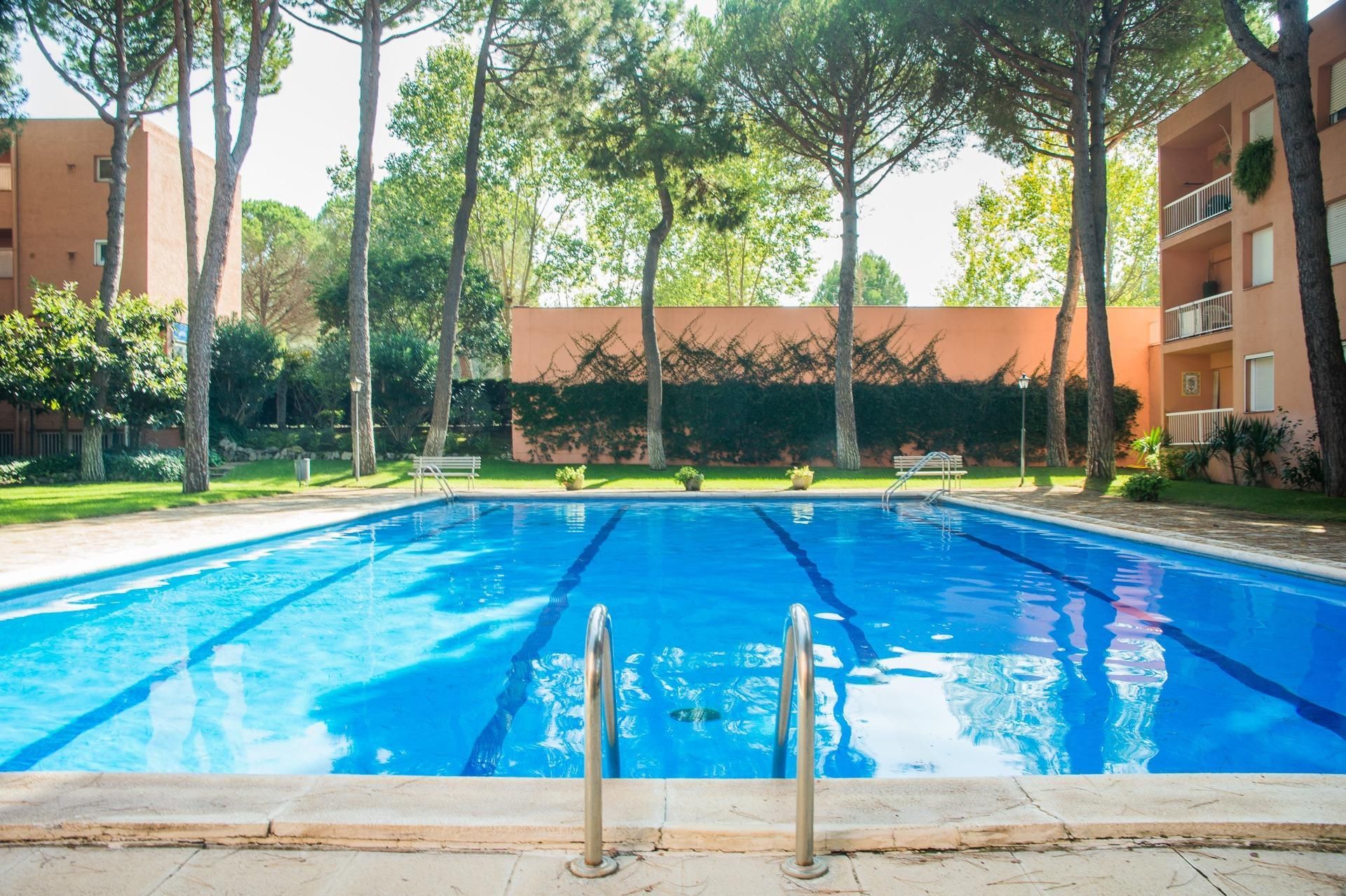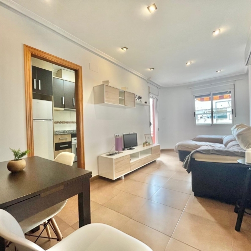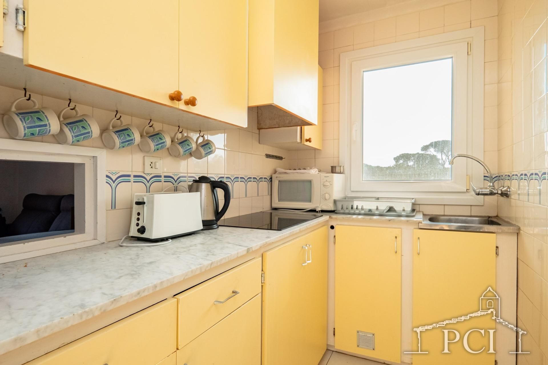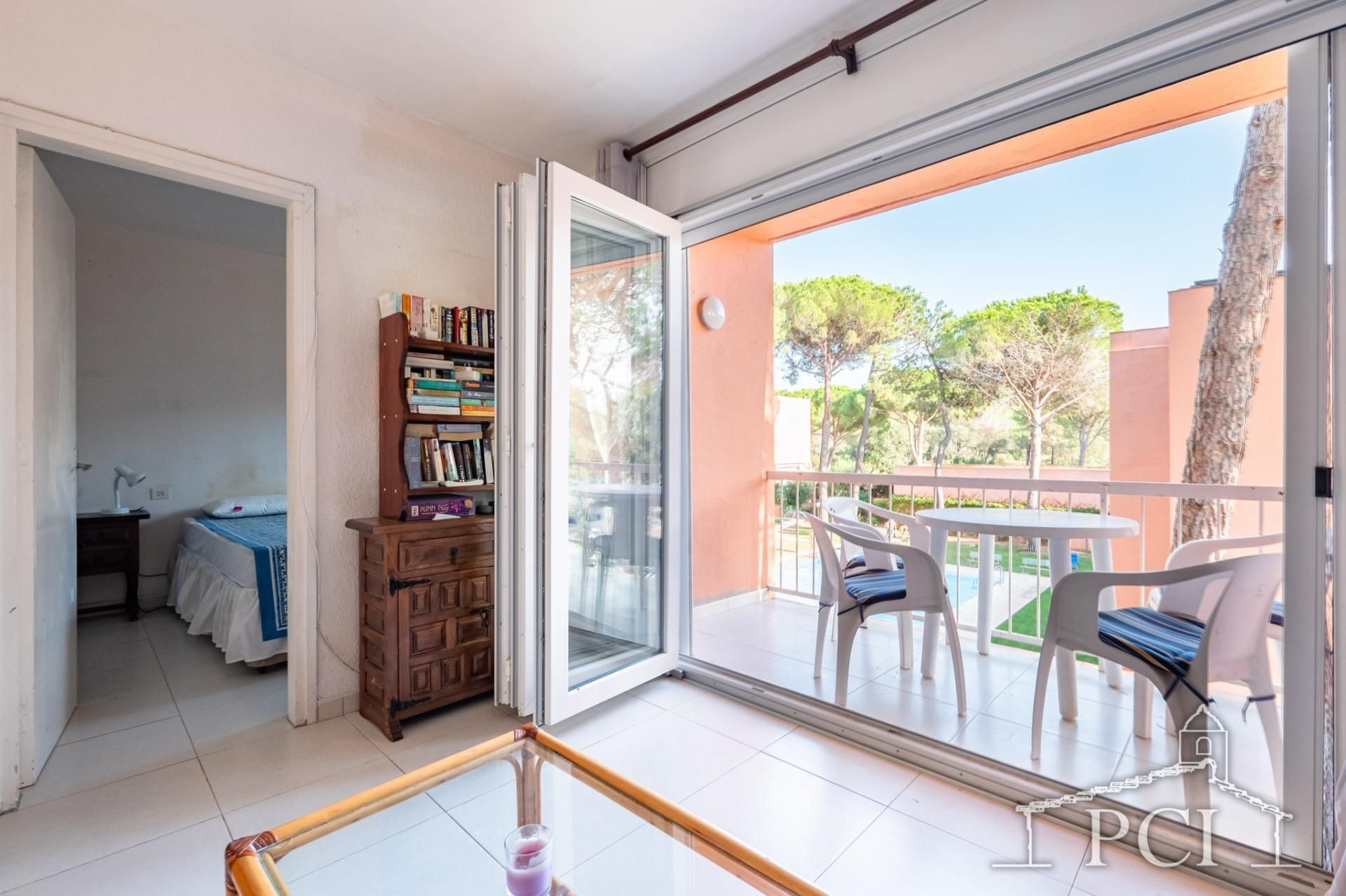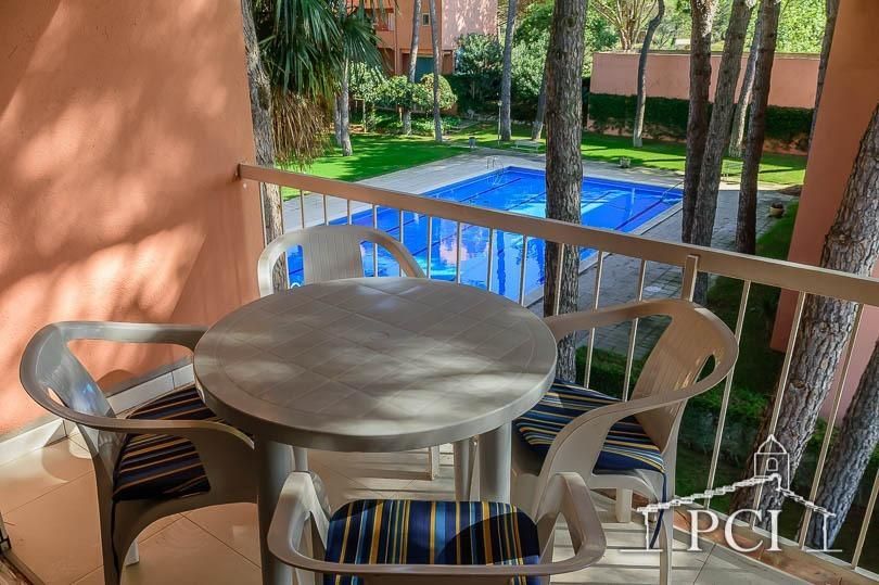 Bedrooms: 2 Bathroom: 1 Communal pool Surf.Apartment: 46 m2 Surf.Terrace: 7 m2 Apartment in a well maintained community with pool, gardens and parking space. At 2.5 km from the beach. It is composed: Living room with large bi-fold doors leading to terrace, sperate kitchen, 2 bedrooms (one with bunk beds), 1 bathroom. Year of construction: 1978 Facing: East. Community expenses: € 800 per year. Air conditioned in the living room. New aluminium carpentry and double glazing, all with fly screens. Additional purchase fees: 10% tax + Notary fees + land registry fees[IW]