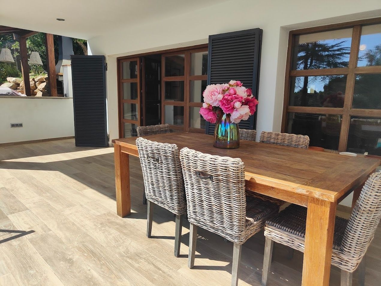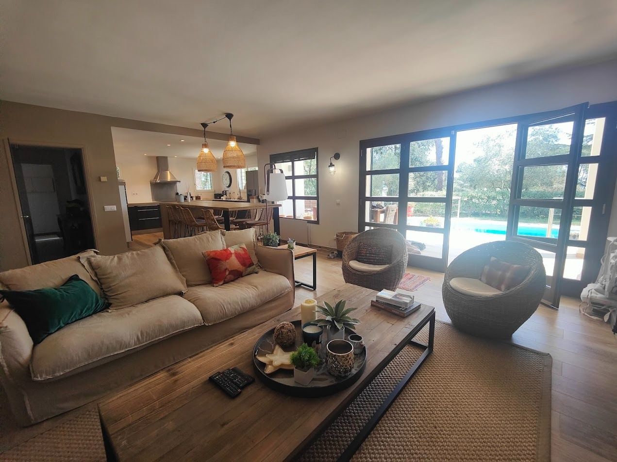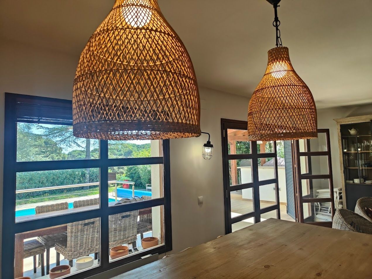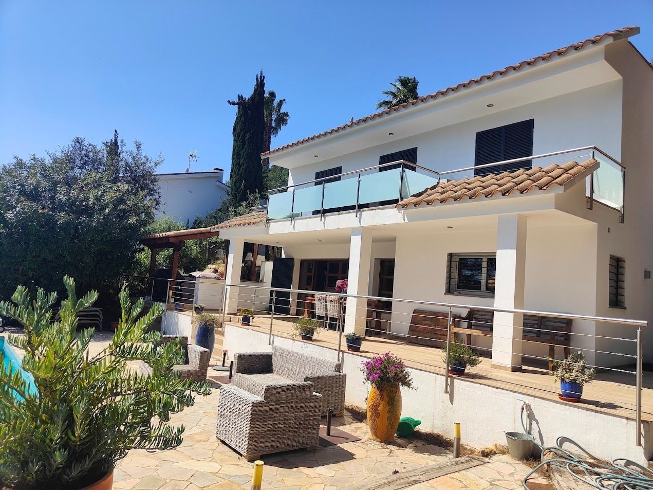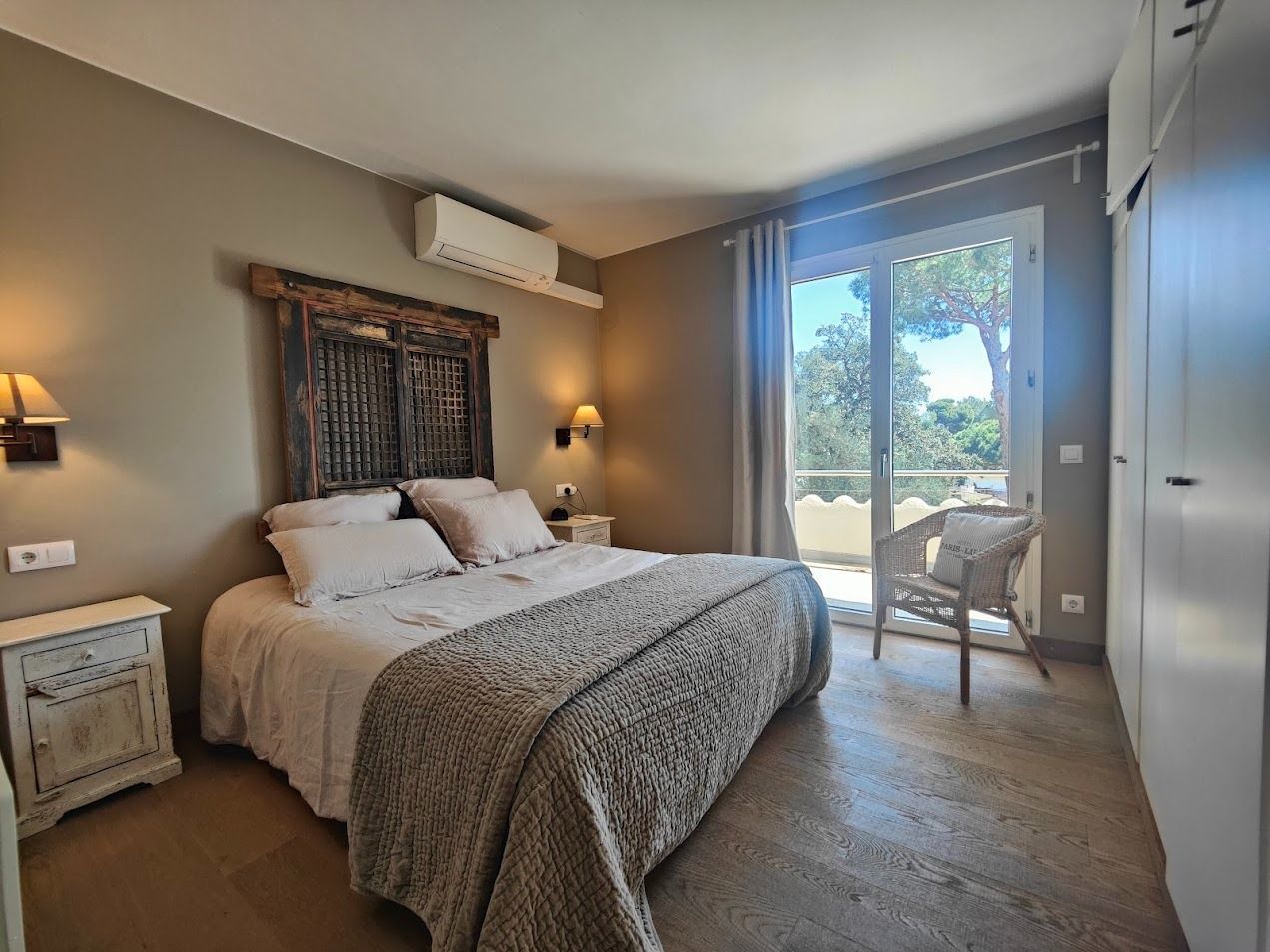 Just 800 metres from the beach and 2 kilometres from the lively centre of Platja d’Aro, this beautiful detached villa is situated in the exclusive residential area of Mas Treumal. Here you can enjoy the perfect balance between peace, privacy and the vibrant life on the Costa Brava. The villa is situated in a dead-end street in a green, quiet area and offers complete privacy. Thanks to its location, you can easily walk to the beach or cycle to the centre. The house has been completely renovated in recent years and has also been expanded with a separate guest room with private bathroom on the ground floor and a newly constructed swimming pool (10 x 5 metres, approx. 2015). This stylish villa has a total built-up area of 257 m² and is situated on a generous plot of 1,451 m². Ground floor: - Representative entrance - Spacious and bright living/dining room with wood stove and direct access to the covered terrace - Luxurious open kitchen, fully equipped with modern built-in appliances - Guest toilet First floor: - Master bedroom with bathroom en suite - Two comfortable double bedrooms - Modern shared bathroom All bedrooms on the upper floor give access to a terrace with a beautiful view of the green surroundings of the urbanization. Adjacent to the house is a separate guest bedroom with private bathroom and private entrance - ideal for guests. You also have a spacious separate storage room. An absolute eye-catcher is the cozy covered barbecue area with bar - the perfect place to spend long summer evenings with family or friends. Special features: - Aluminum frames with double glazing - Aluminum shutters for windows and doors - Built-in wardrobes in the bedrooms - Air conditioning in the bedrooms - Electric radiators - Automatic garden irrigation - Recently renovated infrastructure in the area (including roads and sewer) This villa combines Mediterranean charm with modern living comfort and a fantastic location - an ideal (second) home under the Spanish sun. Taxes, notary fees and registration costs are not included in the sales price.[IW]