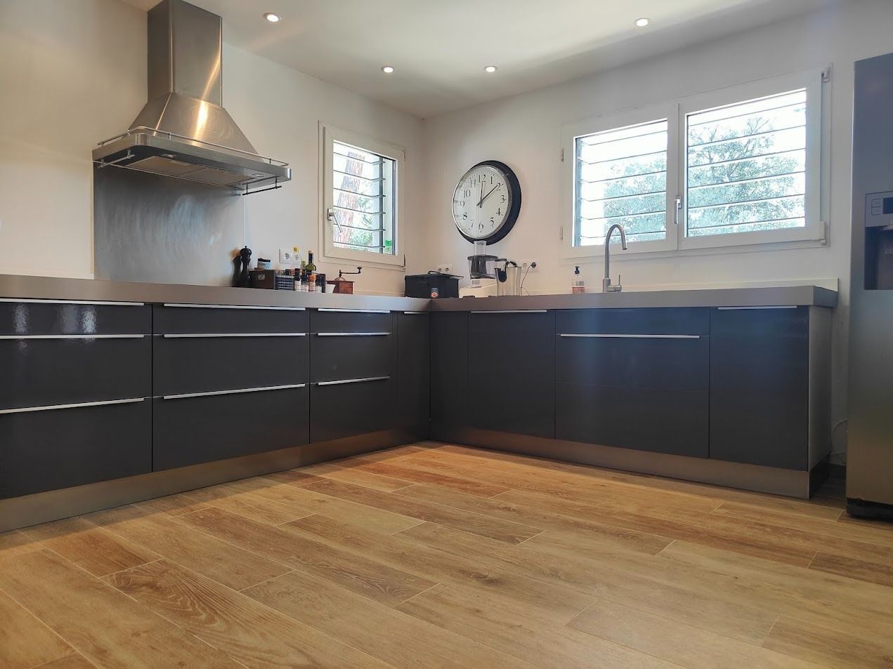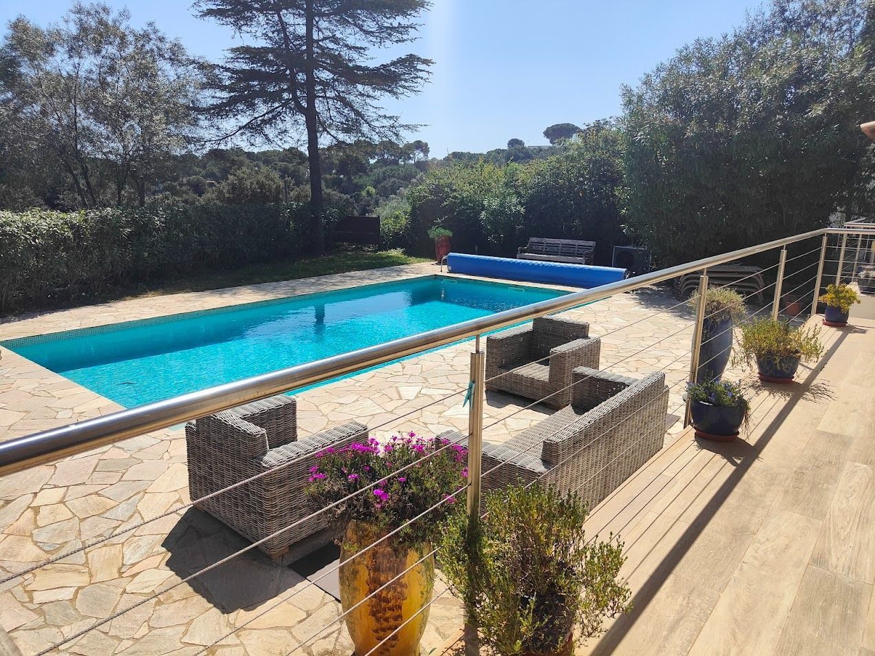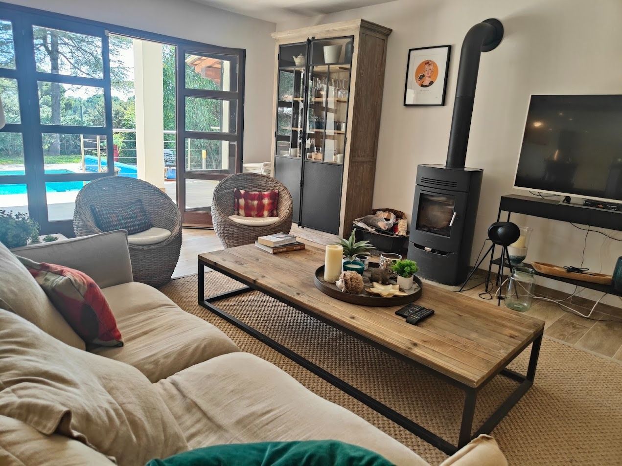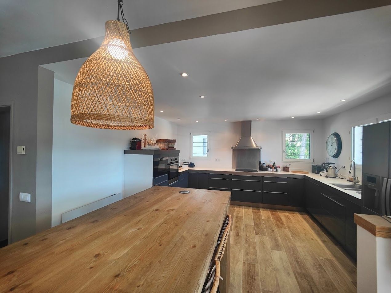 Just 800 metres from the beach and 2 kilometres from the lively centre of Platja d’Aro, this beautiful detached villa is situated in the exclusive residential area of Mas Treumal. Here you can enjoy the perfect balance between peace, privacy and the vibrant life on the Costa Brava. The villa is situated in a dead-end street in a green, quiet area and offers complete privacy. Thanks to its location, you can easily walk to the beach or cycle to the centre. The house has been completely renovated in recent years and has also been expanded with a separate guest room with private bathroom on the ground floor and a newly constructed swimming pool (10 x 5 metres, approx. 2015). This stylish villa has a total built-up area of 257 m² and is situated on a generous plot of 1,451 m². Ground floor: - Representative entrance - Spacious and bright living/dining room with wood stove and direct access to the covered terrace - Luxurious open kitchen, fully equipped with modern built-in appliances - Guest toilet First floor: - Master bedroom with bathroom en suite - Two comfortable double bedrooms - Modern shared bathroom All bedrooms on the upper floor give access to a terrace with a beautiful view of the green surroundings of the urbanization. Adjacent to the house is a separate guest bedroom with private bathroom and private entrance - ideal for guests. You also have a spacious separate storage room. An absolute eye-catcher is the cozy covered barbecue area with bar - the perfect place to spend long summer evenings with family or friends. Special features: - Aluminum frames with double glazing - Aluminum shutters for windows and doors - Built-in wardrobes in the bedrooms - Air conditioning in the bedrooms - Electric radiators - Automatic garden irrigation - Recently renovated infrastructure in the area (including roads and sewer) This villa combines Mediterranean charm with modern living comfort and a fantastic location - an ideal (second) home under the Spanish sun. Taxes, notary fees and registration costs are not included in the sales price.[IW]