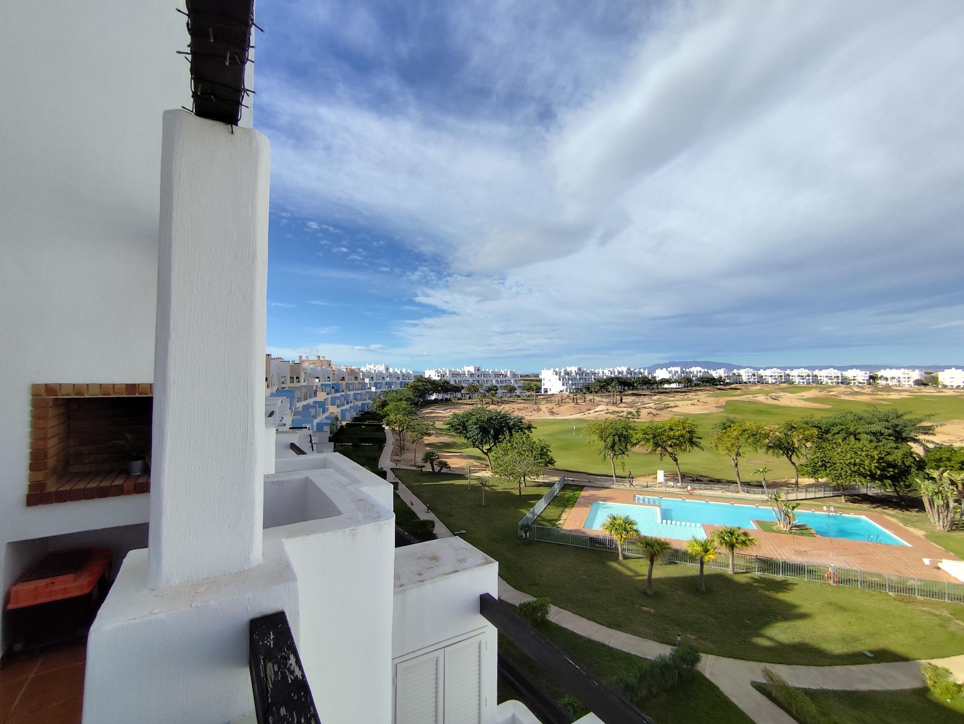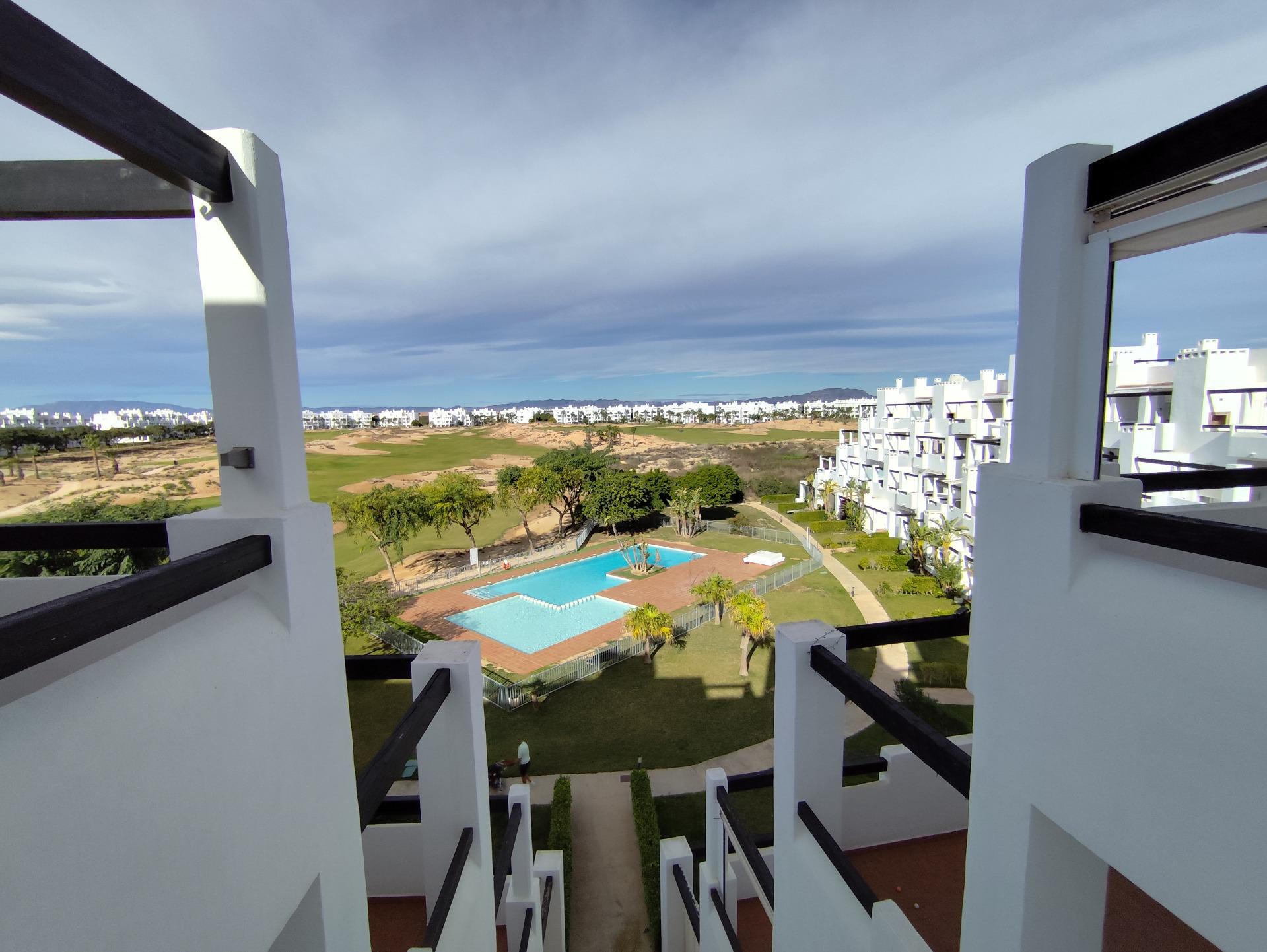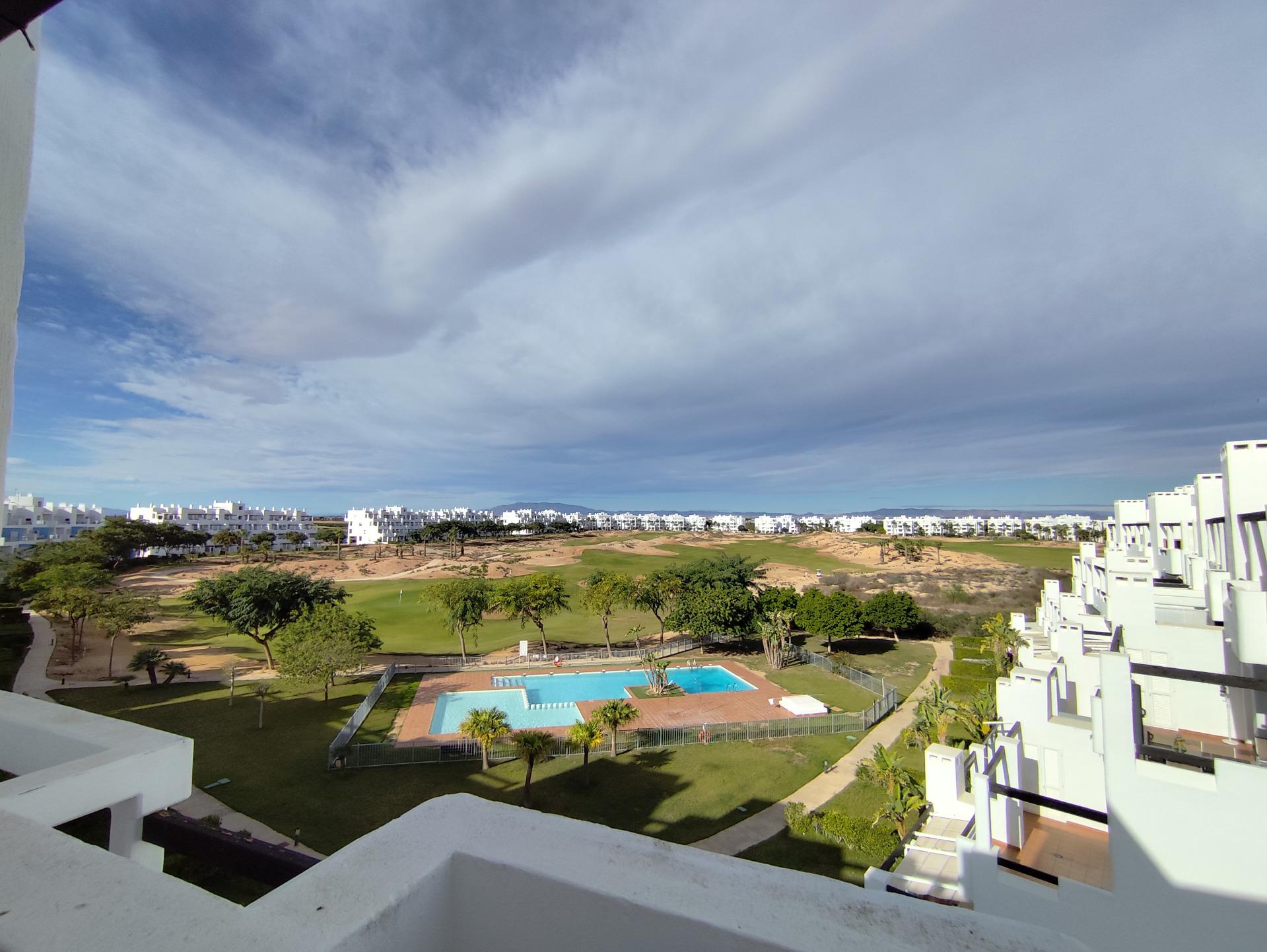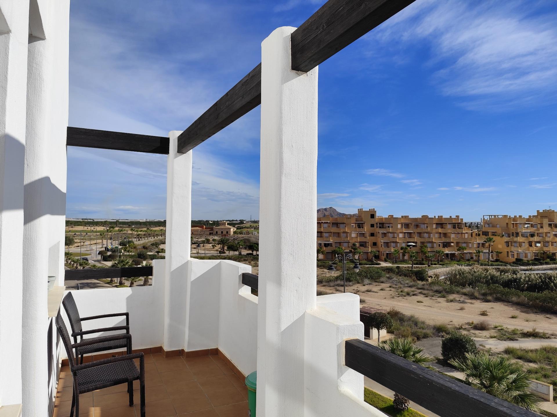 Top floor, 2 Bed Corner apartment in Phase 2 of the Golf Resort of Las Terrazas De La Torre. This property has stunning over the golf course ! The kitchen is fully fitted with all white goods, and comes furnished throughout. There is also Full AC throughout the apartment. In between the 2 bedrooms there is a nice family bathroom. The bathroom has been updated and has a walk in shower. The terras is spacious and offers stunning views. The apartment is sold partly furnished. The apartment is located only a few minutes walk to the Resorts Clubhouse, Restaurant and Supermarket. There are 16 communual pools More businesses will be opening in the commercial center, which makes it the perfect time to buy on this resort. This complex has a single entrance and its facilities are fully fenced, with 24 hour security for the safety of its residents. If you are a golf fan you will be able to play on a 18 hole golf course created by Jack Nicklaus, whose semi-desert design blends in with the natural landscape, thus demonstrating a high degree of efficiency of natural resources. Offering fantastic value for money, phenomenal security and a superb location, Las Terrazas de la Torre is a wonderful resort that offers buyers the opportunity to find a beautiful home at an excellent price. It is just a short drive, 15 minutes, from the Mar Menor and Mediterranean coastlines, plus Murcia international airport and 20 minutes to Cartagena and Murcia.