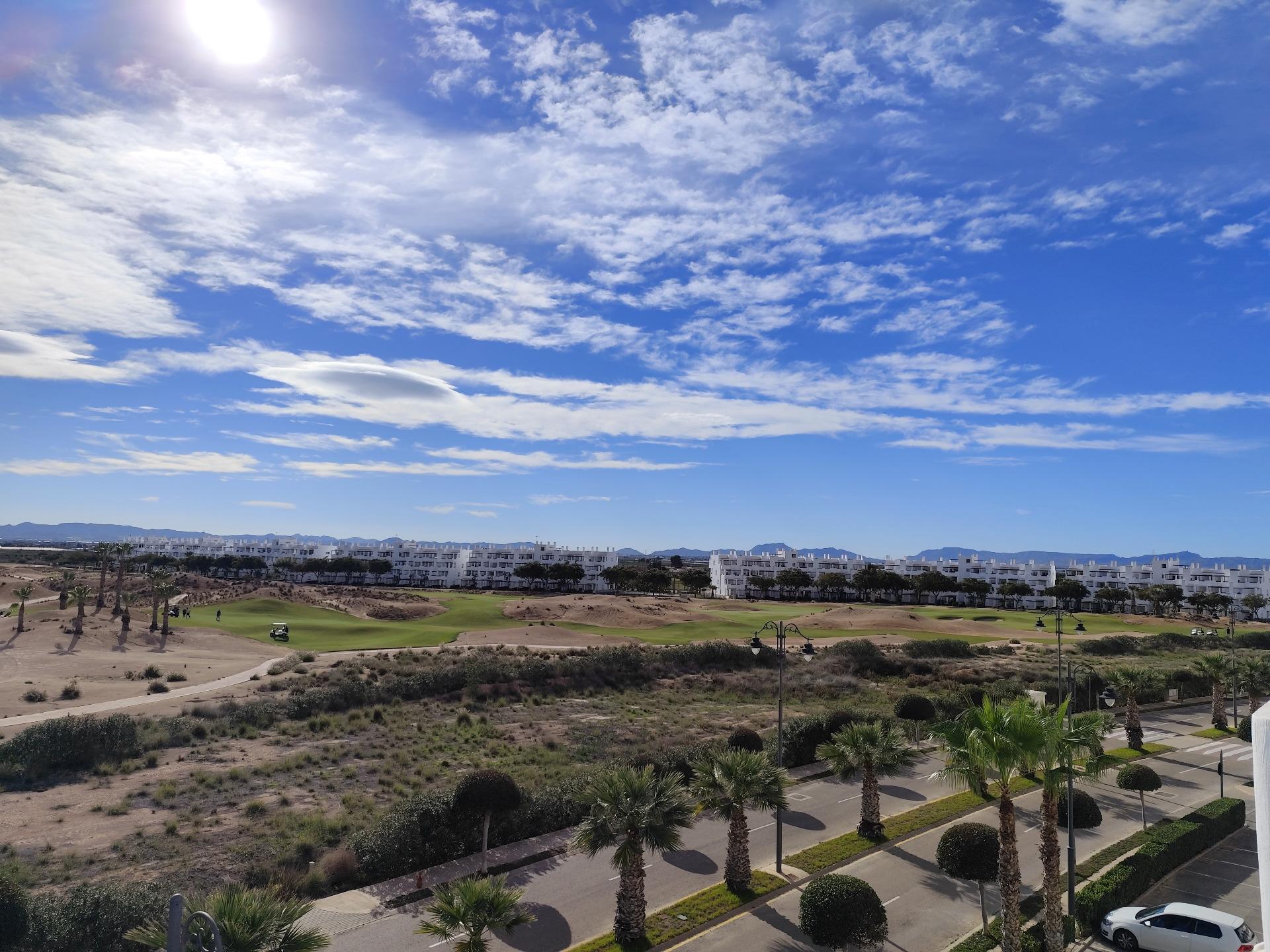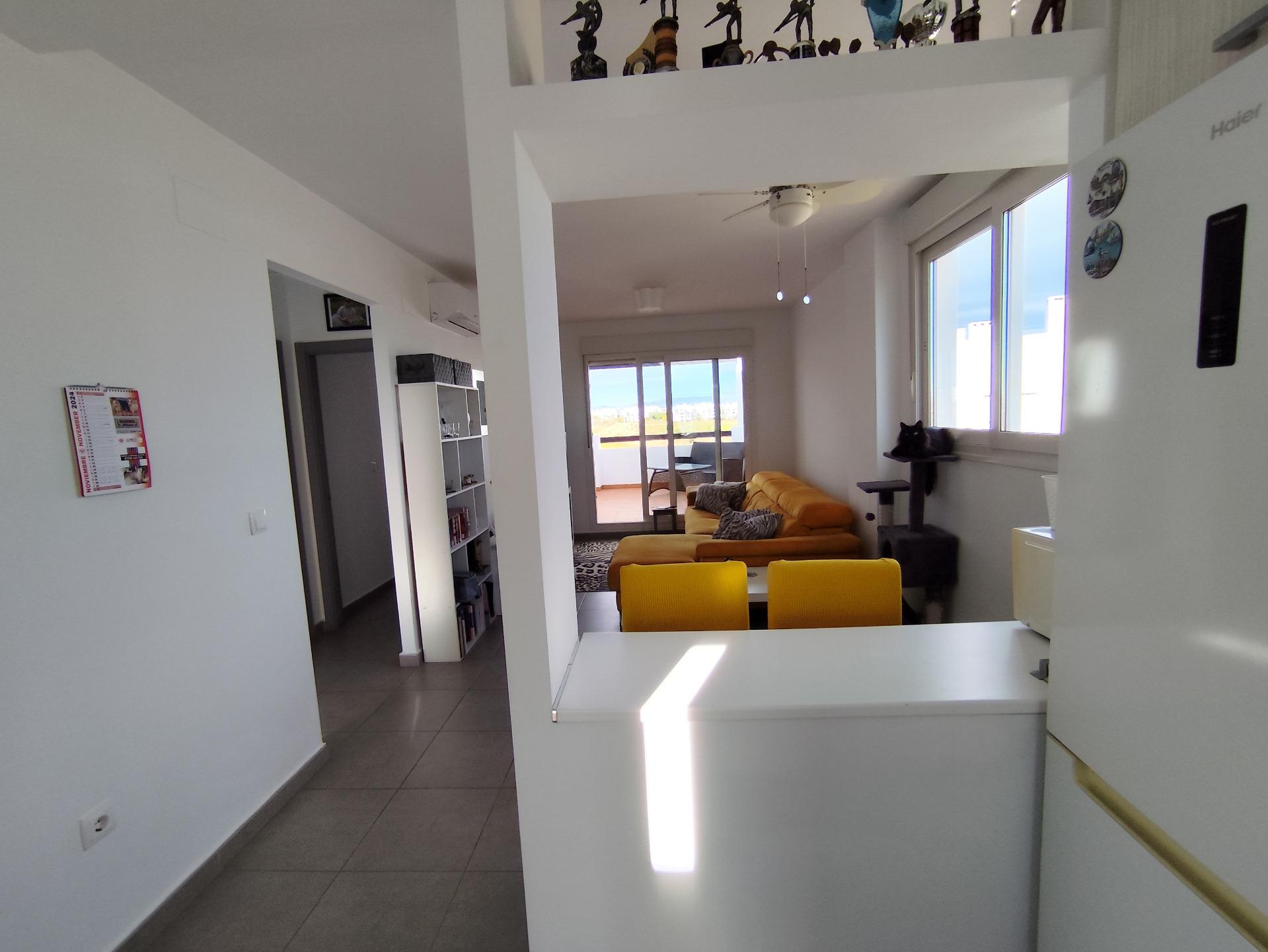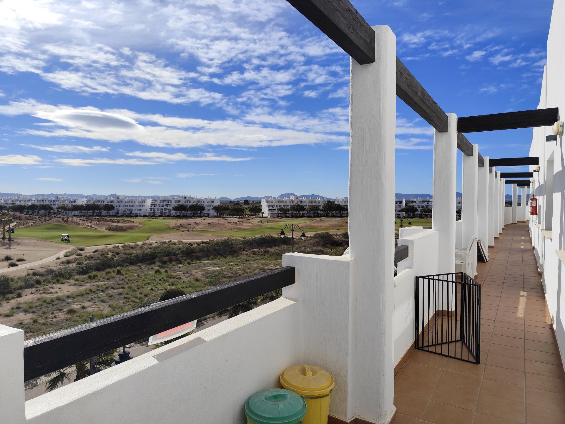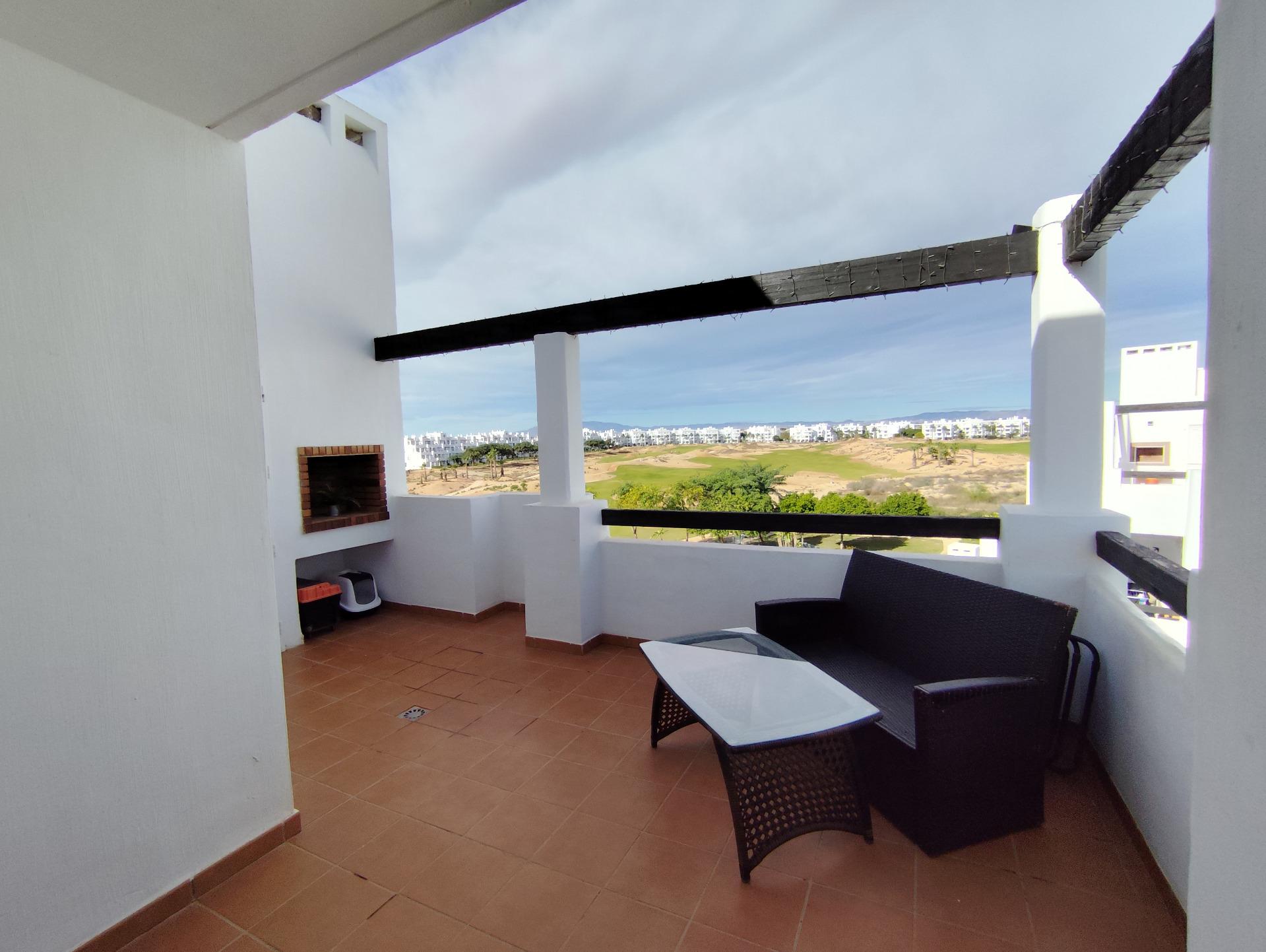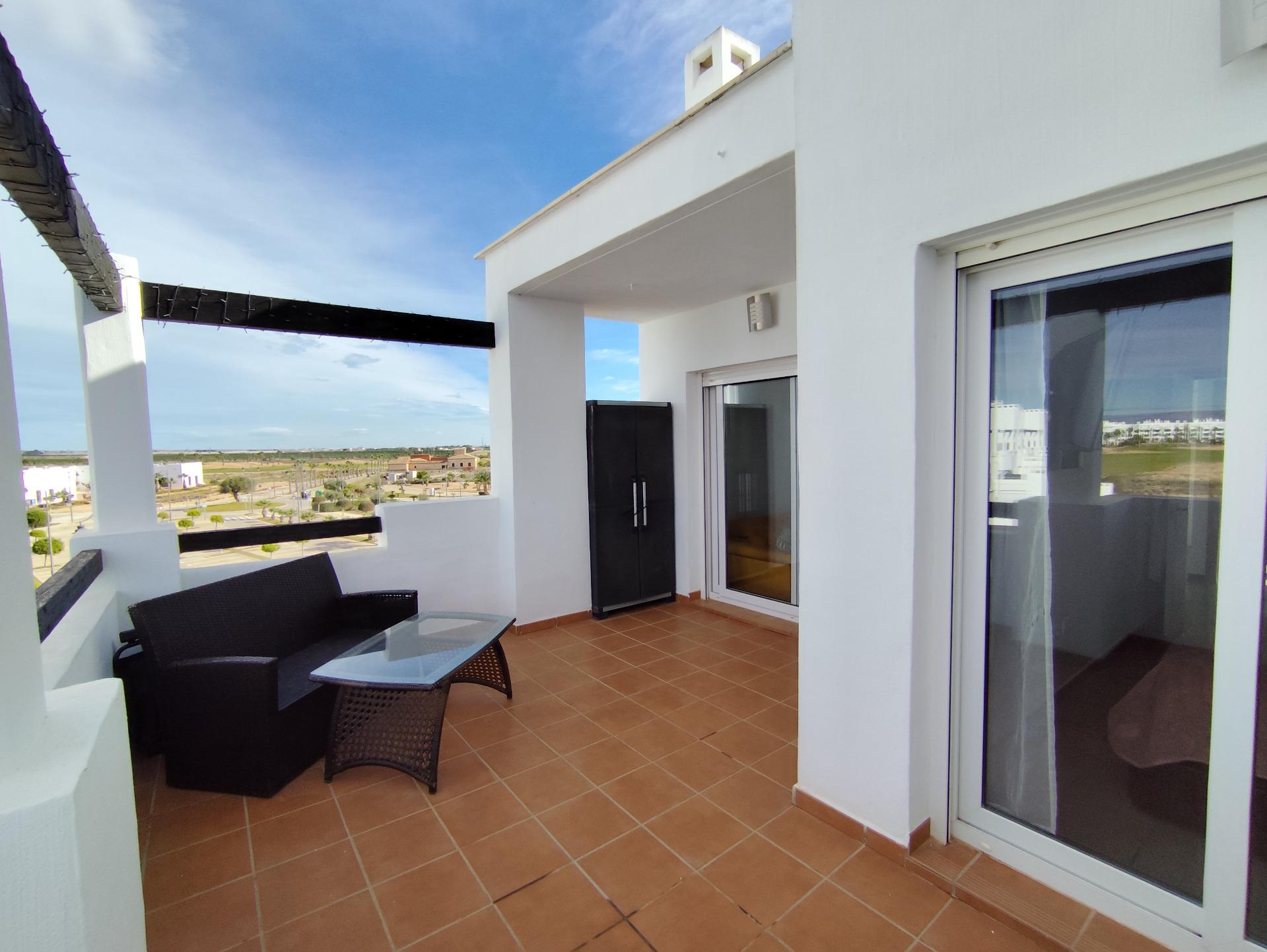 Top floor, 2 Bed Corner apartment in Phase 2 of the Golf Resort of Las Terrazas De La Torre. This property has stunning over the golf course ! The kitchen is fully fitted with all white goods, and comes furnished throughout. There is also Full AC throughout the apartment. In between the 2 bedrooms there is a nice family bathroom. The bathroom has been updated and has a walk in shower. The terras is spacious and offers stunning views. The apartment is sold partly furnished. The apartment is located only a few minutes walk to the Resorts Clubhouse, Restaurant and Supermarket. There are 16 communual pools More businesses will be opening in the commercial center, which makes it the perfect time to buy on this resort. This complex has a single entrance and its facilities are fully fenced, with 24 hour security for the safety of its residents. If you are a golf fan you will be able to play on a 18 hole golf course created by Jack Nicklaus, whose semi-desert design blends in with the natural landscape, thus demonstrating a high degree of efficiency of natural resources. Offering fantastic value for money, phenomenal security and a superb location, Las Terrazas de la Torre is a wonderful resort that offers buyers the opportunity to find a beautiful home at an excellent price. It is just a short drive, 15 minutes, from the Mar Menor and Mediterranean coastlines, plus Murcia international airport and 20 minutes to Cartagena and Murcia.