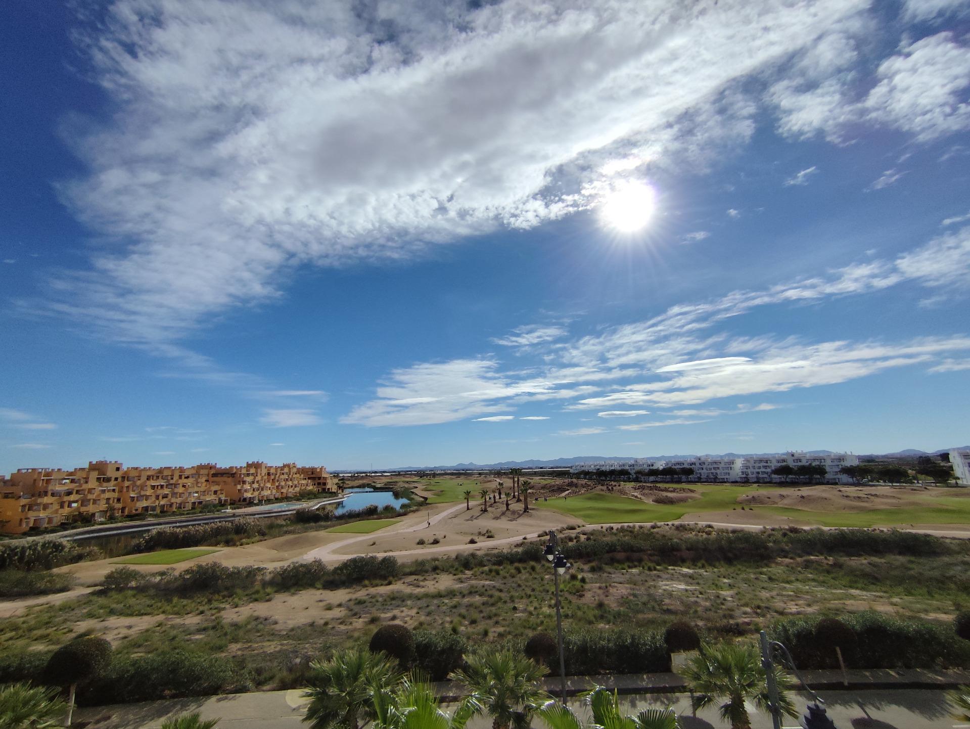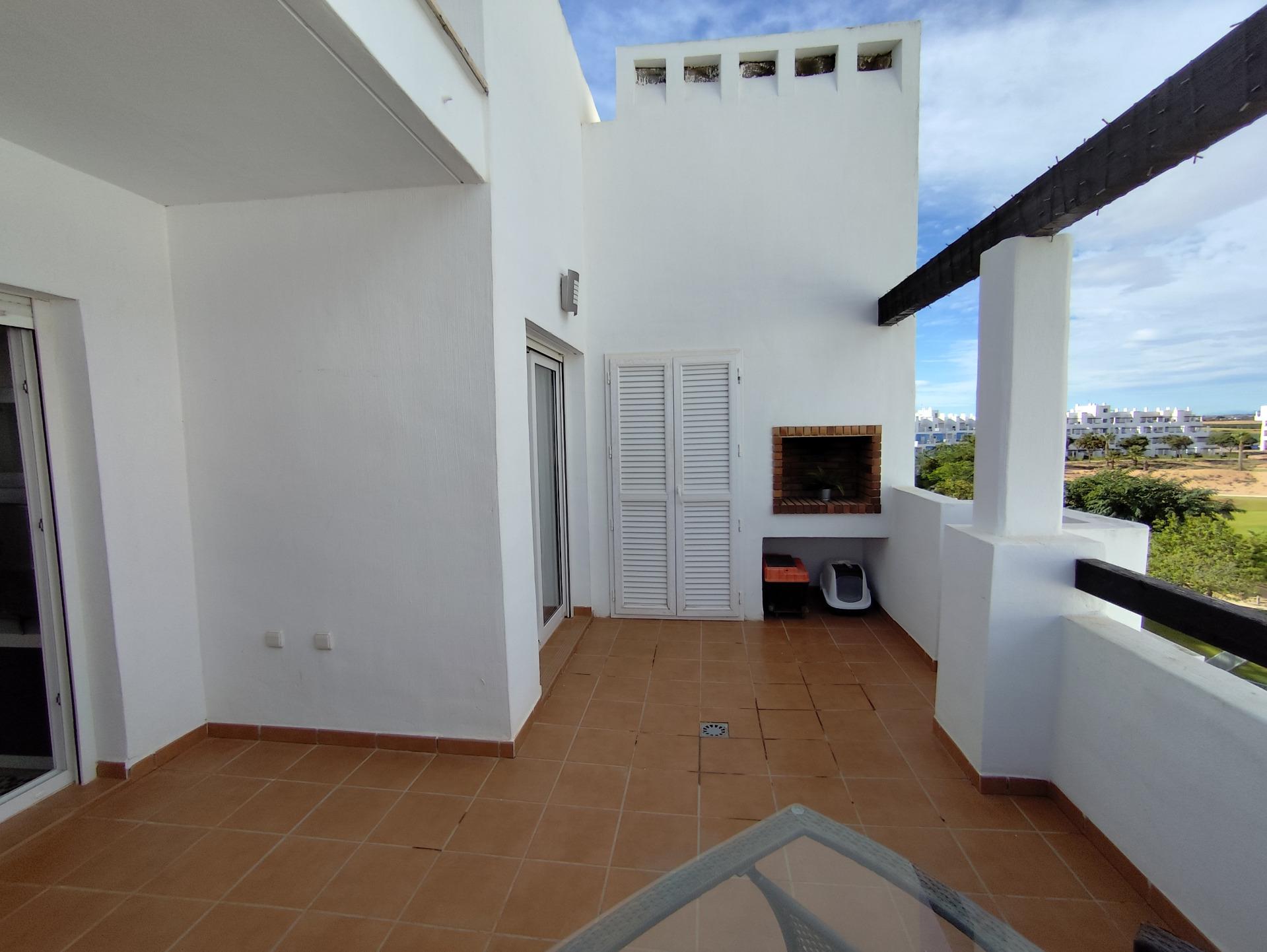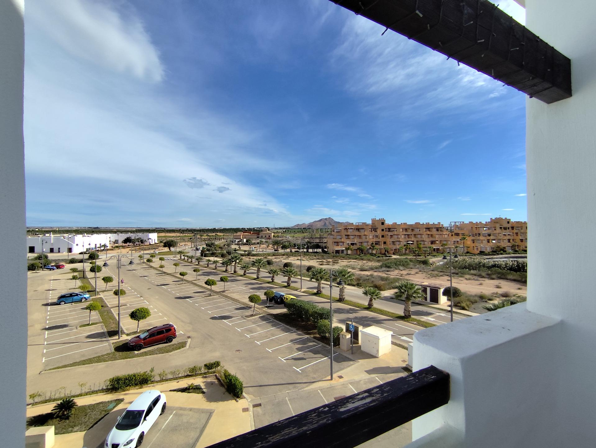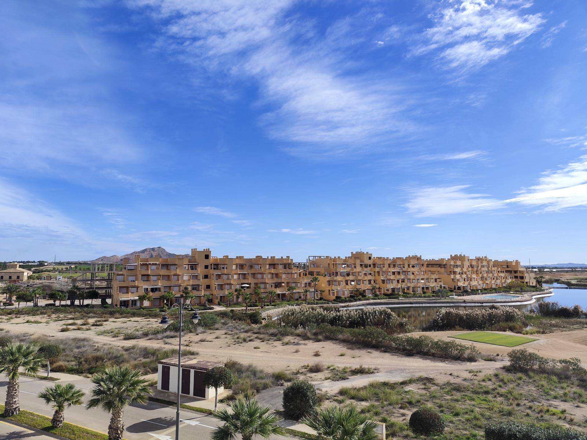 Top floor, 2 Bed Corner apartment in Phase 2 of the Golf Resort of Las Terrazas De La Torre. This property has stunning over the golf course ! The kitchen is fully fitted with all white goods, and comes furnished throughout. There is also Full AC throughout the apartment. In between the 2 bedrooms there is a nice family bathroom. The bathroom has been updated and has a walk in shower. The terras is spacious and offers stunning views. The apartment is sold partly furnished. The apartment is located only a few minutes walk to the Resorts Clubhouse, Restaurant and Supermarket. There are 16 communual pools More businesses will be opening in the commercial center, which makes it the perfect time to buy on this resort. This complex has a single entrance and its facilities are fully fenced, with 24 hour security for the safety of its residents. If you are a golf fan you will be able to play on a 18 hole golf course created by Jack Nicklaus, whose semi-desert design blends in with the natural landscape, thus demonstrating a high degree of efficiency of natural resources. Offering fantastic value for money, phenomenal security and a superb location, Las Terrazas de la Torre is a wonderful resort that offers buyers the opportunity to find a beautiful home at an excellent price. It is just a short drive, 15 minutes, from the Mar Menor and Mediterranean coastlines, plus Murcia international airport and 20 minutes to Cartagena and Murcia.