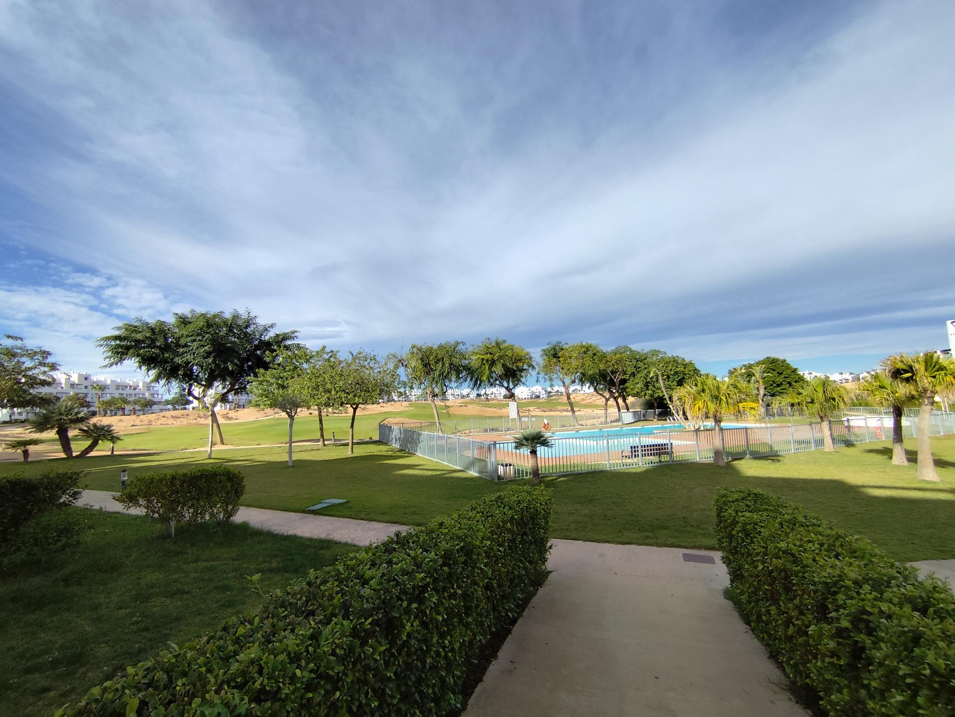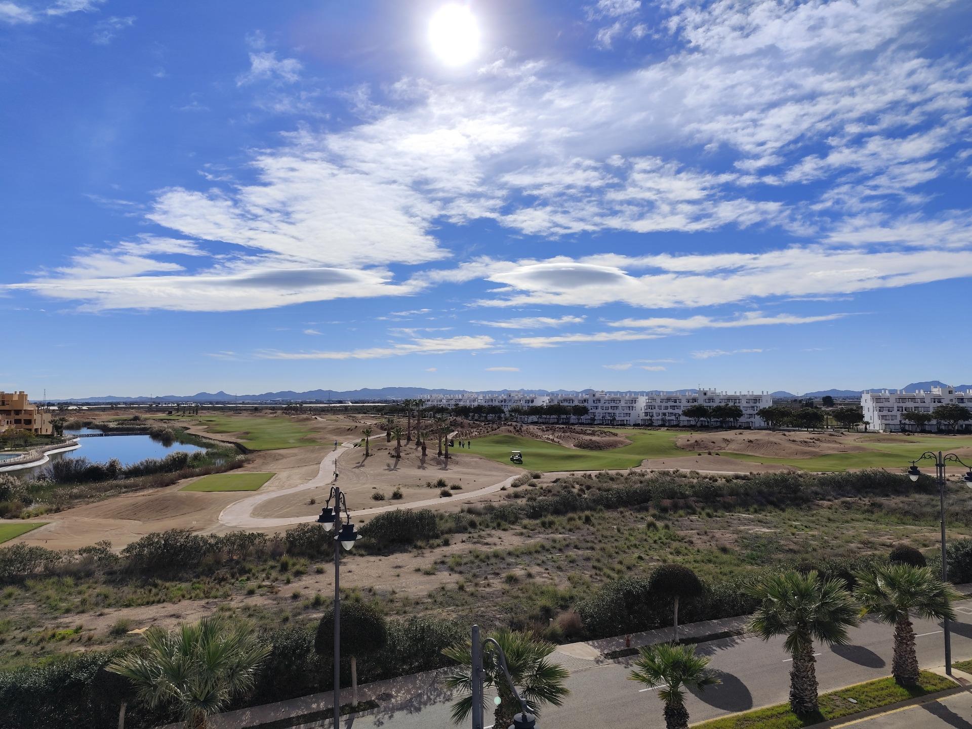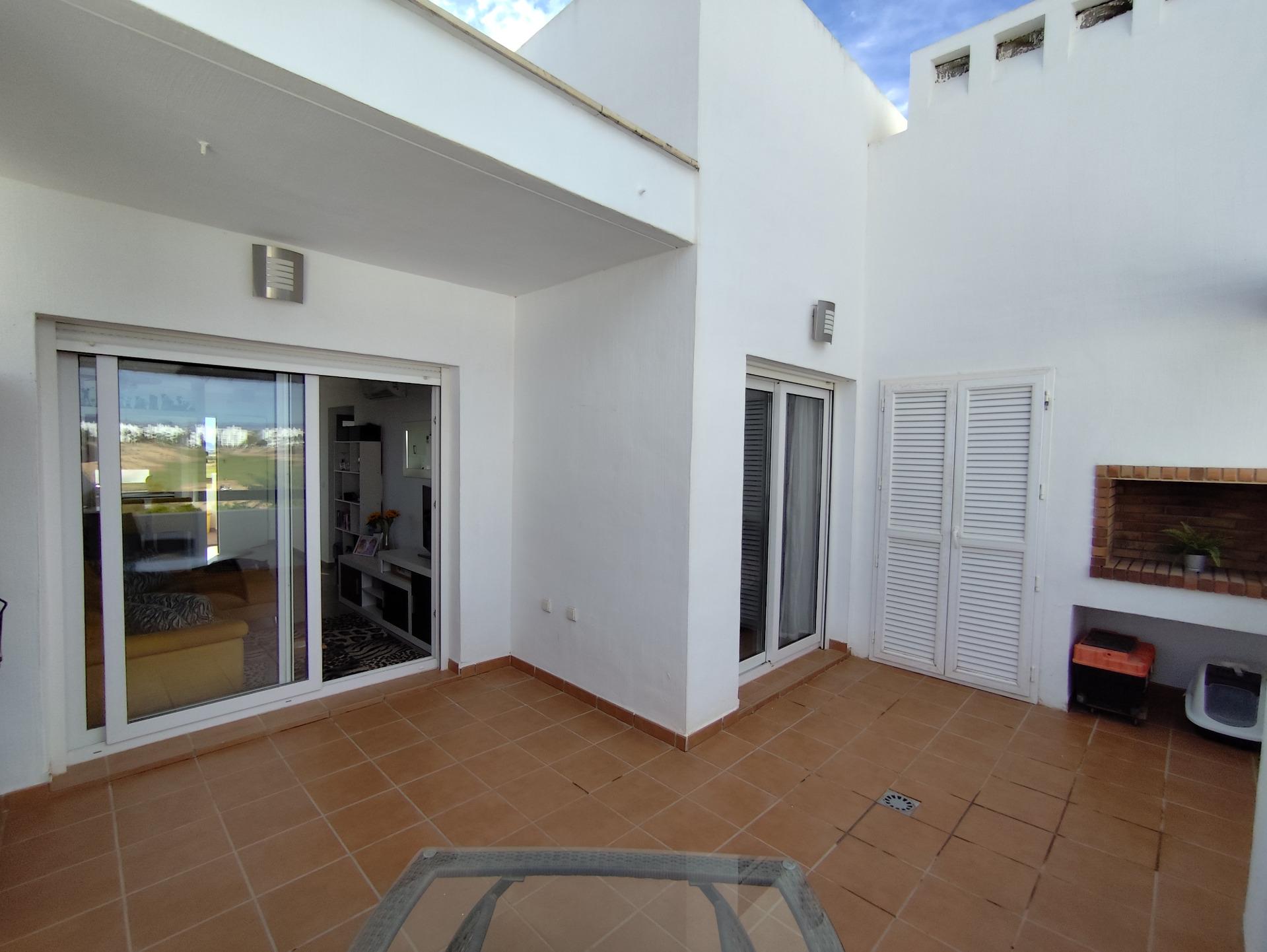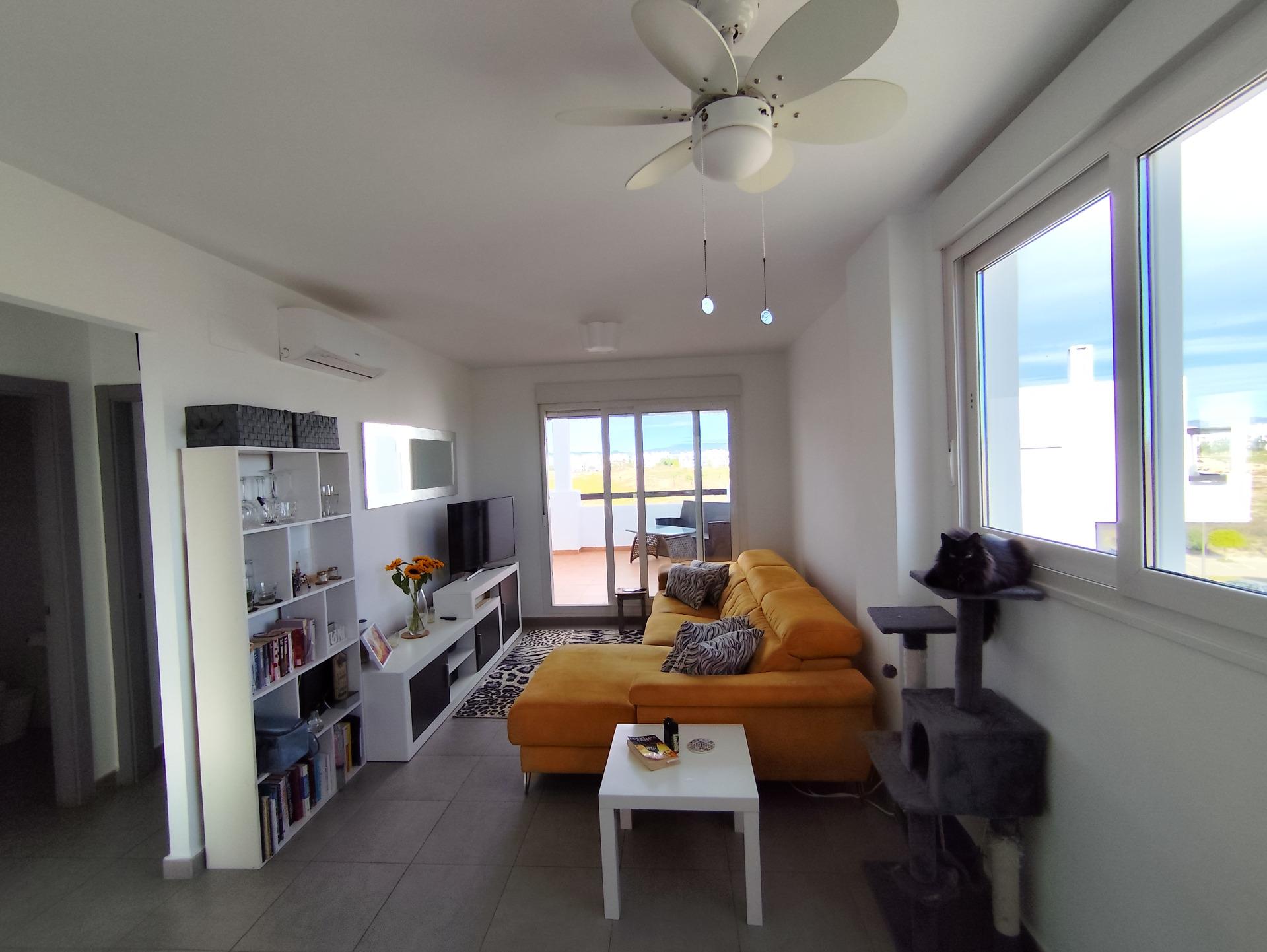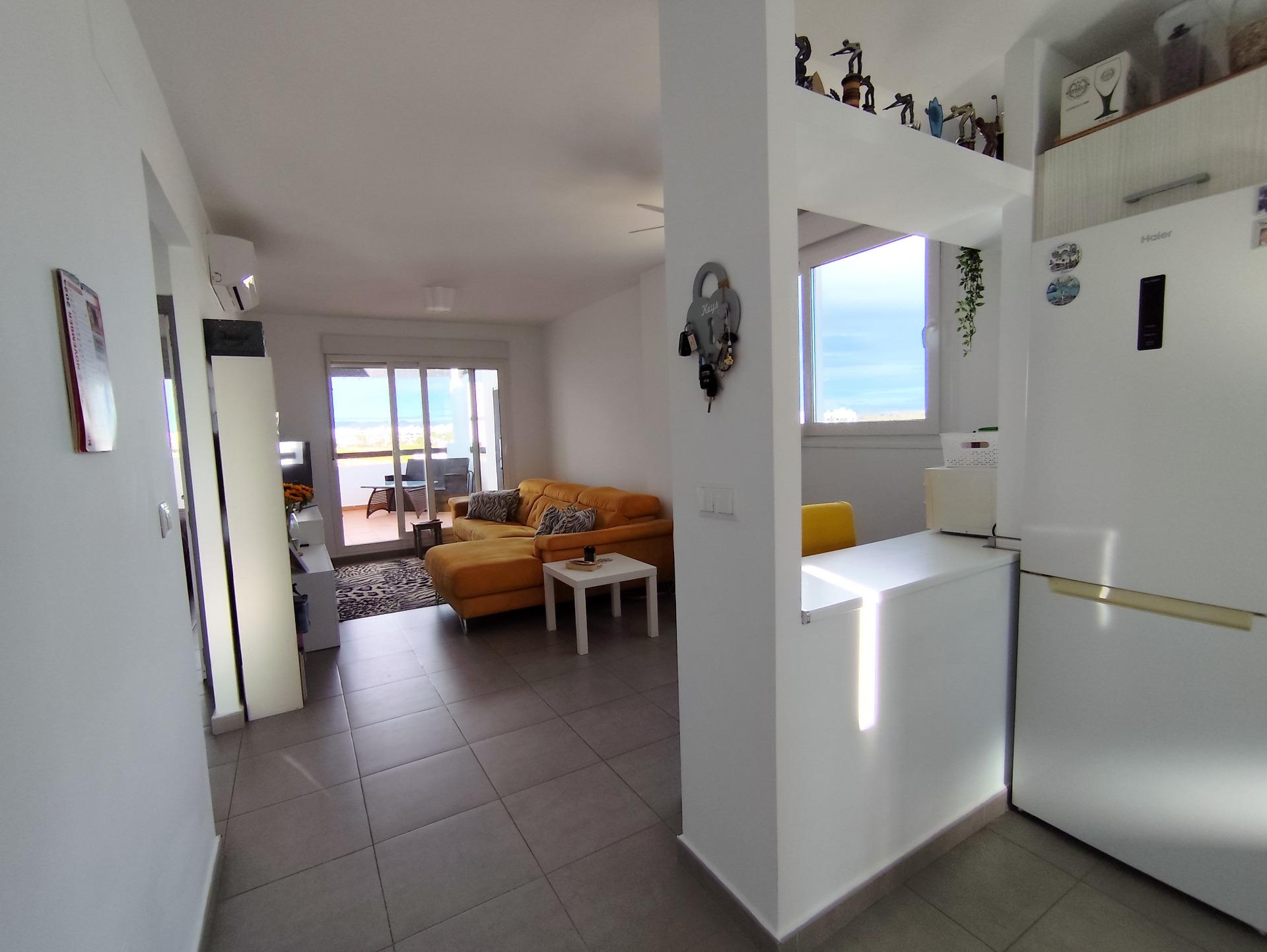 Top floor, 2 Bed Corner apartment in Phase 2 of the Golf Resort of Las Terrazas De La Torre. This property has stunning over the golf course ! The kitchen is fully fitted with all white goods, and comes furnished throughout. There is also Full AC throughout the apartment. In between the 2 bedrooms there is a nice family bathroom. The bathroom has been updated and has a walk in shower. The terras is spacious and offers stunning views. The apartment is sold partly furnished. The apartment is located only a few minutes walk to the Resorts Clubhouse, Restaurant and Supermarket. There are 16 communual pools More businesses will be opening in the commercial center, which makes it the perfect time to buy on this resort. This complex has a single entrance and its facilities are fully fenced, with 24 hour security for the safety of its residents. If you are a golf fan you will be able to play on a 18 hole golf course created by Jack Nicklaus, whose semi-desert design blends in with the natural landscape, thus demonstrating a high degree of efficiency of natural resources. Offering fantastic value for money, phenomenal security and a superb location, Las Terrazas de la Torre is a wonderful resort that offers buyers the opportunity to find a beautiful home at an excellent price. It is just a short drive, 15 minutes, from the Mar Menor and Mediterranean coastlines, plus Murcia international airport and 20 minutes to Cartagena and Murcia.