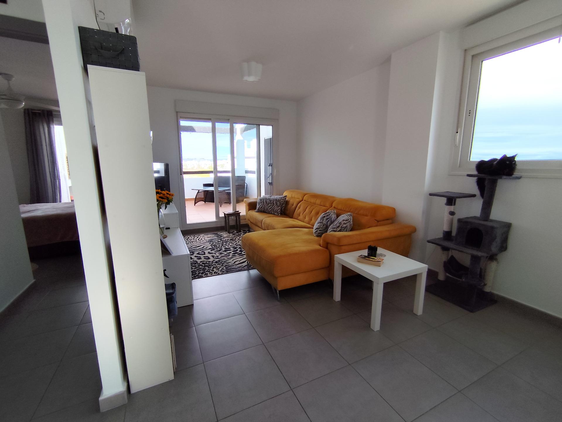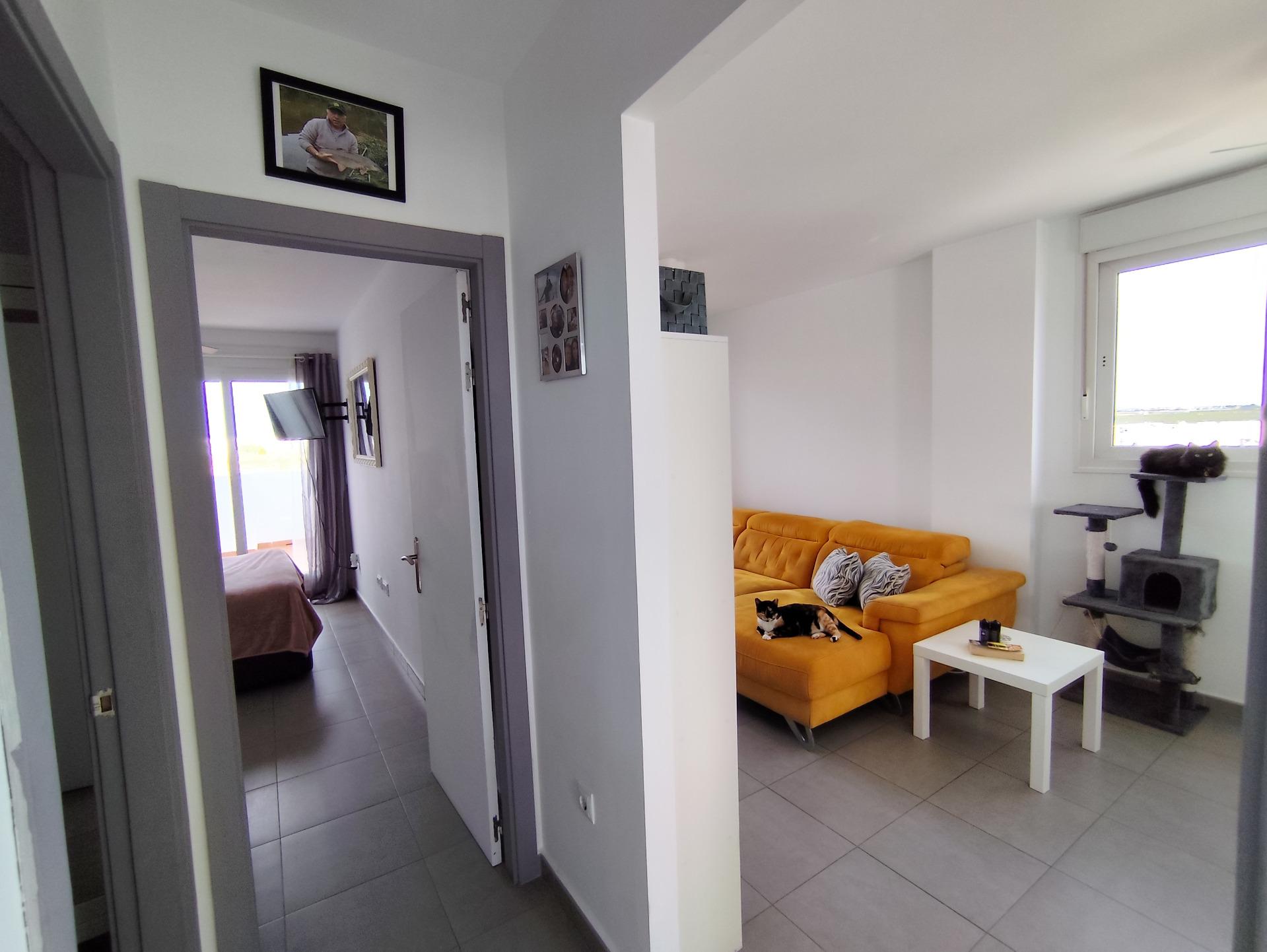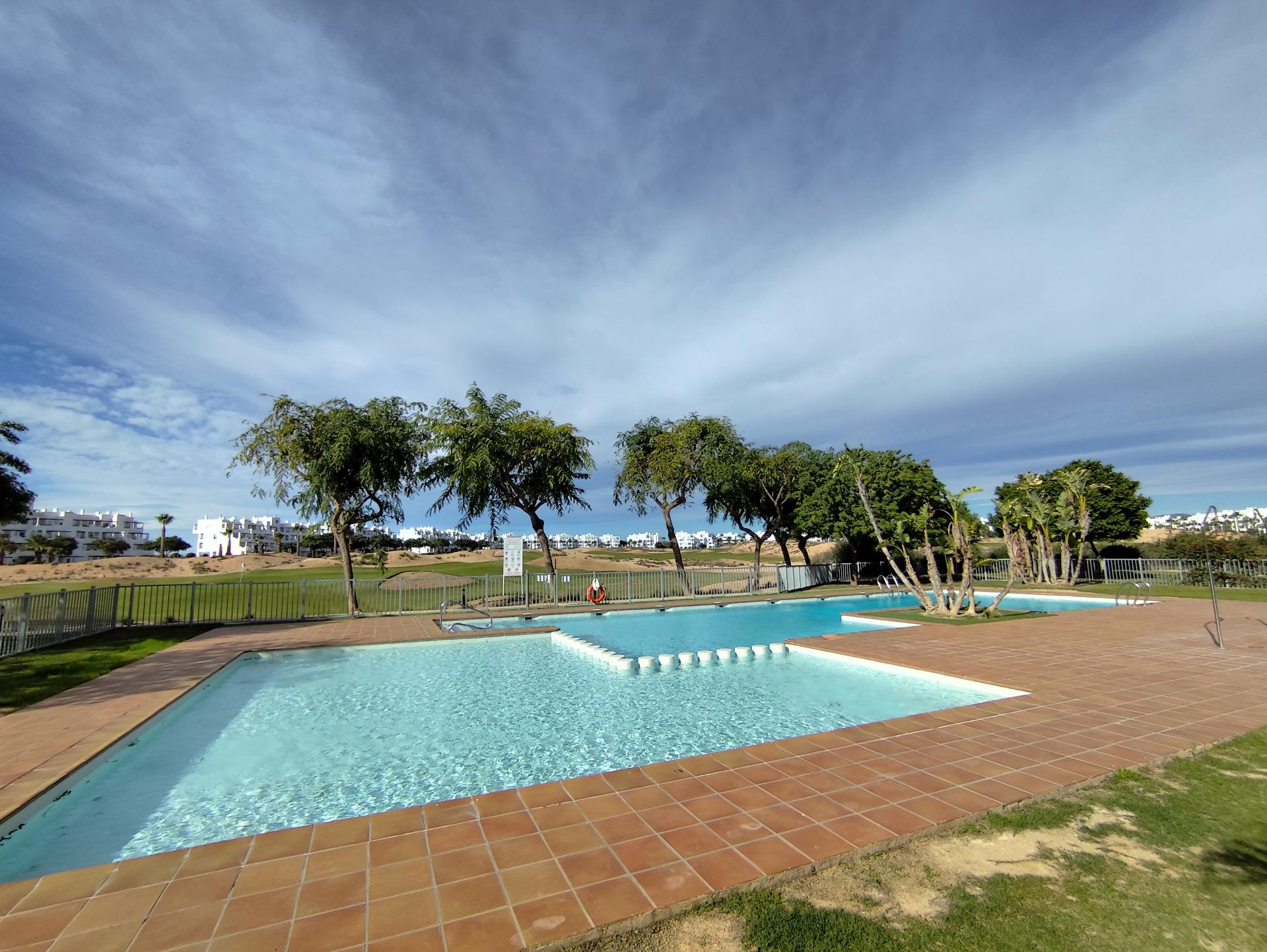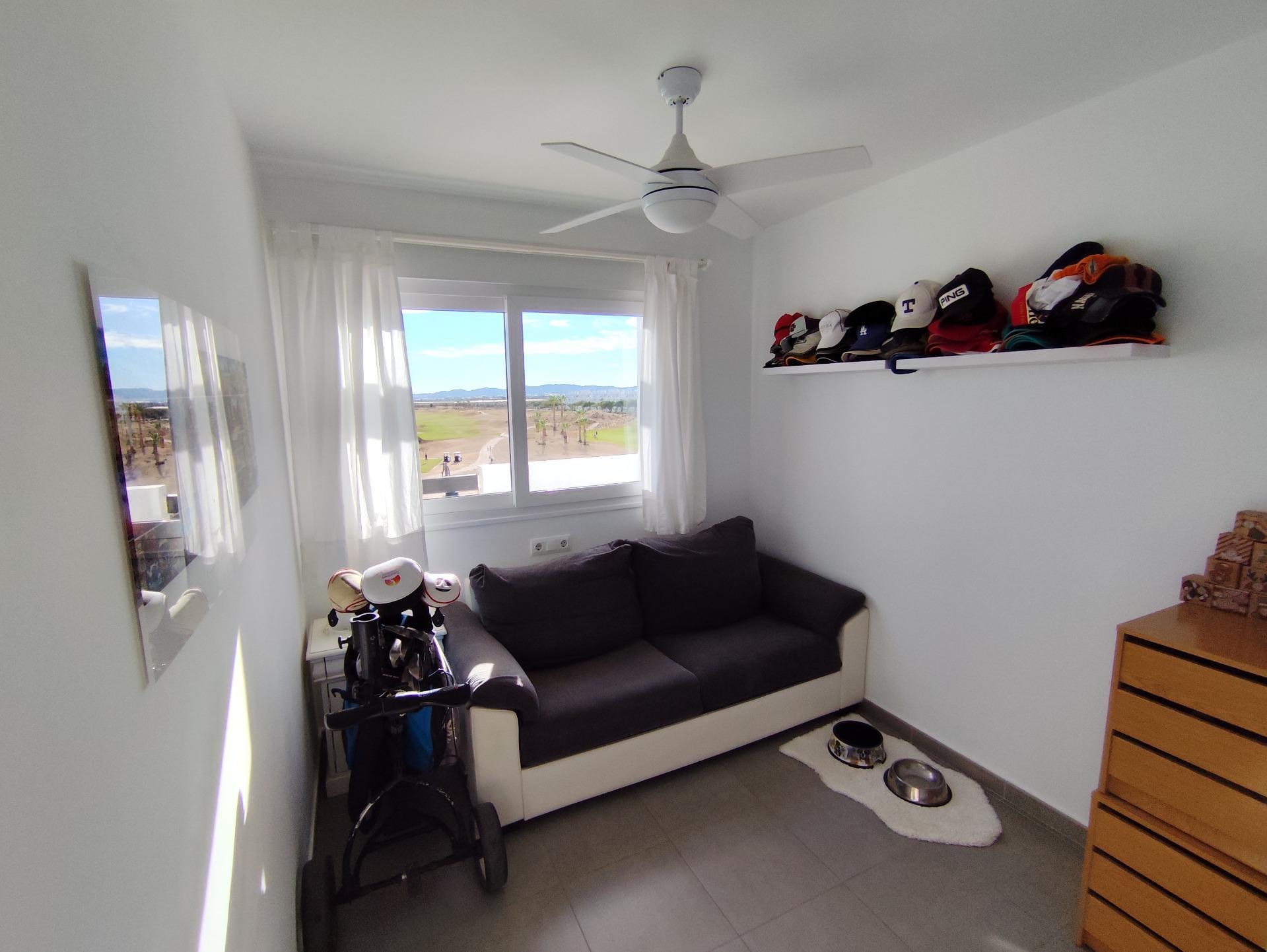 Top floor, 2 Bed Corner apartment in Phase 2 of the Golf Resort of Las Terrazas De La Torre. This property has stunning over the golf course ! The kitchen is fully fitted with all white goods, and comes furnished throughout. There is also Full AC throughout the apartment. In between the 2 bedrooms there is a nice family bathroom. The bathroom has been updated and has a walk in shower. The terras is spacious and offers stunning views. The apartment is sold partly furnished. The apartment is located only a few minutes walk to the Resorts Clubhouse, Restaurant and Supermarket. There are 16 communual pools More businesses will be opening in the commercial center, which makes it the perfect time to buy on this resort. This complex has a single entrance and its facilities are fully fenced, with 24 hour security for the safety of its residents. If you are a golf fan you will be able to play on a 18 hole golf course created by Jack Nicklaus, whose semi-desert design blends in with the natural landscape, thus demonstrating a high degree of efficiency of natural resources. Offering fantastic value for money, phenomenal security and a superb location, Las Terrazas de la Torre is a wonderful resort that offers buyers the opportunity to find a beautiful home at an excellent price. It is just a short drive, 15 minutes, from the Mar Menor and Mediterranean coastlines, plus Murcia international airport and 20 minutes to Cartagena and Murcia.