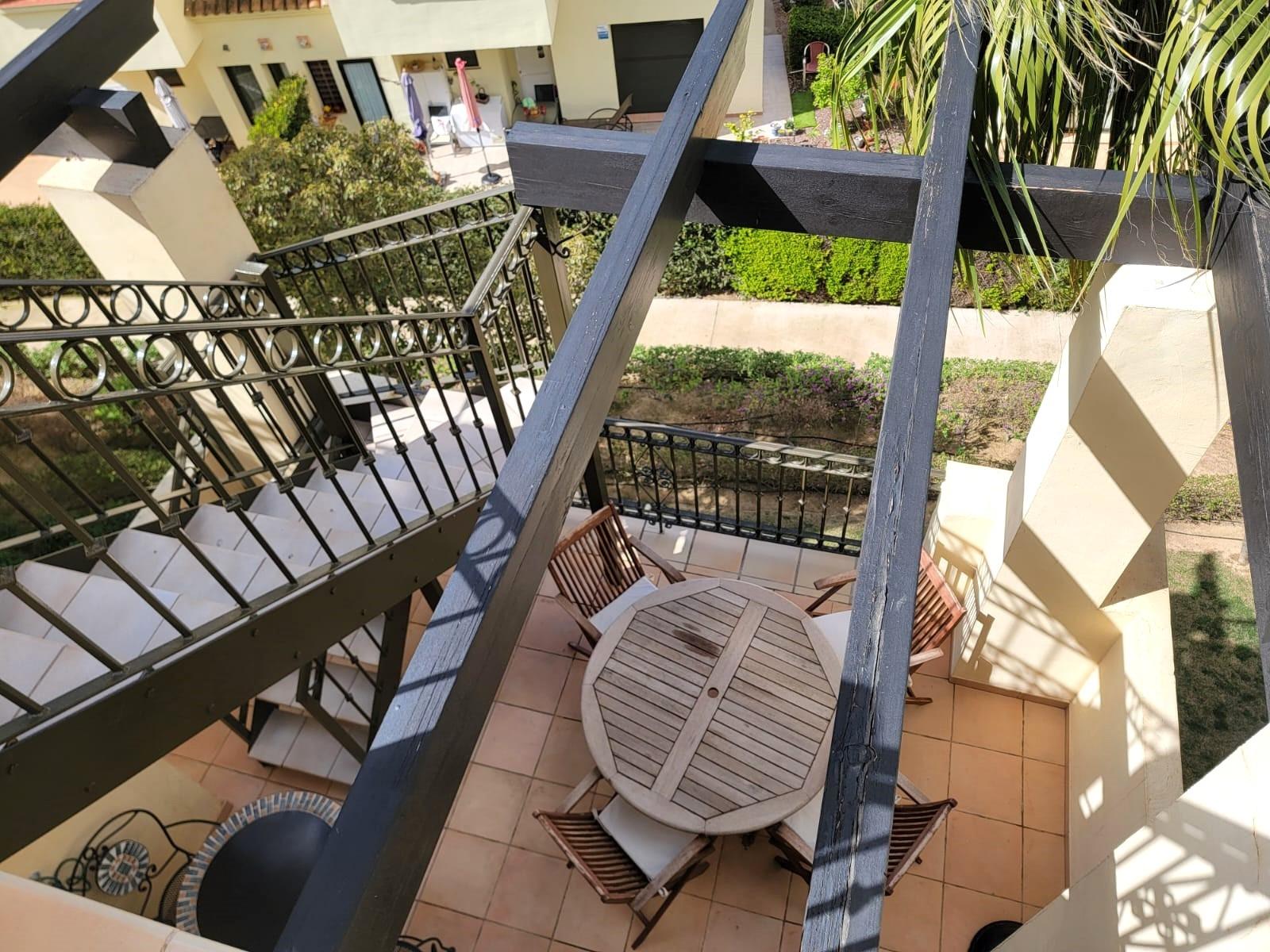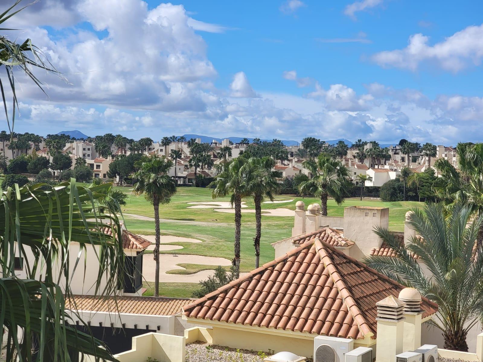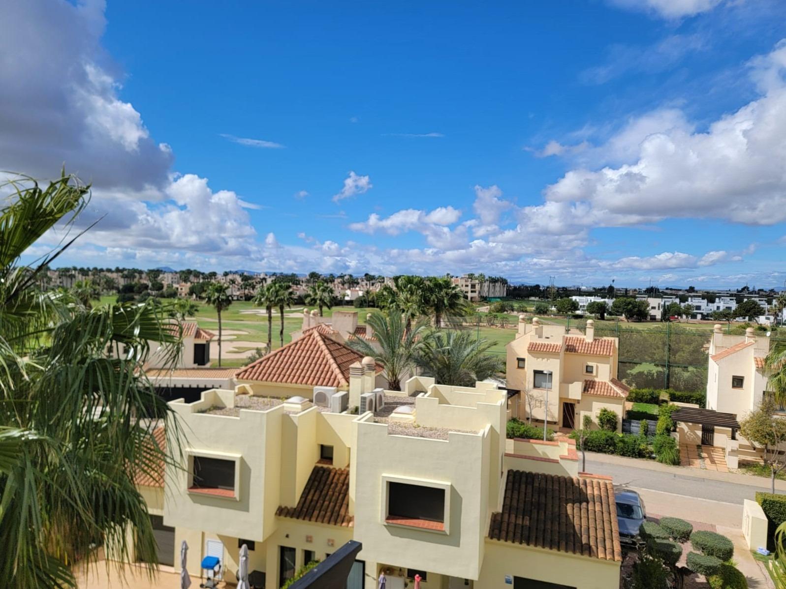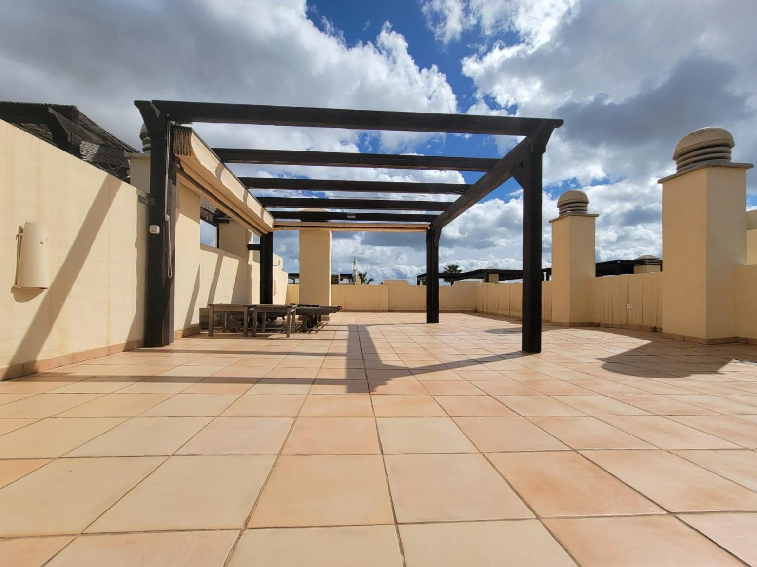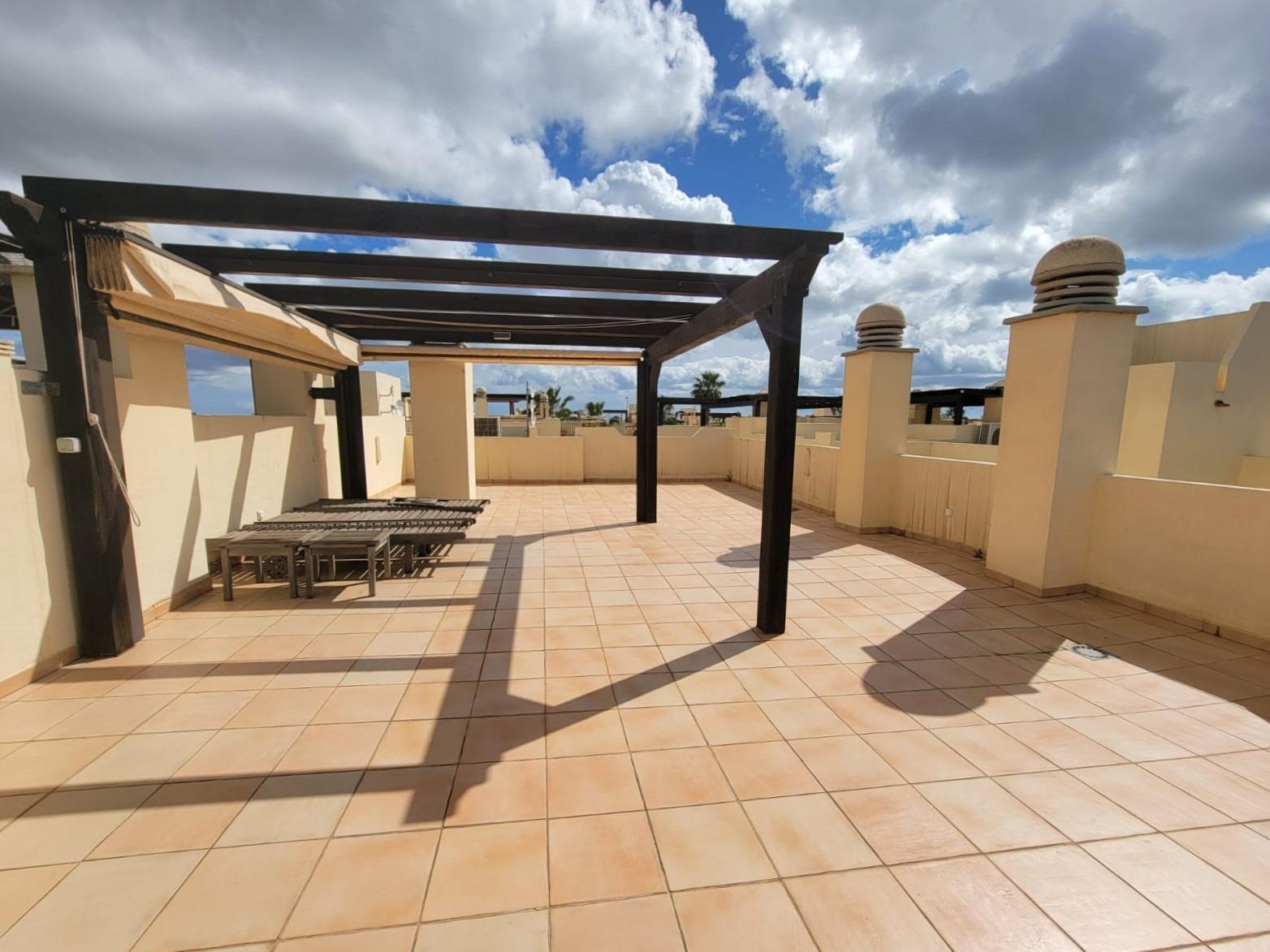 Large penthouse located in a Luxury Residential Complex in the Golf Courses near Murcia, surrounded by a natural landscape near the Mediterranean sea. With beautiful views from the solarium! It consists of a living room with a spacious terrace, a large fully equipped kitchen with access to a small patio, 2 double bedrooms (master bedroom with an en-suite bathroom) with built-in wardrobes, 2 bathrooms (one with bathtub, the other with Italian shower), a very large solarium, a storage room and an underground parking space. The solarium is accessed via an external staircase from the terrace. Furnished. Ducted air conditioning. Gas heating. In perfect condition. Modern and bright. High-quality materials. Elevator. 24-hour security. All located in a privileged area with swimming pools, gardens, sports areas (paddle tennis, and so on.), a Social Club, close to all amenities, about a 10-minute drive from San Javier and the beach.