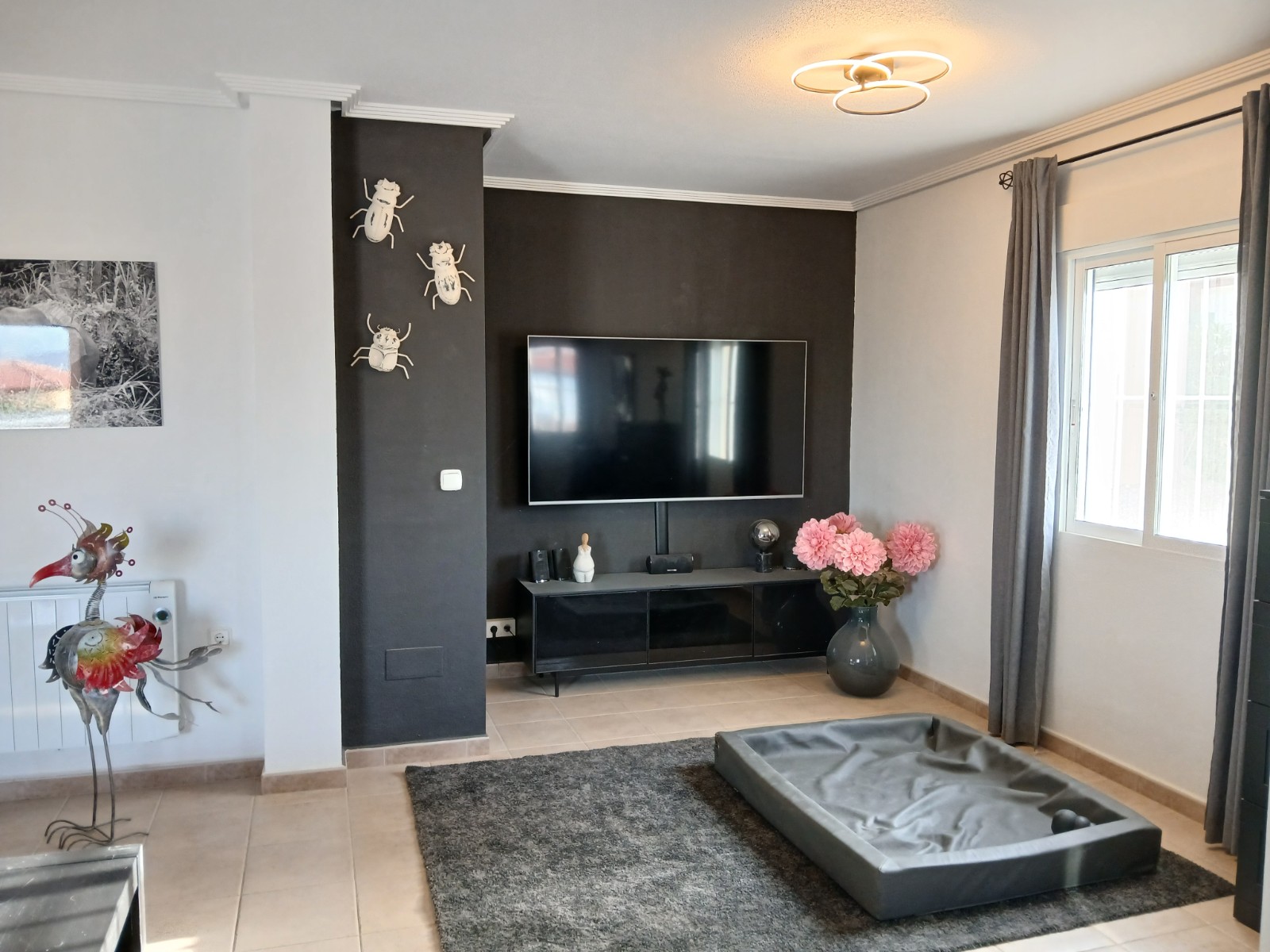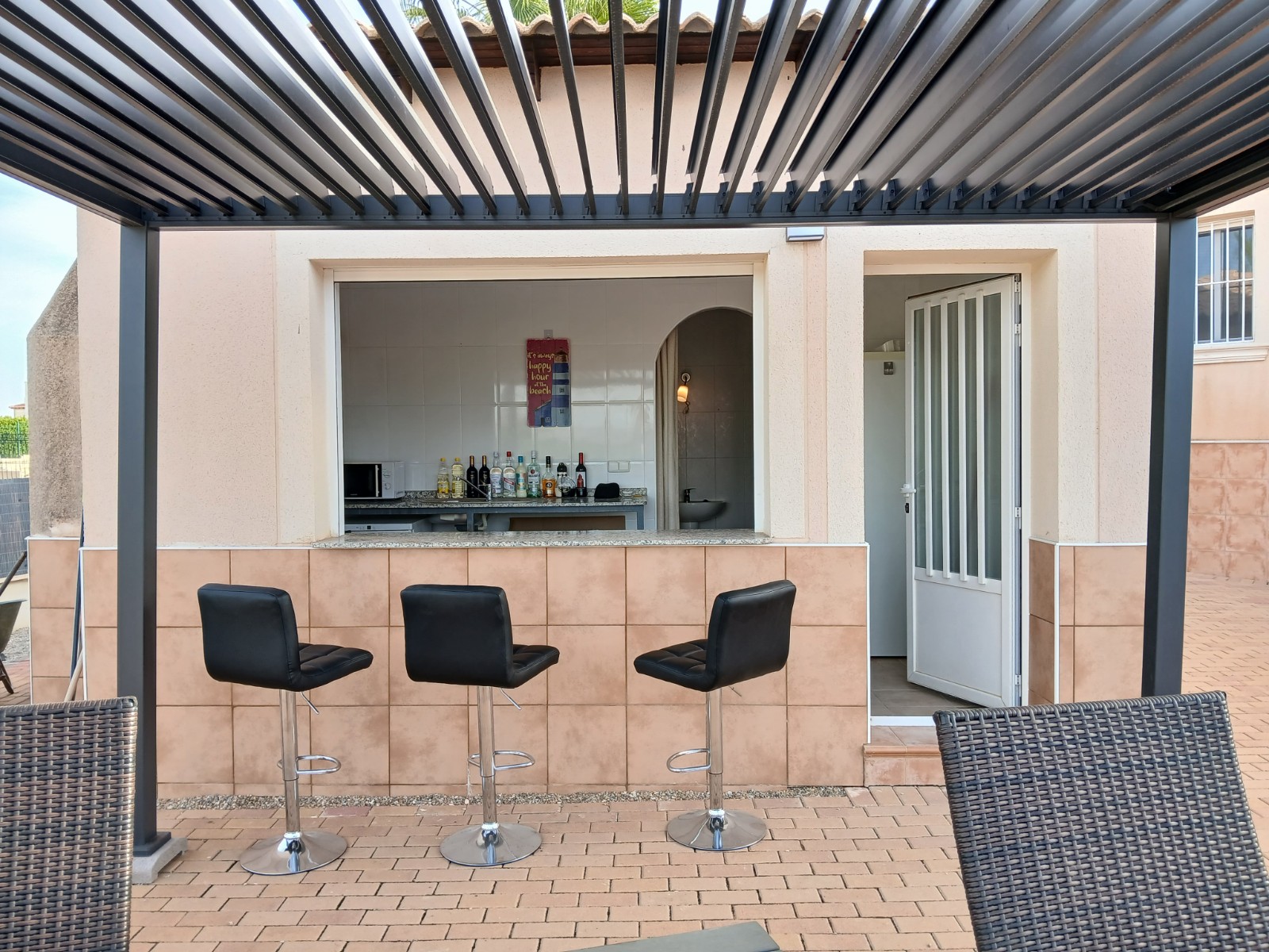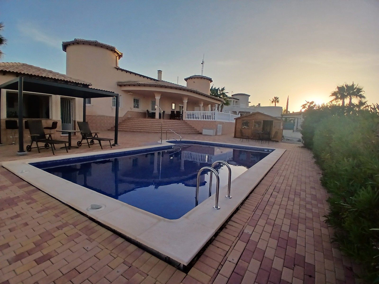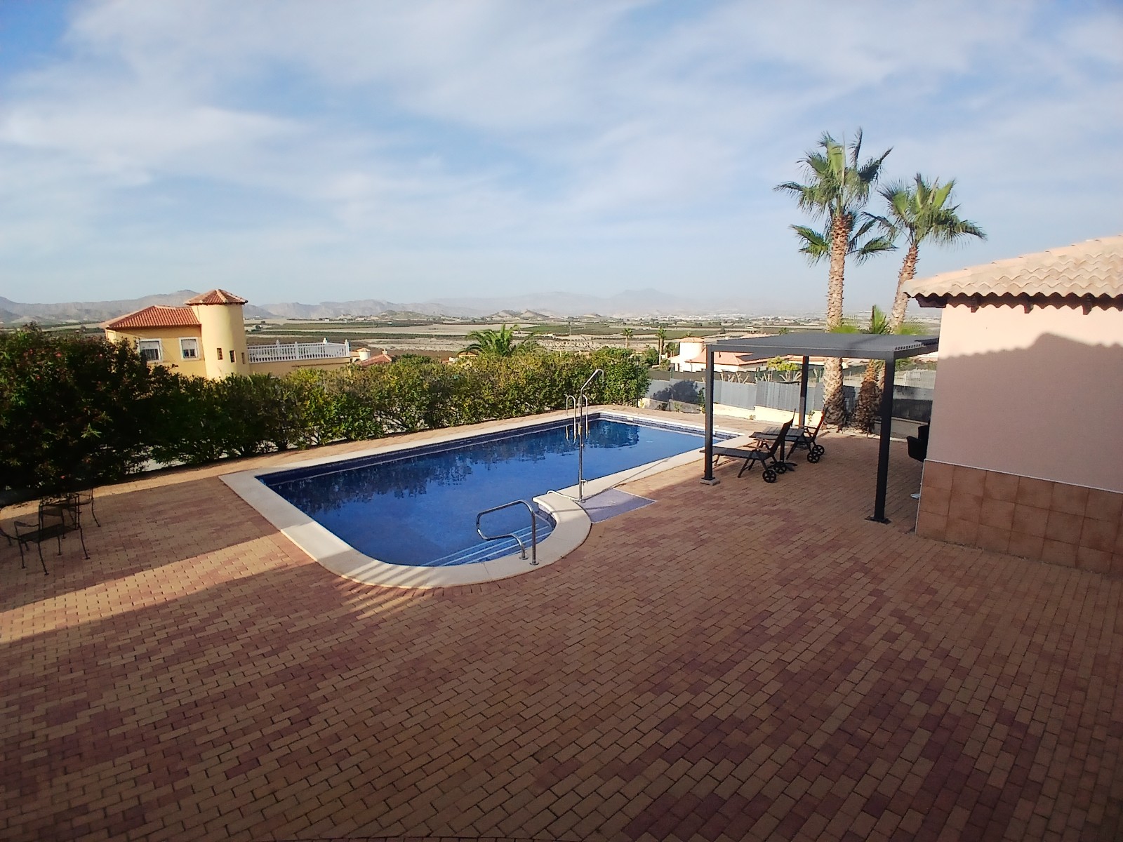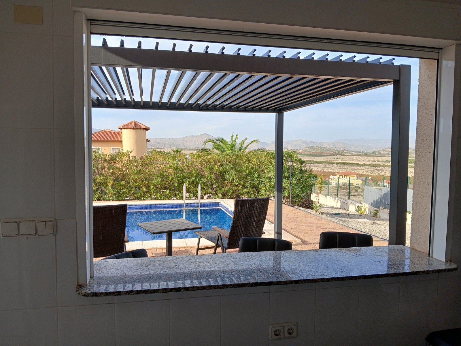 Beautiful detached villa in urbanization in Campos del Rio. In the urbanization of +/- 50 houses live English, Dutch, Belgian, Spanish and French people. The plot of 2000m2 is fully fenced and you have beautiful views of the mountains. You can enter the house through the front door or back door. At the back you enter the house by stairs to a large porch from where you can see the pool and enjoy the view. You then enter the house into the spacious living-dining room of 52.8m2, heated via an 8kw pallet stove installed in December 2023. There is also a gas fireplace, however the gas connection is currently disconnected, this can of course be reconnected. The Formas Cocinas open kitchen of 7.85m2 was installed in February 2023 and is equipped with an oven, microwave, eye-level Siemens dishwasher and large Siemens refrigerator. There are also 3 bedrooms (13.37m2, 13.58m2 and 15.56m2), the largest bedroom has a private bathroom of 6.8m2. The bedrooms have custom-made closets, these remain. There is also a 2nd bathroom with bath of 7.54m2. In the hall by the front door there are also 2 large custom-made wardrobes, these also remain. Next to the pool is a pool house with bar, here is another bathroom, so you don't have to walk through the house with your wet swimwear. Adjacent you will find the in June 2024 newly installed pergola with aluminum slats so you can sit in the shade by the pool. The pool itself was retiled in May 2024 and new lighting was installed. In April 2023, the current owner also had a 35m2 garage built in the same style as the house. You can thus put your car/motorbike/bikes inside.Furthermore, a wooden garden shed of 9m2 for extra storage space was installed in June 2024. The house is powered by 16x 420 watt solar panels with Huawei inverter which were installed in July 2023. The energy costs are therefore only 28 euros per month. The entire house is equipped with air conditioning, double glazing, mosquito nets (May 2023), (mostly electric) shutters, decorative grills (May 2023) and electric heaters. The house is being sold unfurnished. There are no urbanization fees.
