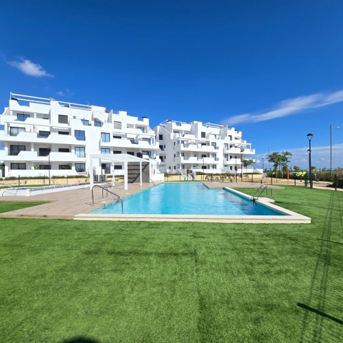 We are thrilled to exclusively offer this fantastic three bedroom two bathroom second floor apartment for sale on the Mar Menor Golf Resort.  The property is being sold furnished with hot and cold aircon throughout and allocated underground parking with lift access to the property.  The apartment is in a great location, a very well maintained block overlooking one of the resorts swimming pools and views over the golf course and surrounding countryside.  The owners have made some improvements to the property and it is extremely well maintained.  There is an onsite supermarket, the MMGR club with padel, gym, restaurant and mini golf, ONA hotel and clubhouse and an array of great restaurants just outside the resort on the boulevard, all are walking distance from the property. The Mar Menor beach town of Los Alcazares is a short 8 minutes drive away, Murcia airport 20 minutes and Alicante an hours drive.This fantastic property comprises an large open plan kitchen, dining and living room.  The fully equipped kitchen has a new oven and hob and the owners installed a new heater in February this year.  The spacious sunny lounge diner has patio door access on to the huge terrace where you can enjoy views over one of the resorts communal pools and the golf course.  The property had three double bedrooms all with fitted wardrobes.  The master has an ensuite bathroom with newly fitted walk in shower and patio door access to the main terrace.  The second guest bedroom is a really sunny room with aspects over the resort and the third bedroom has access to its own terrace.  There is a separate family shower room.  The allocated parking space has a large double aluminium built storage shed, perfect for golf clubs, bikes and beach chairs.  All windows have fly screens and the property had new aircon installed back in July 2021.  This is a fabulous property really well looked after by the owners.  Contact us to book a viewing appointment.