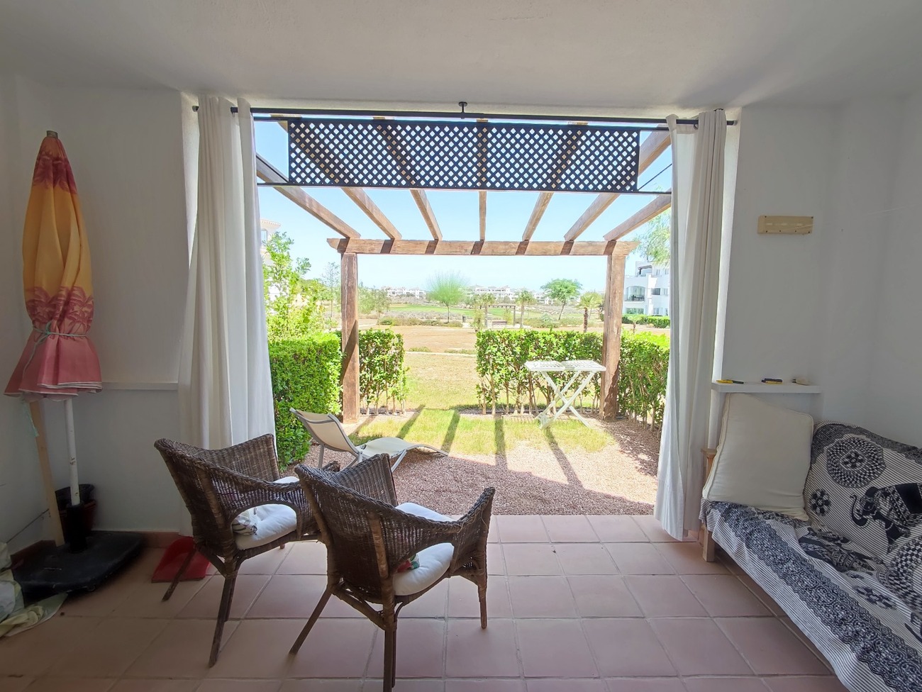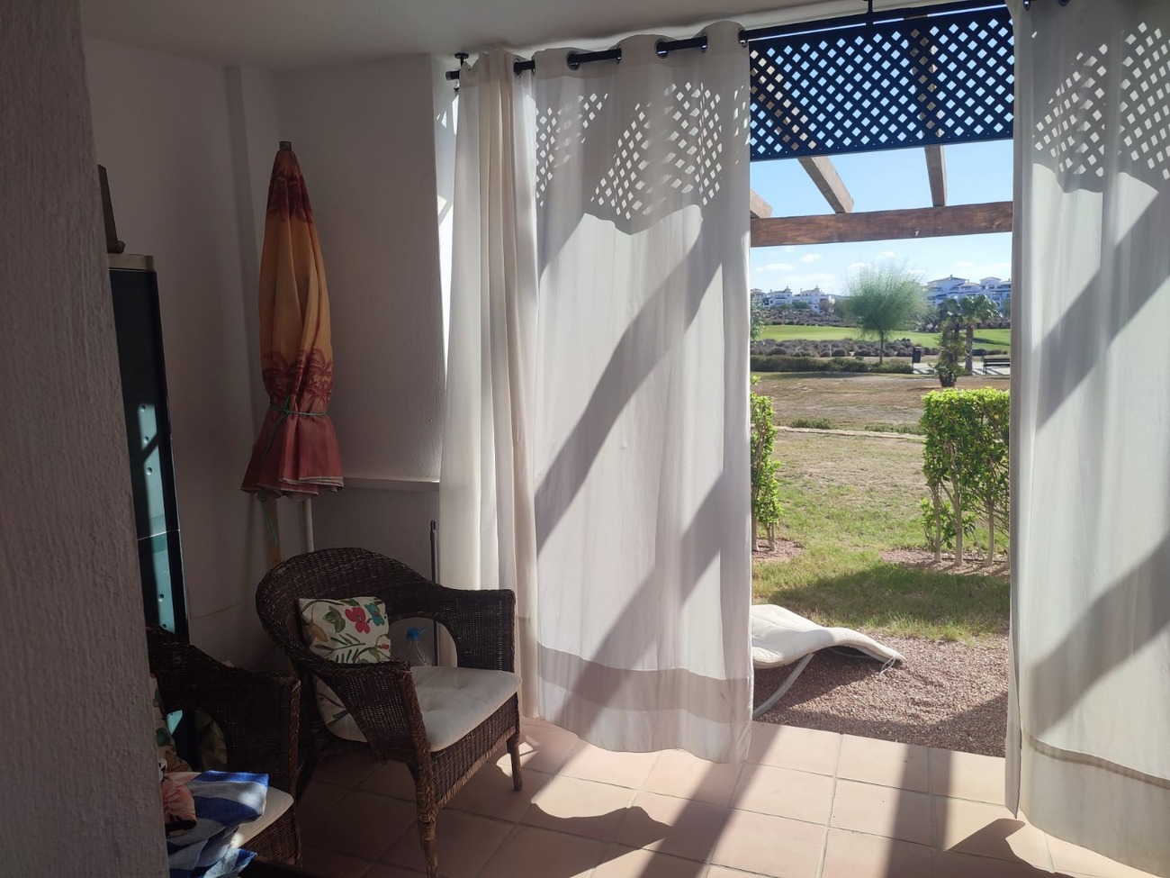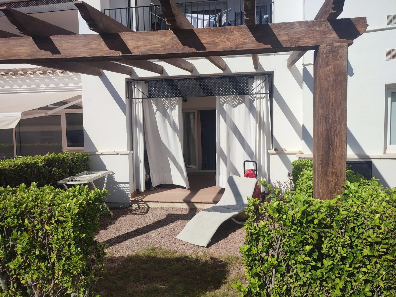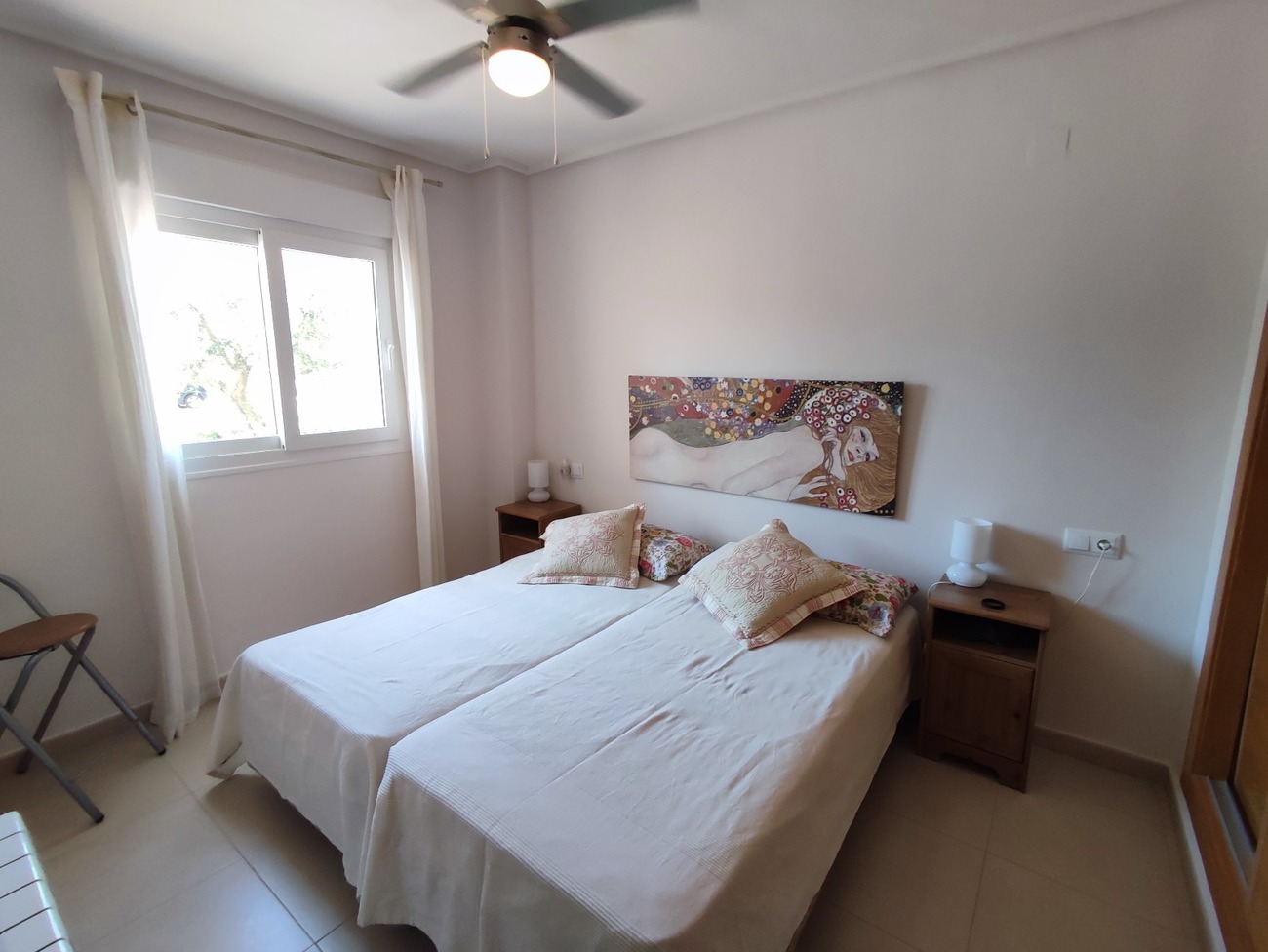 This garden apartment is South East facing and has great views, plenty of natural light and built to a very high standard . The main door of the apartment enters into a bright and airy living/dining room featuring storage units, sofas, coffee table and dining table and chairs, air-conditioning and heating. The living room has patio doors to lead to a terrace area and garden with garden and golf views, perfect location for morning sunshine. The main bedroom features a double bed and bedside tables, fitted wardrobe, ceiling fans and heating. The bathroom has a bathtub, vanity unit, wc and bidet. The second bedroom is a twin room comes with fitted wardrobes, ceiling fans and heating. The kitchen has fitted kitchen units, oven, hob, extractor, fridge freezer and washing machine. This apartment comes fully furnished, with underground parking in a resort with WIFI, satellite TV, gardens, pools, sports facilities, restaurant & supermarket, situated close to the village of Sucina and just 15 minutes drive to the airport and to the coast.