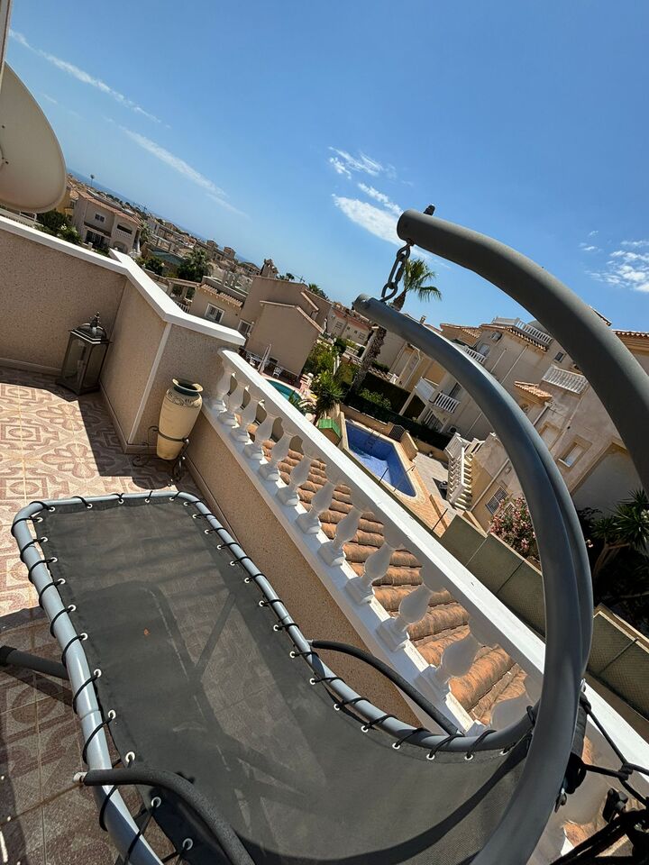 Must be viewed, CAR INCLUDED, Fully Furnished to the highest standard!This  well presented, spacious 3 bed, 3 bathroom detached villa set in a gated community in the urbanisation of El Galan, Villamartin.This property consists of a fully developed under build with a newly refurbished bathroom and a large spacious double bedroom, with the ability to convert to adapt to a self contained studio.On the ground floor, there is an open plan kitchen and living room, with a bathroom, utility/ storage room and access to the under build. On the 1st floor there are 2 beautiful large double bedrooms both with doors leading onto a stunning terrace, with views of the pool. A further Juliet balcony on the main bedroom with stunning views all the way to the sea. There is also a spacious family bathroom and access to a self contained storage area.  The outdoor spaces consist of a wrap round garden, porch and access to the stunning communal pool with an outdoor shower and plenty of space for sunbathing. There is also a spacious garage with an american fridge freezer, space to park a car which is also INCLUDED in the price.This is a perfect location and property for holidays or a permanent home. Airport: 50 minutesNearest beach: 12 minutes