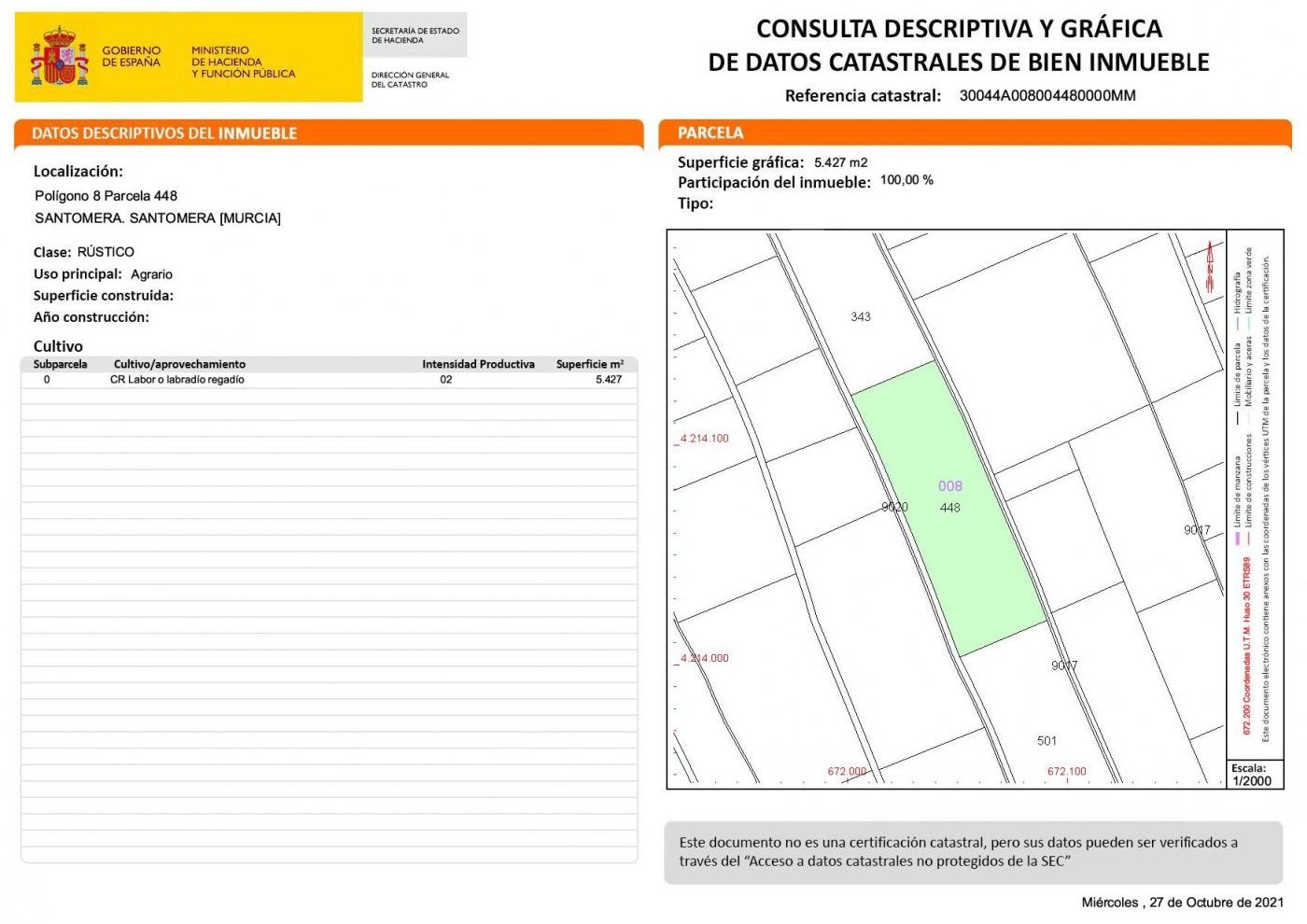 Lantlig mark på 5 427 m2 till salu i Vereda Los Cacheros-området i Santomera, Murcia. Rustik jordbrukstyp, för närvarande är den planterad med citronträd med traditionell bevattning från Acequia Zaraiche. På grund av dess dimensioner finns möjlighet att bygga på marken.