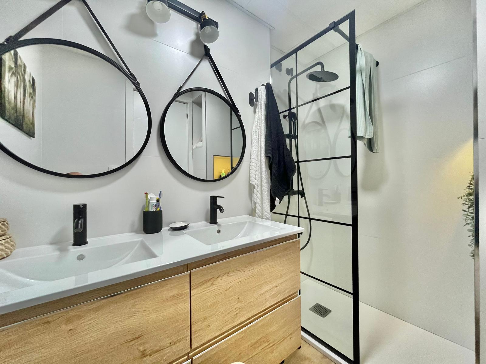We present this beautiful apartment located on the seventh floor, offering panoramic views and a partial sea view. Just a 20-minute walk from Playa de los Locos and close to all amenities, it's perfect as a permanent residence or a holiday home. The property features 2 bedrooms, a full bathroom and an en-suite toilet, and has been fully renovated in 2022 with high-quality materials and stylish, modern design. Highlights include: Double-glazed Climalit tilt-and-turn windows Wood-effect porcelain flooring Smooth walls Central air conditioning Security door The apartment is sold unfurnished. Furniture is not included. The complex boasts spacious and well-maintained green areas and offers two communal swimming pools to enjoy the Mediterranean climate. There is also the option to rent a communal parking space for €500 per year. With a fantastic southeast orientation, this apartment is bright and comfortable all year round.