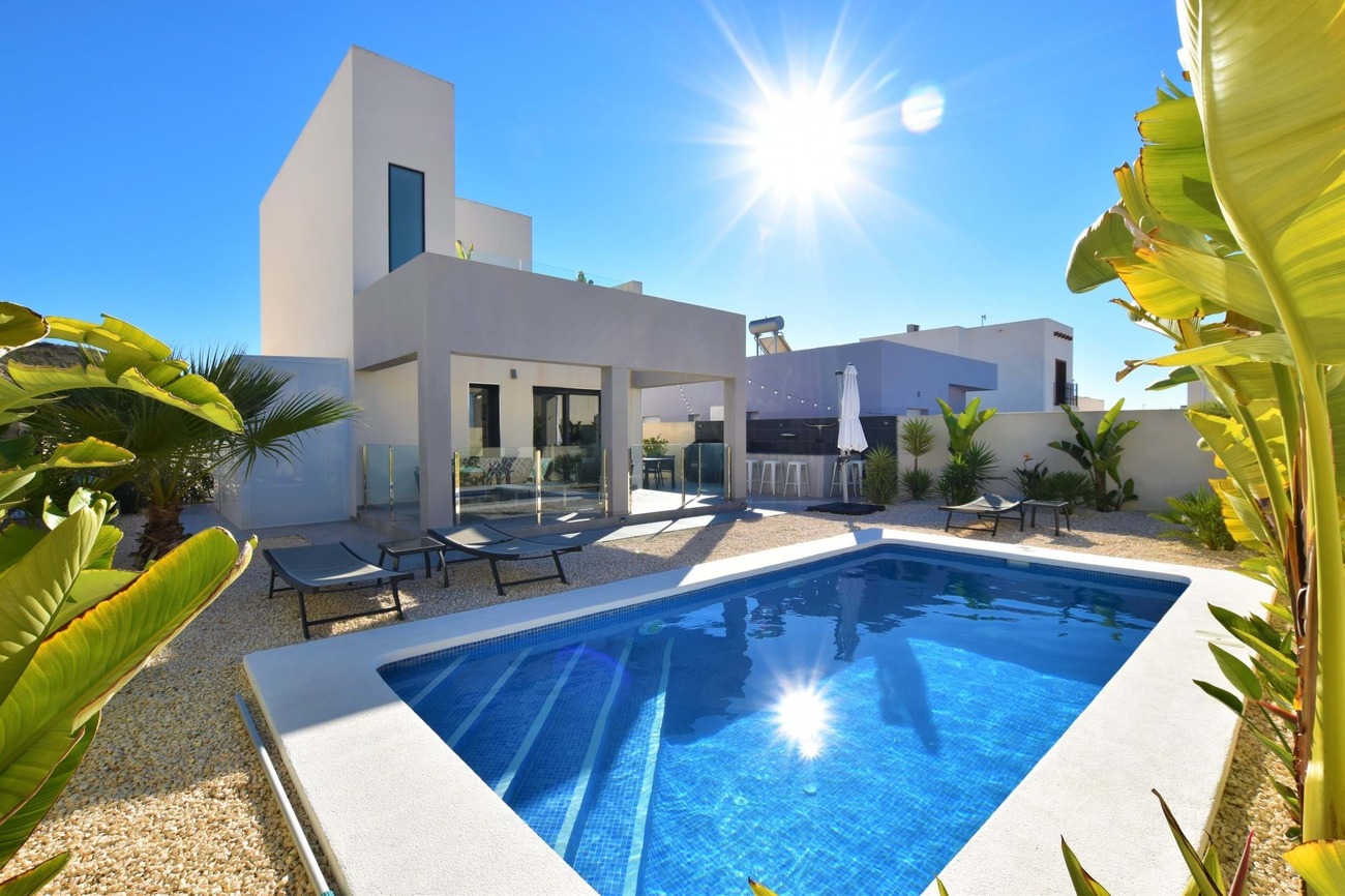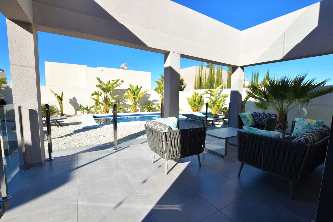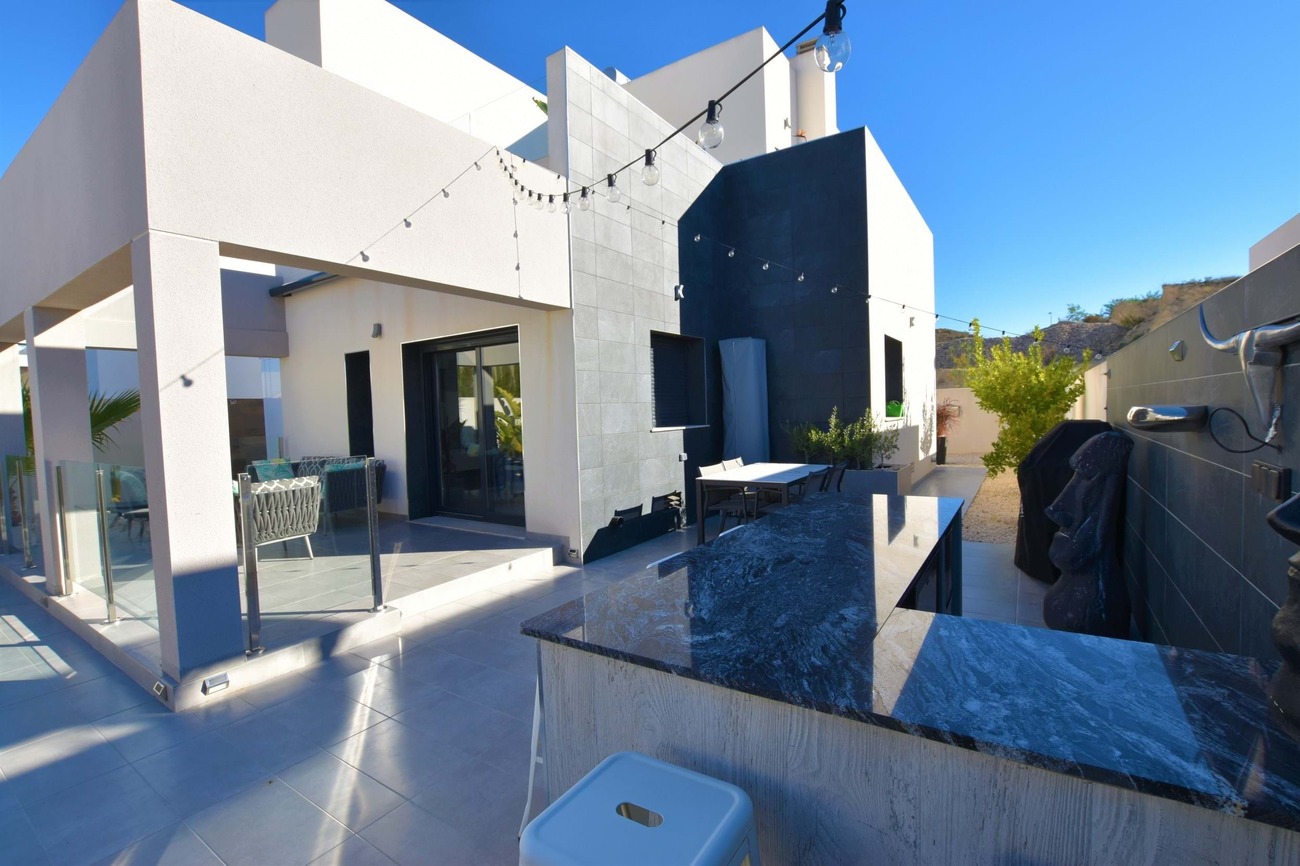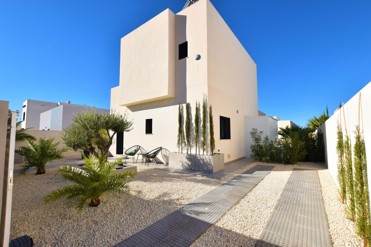 We are pleased to present this fantastic west facing villa built to the highest standard on a large plot with amazing views! Set in the highly sought after area of Benimar II this fantastic property boasts a great location, centrally located between Benijofar, Benimar and Ciudad Quesada all an easy walk away!Set on a quiet road of Benimar with just a few houses, this property boasts a peaceful location yet close to all amenities, the entrance to the property is via the pedestrian entrance or automatic vehicle gate which leads to a spacious garden, tastefully decorated with lovely planters and olive trees as well as white stone gravel.This then leads around to the other garden which boasts a modern outdoor bar, lots of palm trees that give a Mediterranean feel to the garden as well as extra privacy, a private swimming pool and a large terrace area overlooking the garden with full awnings to turn this into a covered area.Entering the house from the roadside entrance leads onto the stunning and modern kitchen area with additional storage, worktop space, cupboards and breakfast bar at the end. The kitchen leads onto a bright and spacious living area that has been tastefully decorated using the highest quality materials and incorporates an integrated Bose surround sound system, there are also patio doors that lead to the terrace area.From the living room, there is access to a good-sized guest bedroom which is currently used as an office space, and a lovely walk-in shower room next door. A staircase off the living room that has featured lighting and a window letting in an abundance of light leads to the master bedroom with an en-suite shower room. The master bedroom has access to a large solarium that boasts sun all day long and has amazing, unobstructed views over the surrounding countryside.The property is ideally located just a 15-minute walk from Benimar, Benijofar or Ciudad Quesada giving a wide range of amenities all within walking distance from the property.The property is being offered fully furnished with only the highest quality materials being used for furnishing and also no expense spared with the build quality and comes with many extras, book your viewing today!