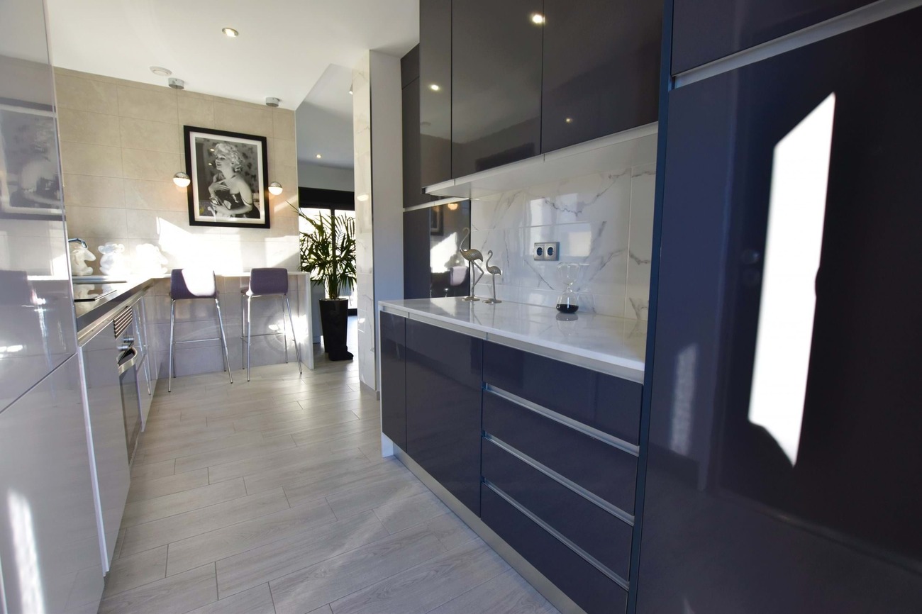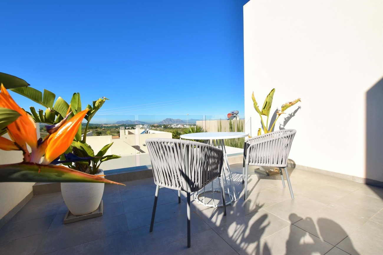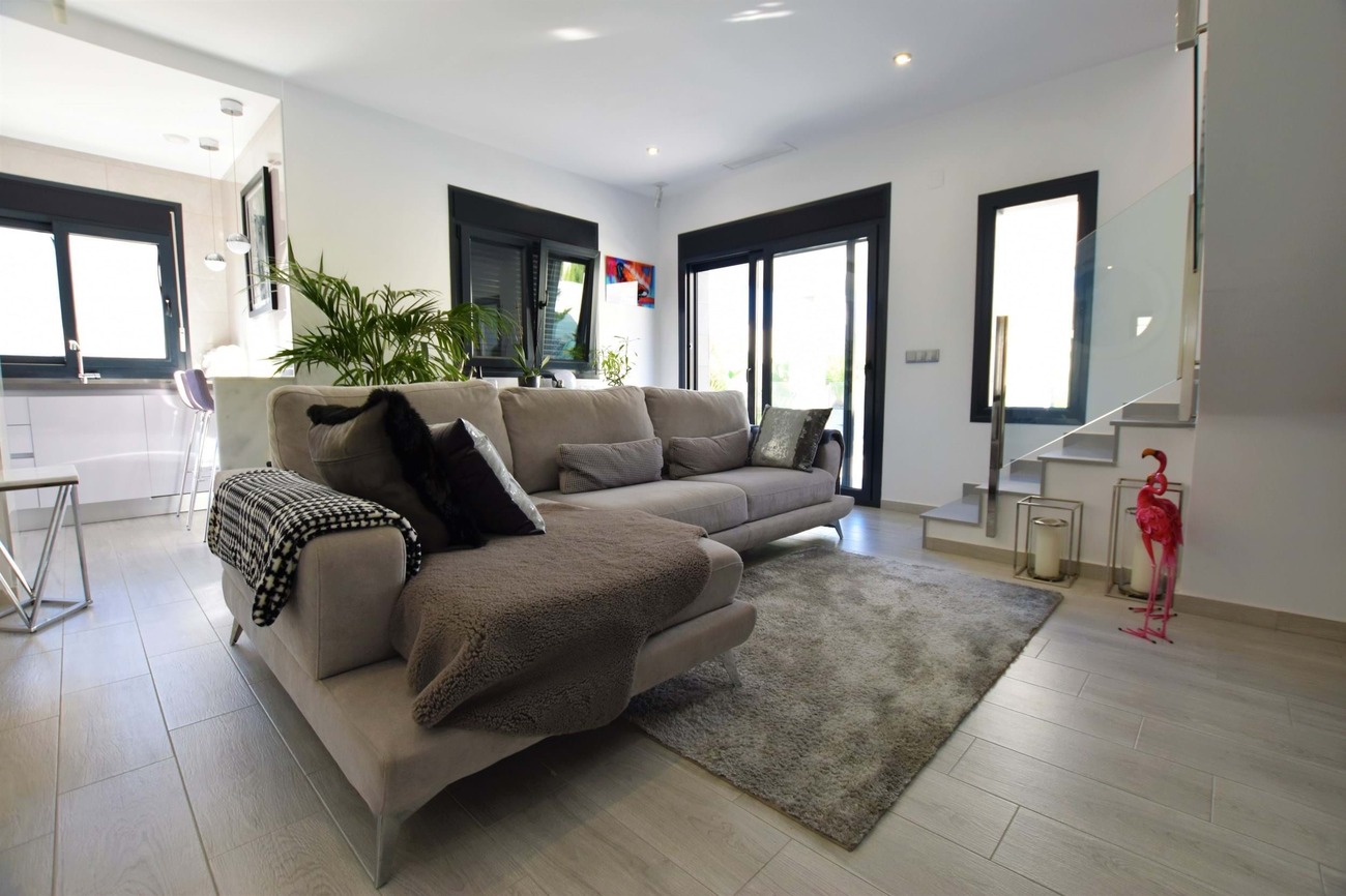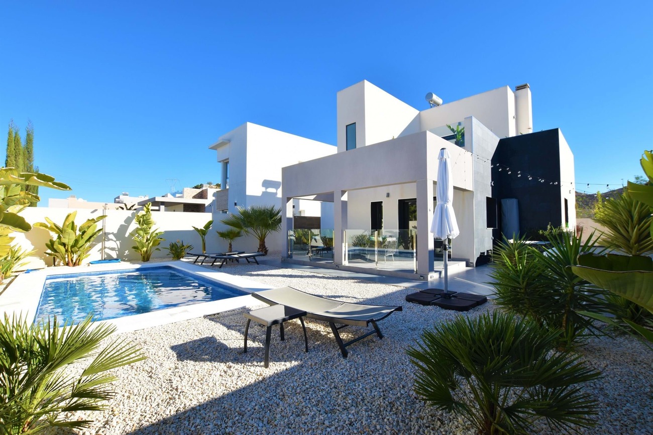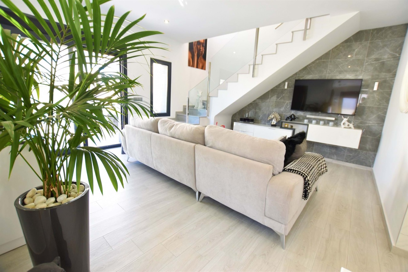 We are pleased to present this fantastic west facing villa built to the highest standard on a large plot with amazing views! Set in the highly sought after area of Benimar II this fantastic property boasts a great location, centrally located between Benijofar, Benimar and Ciudad Quesada all an easy walk away!Set on a quiet road of Benimar with just a few houses, this property boasts a peaceful location yet close to all amenities, the entrance to the property is via the pedestrian entrance or automatic vehicle gate which leads to a spacious garden, tastefully decorated with lovely planters and olive trees as well as white stone gravel.This then leads around to the other garden which boasts a modern outdoor bar, lots of palm trees that give a Mediterranean feel to the garden as well as extra privacy, a private swimming pool and a large terrace area overlooking the garden with full awnings to turn this into a covered area.Entering the house from the roadside entrance leads onto the stunning and modern kitchen area with additional storage, worktop space, cupboards and breakfast bar at the end. The kitchen leads onto a bright and spacious living area that has been tastefully decorated using the highest quality materials and incorporates an integrated Bose surround sound system, there are also patio doors that lead to the terrace area.From the living room, there is access to a good-sized guest bedroom which is currently used as an office space, and a lovely walk-in shower room next door. A staircase off the living room that has featured lighting and a window letting in an abundance of light leads to the master bedroom with an en-suite shower room. The master bedroom has access to a large solarium that boasts sun all day long and has amazing, unobstructed views over the surrounding countryside.The property is ideally located just a 15-minute walk from Benimar, Benijofar or Ciudad Quesada giving a wide range of amenities all within walking distance from the property.The property is being offered fully furnished with only the highest quality materials being used for furnishing and also no expense spared with the build quality and comes with many extras, book your viewing today!
