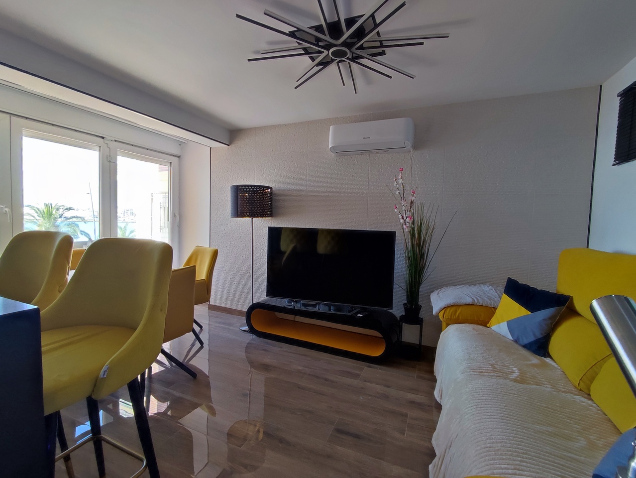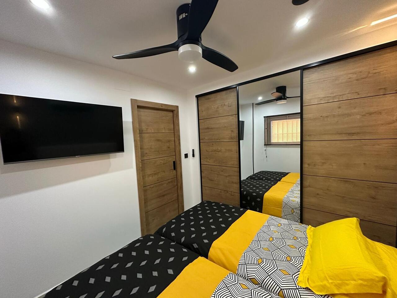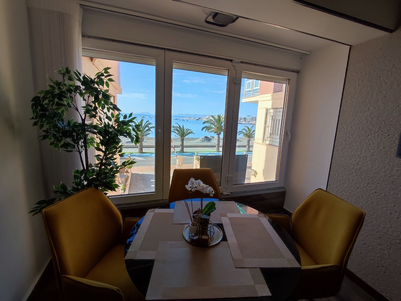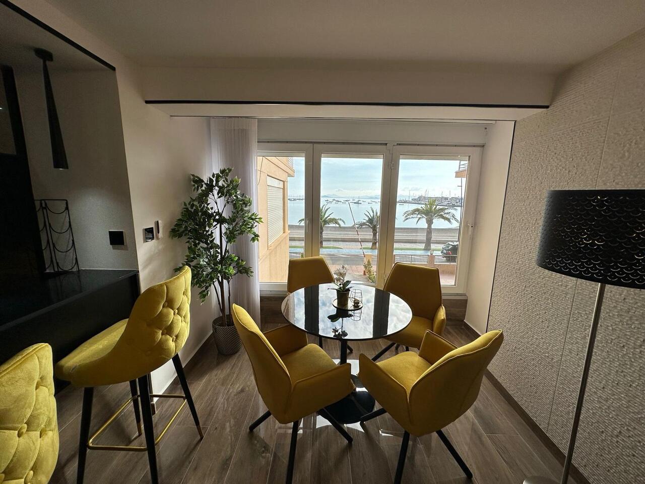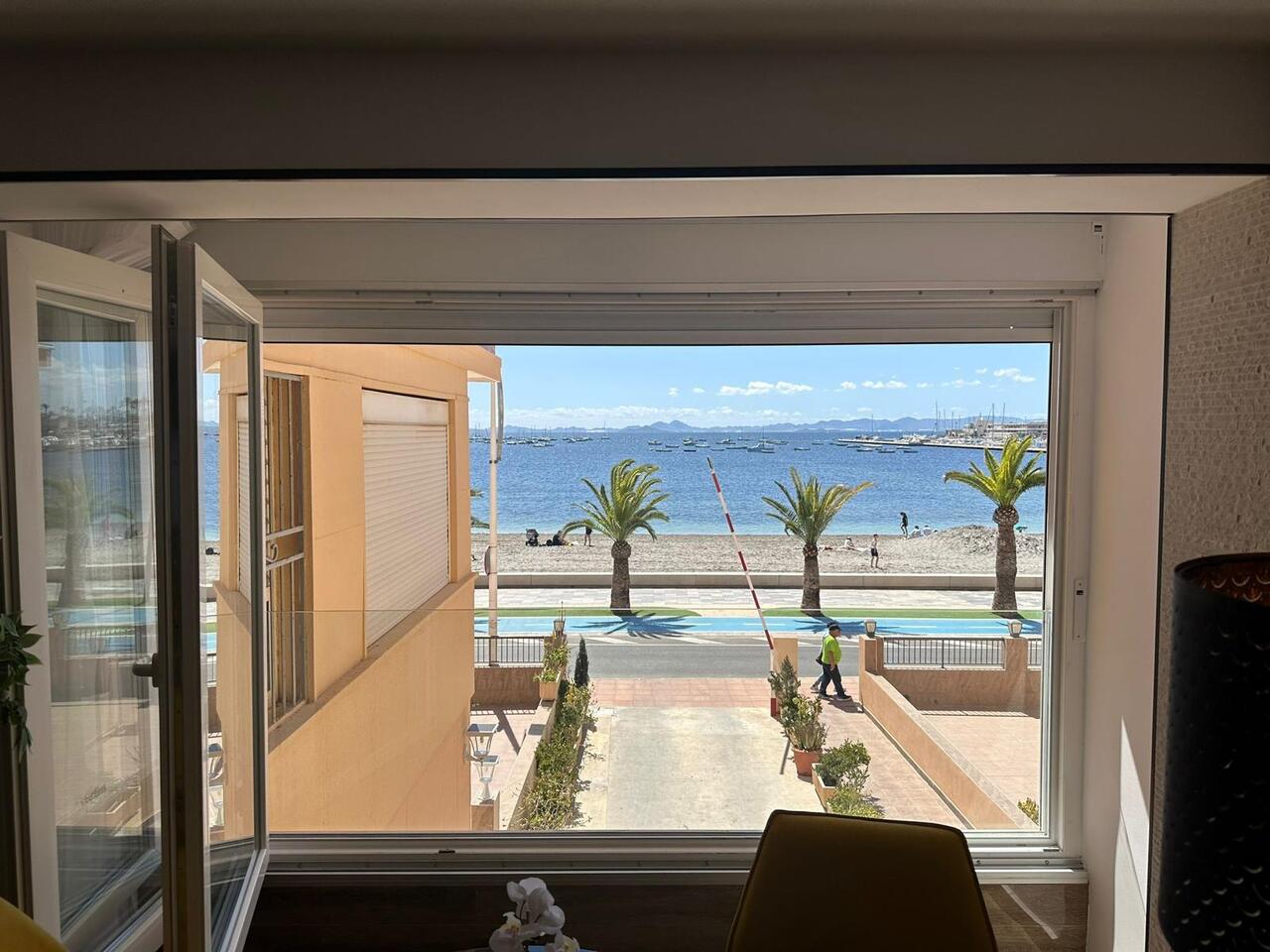 This stylish modern renovated apartment front line to the beach of Lo Pagan.The contemporary design leads throughout the whole apartment. The open plan layout has been carefully arranged with a state-of-the-art fully equipped kitchen, breakfast bar and a raised lounge area complete with a dining area and views over the Mar Menor. The large-format tiles lead you through the apartment which  has two large bedrooms, each with generously sized built-in wardrobes and a modern design that maximizes space without sacrificing aesthetics.  The apartment's two bathrooms are completely renovated, with high-quality materials and a fresh, contemporary design.Additionally, this apartment has a common outdoor area that is perfect for everyday tasks such as hanging clothes or storing items such as bicycles, beach chairs, and more. The apartment includes a garage, which adds convenience and security. It's also included in the price, an added value that makes this property an even more attractive option.This apartment would make an ideal holiday home by the sea and has been a successful holiday let apartment.    • 65 m²     • 2 Bedrooms.    • 2 Bathrooms.    • Enclosed Terrace with Bio fold Windows.    • Parking space included in the price    • Second hand/good condition    • With elevator
