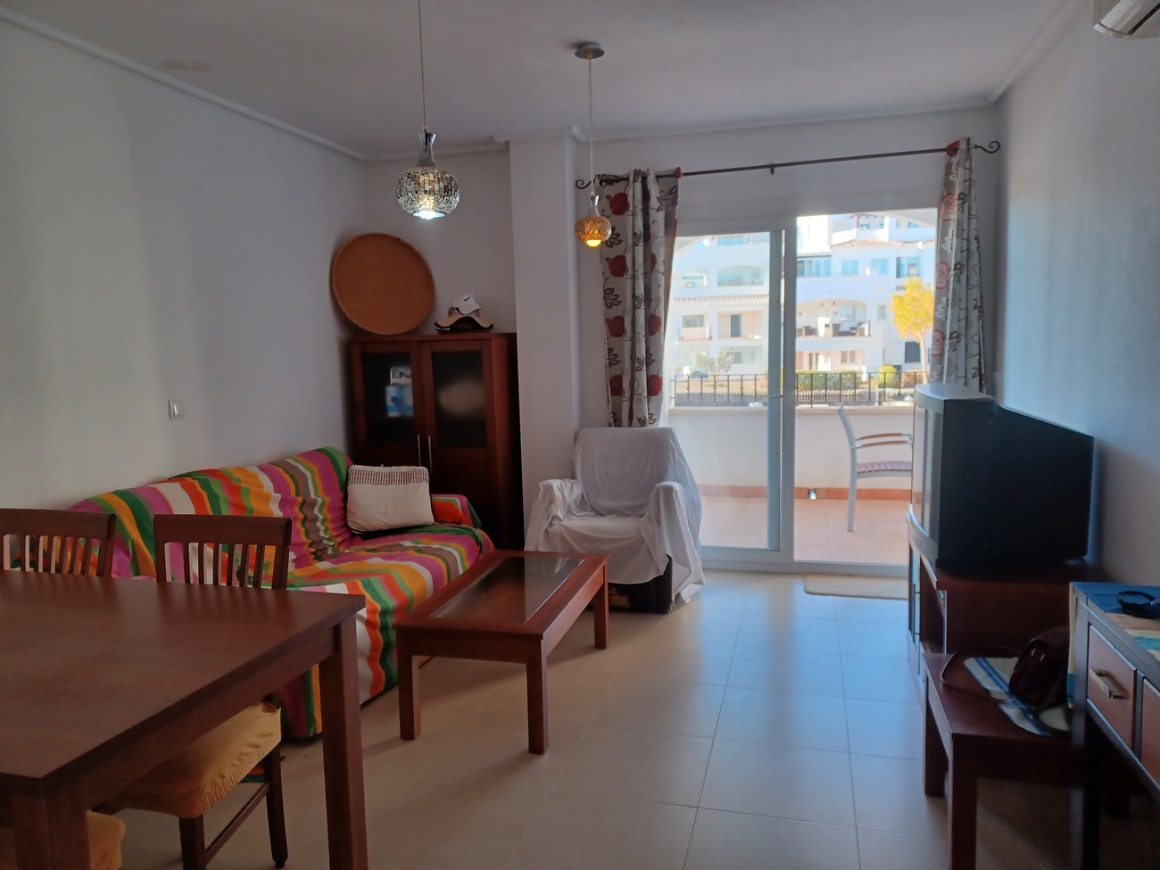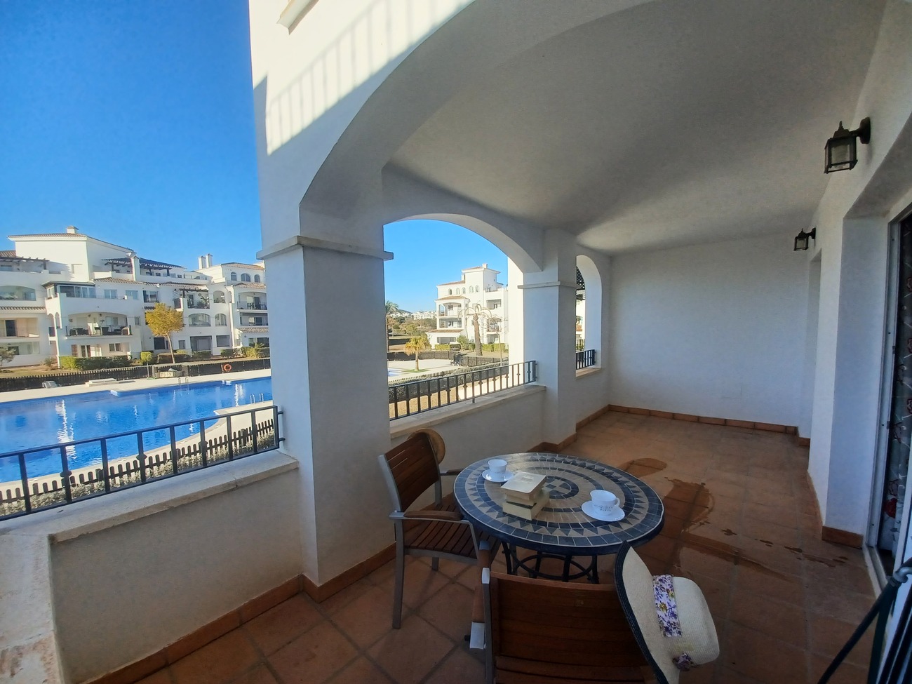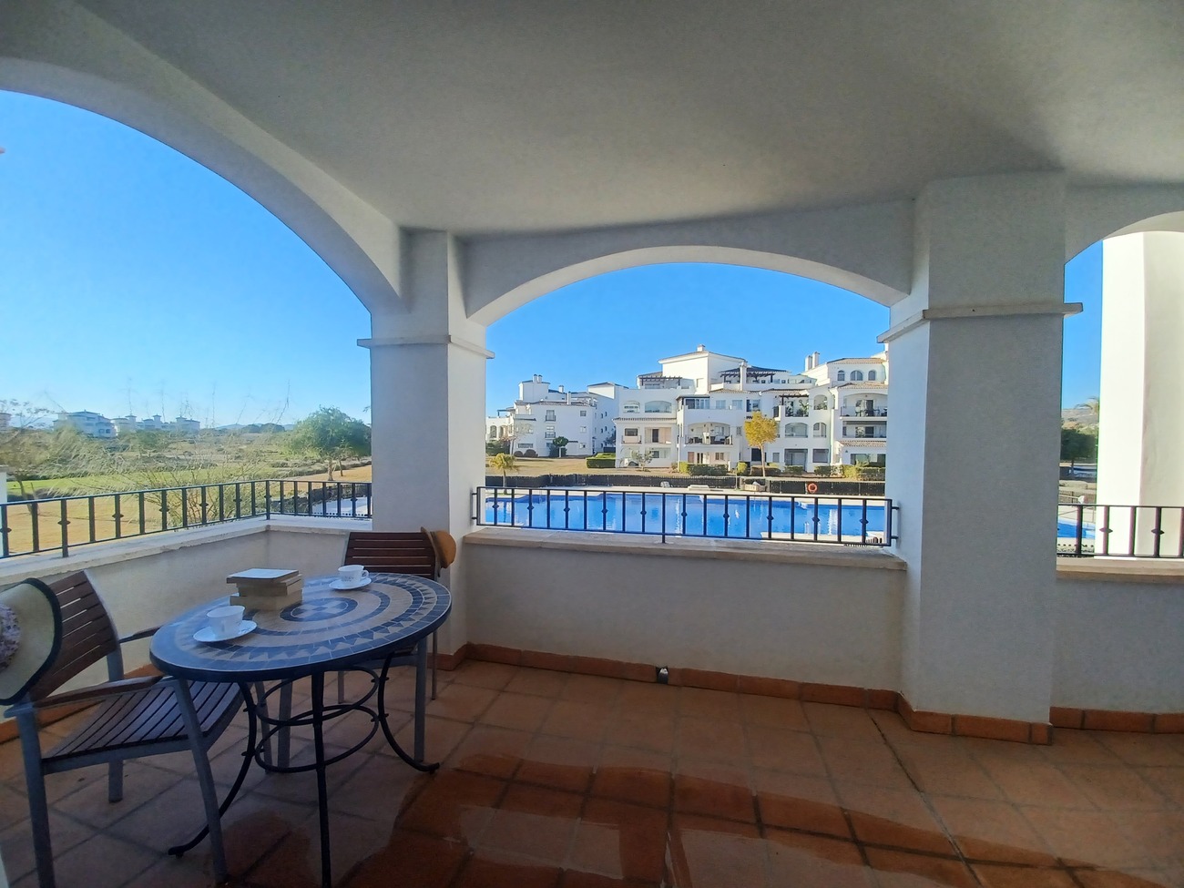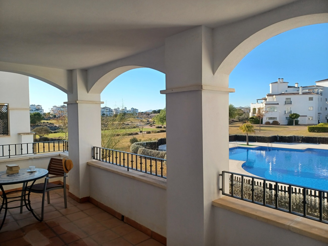 This stunning apartment has great views, plenty of natural light and built to a very high standard . The apartment is situated on the first floor, the main door of the apartment enters into a bright and airy living/dining room featuring storage units, sofas, coffee table and dining table and chairs, airconditioning and heating.  The living room has patio doors to lead to a large covered terrace featuring arches overlooking the swimming pool with golf views, it is a West facing terrace to enjoy the afternoon sunhine.  The main bedroom features a double bed and bedside tables, fitted wardrobe, air conditioning and heating, there are glass patio doors leading to the terrace.  The bathroom has a bathtub, vanity unit, wc and bidet.  The second bedroom is a twin room with window views to the garden, it also comes with fitted wardrobes and heating.  The kitchen has fitted kitchen units, oven, hob, extractor, fridge freezer and dishwasher, there is a separate utility room with the washing machine.  This apartment comes fully furnished, with underground parking in a resort with WIFI, satellite TV, gardens, pools, sports facilities, restaurant & supermarket, situated close to the village of Sucina and just 15 minutes drive to the airport and to the coast.