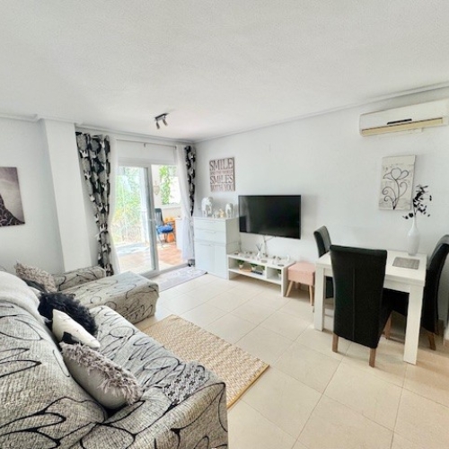 WOW! En sällsynt pärla på marknaden – Lägenhet med 3 sovrum, 2 badrum på första våningen och fantastisk utsikt över golfbananVi är otroligt glada att kunna visa upp denna exceptionella och sällan tillgängliga lägenhet på första våningen med tre sovrum och två badrum, perfekt belägen för att njuta av en fantastisk, oavbruten utsikt över golfbanan. Denna fastighet, som uppgraderats till en imponerande standard av de nuvarande ägarna och säljs fullt möblerad, är ett sällsynt fynd och erbjuder den perfekta blandningen av stil, komfort och funktionalitet. Oavsett om du söker en heltidsbostad, en lyxig semesterort eller en uthyrningsklar investering tack vare dess värdefulla turistlicens, uppfyller denna lägenhet alla krav.När du kliver in är noggrannheten med detaljer och de genomtänkta renoveringarna omedelbart tydliga. Det eleganta vardagsrummet är smakfullt inrett med en fondvägg, modern öppen spis och en helt ny luftkonditionering. Det öppnar sömlöst upp mot en stor terrass i österläge, perfekt för att njuta av morgonsolen och ett lugnt utomhusliv. Terrassen har blivit helt inhägnad med eleganta skjutdörrar, vilket skapar ett året runt-utrymme som för närvarande används som matplats – en fantastisk förlängning av vardagsrummet som drar full nytta av den hisnande utsikten över golfbanan.Det specialbyggda köket har uppgraderats till en hög standard med kyl och frys i amerikansk stil, svart diskho, integrerad ugn, mikrovågsugn och diskmaskin. Det öppnar upp mot ett helt slutet tvättutrymme med tvättmaskin och inbyggda skåp, vilket erbjuder utmärkt extra förvaring och praktiska egenskaper.Det stora sovrummet är en riktig tillflyktsort, med altandörrar som öppnar direkt mot terrassen, vilket släpper in naturligt ljus och utsikt över golfbanan. Det har också luftkonditionering, takfläkt, inbyggda garderober och ett elegant, modernt badrum med duschkabin. Det andra dubbelrummet erbjuder också komfort och stil, med inbyggda garderober, luftkonditionering och takfläkt.Det tredje sovrummet är en sann sällsynthet på den här resorten och erbjuder ännu mer mångsidighet – perfekt för gäster, som hemmakontor eller som extra sovplats.I hela huset är alla fönster försedda med myggnät för att säkerställa en lugn och skadedjursfri miljö. Innerdörrarna har uppgraderats till en krispig vit finish, vilket kompletterar den moderna inredningen. Varje luftkonditioneringsenhet i lägenheten är helt ny och erbjuder effektiv kylning och trygghet i många år framöver.Paketet kompletteras av ett privat förråd i det säkra underjordiska garaget, tillsammans med en angiven parkeringsplats som nås via fjärrkontroll.Detta är verkligen en speciell möjlighet att äga en vackert uppgraderad och sällan tillgänglig lägenhet i österläge på ett av semesterortens mest attraktiva lägen. Möjligheter som denna dyker inte upp ofta – agera snabbt och boka din visning idag innan den är borta.