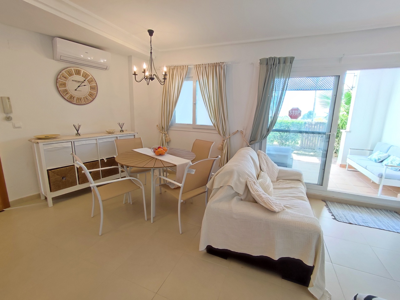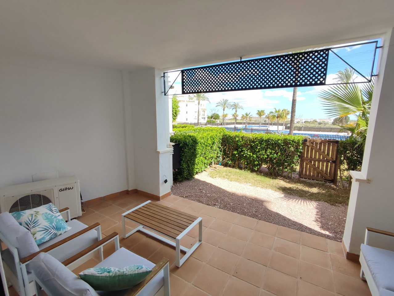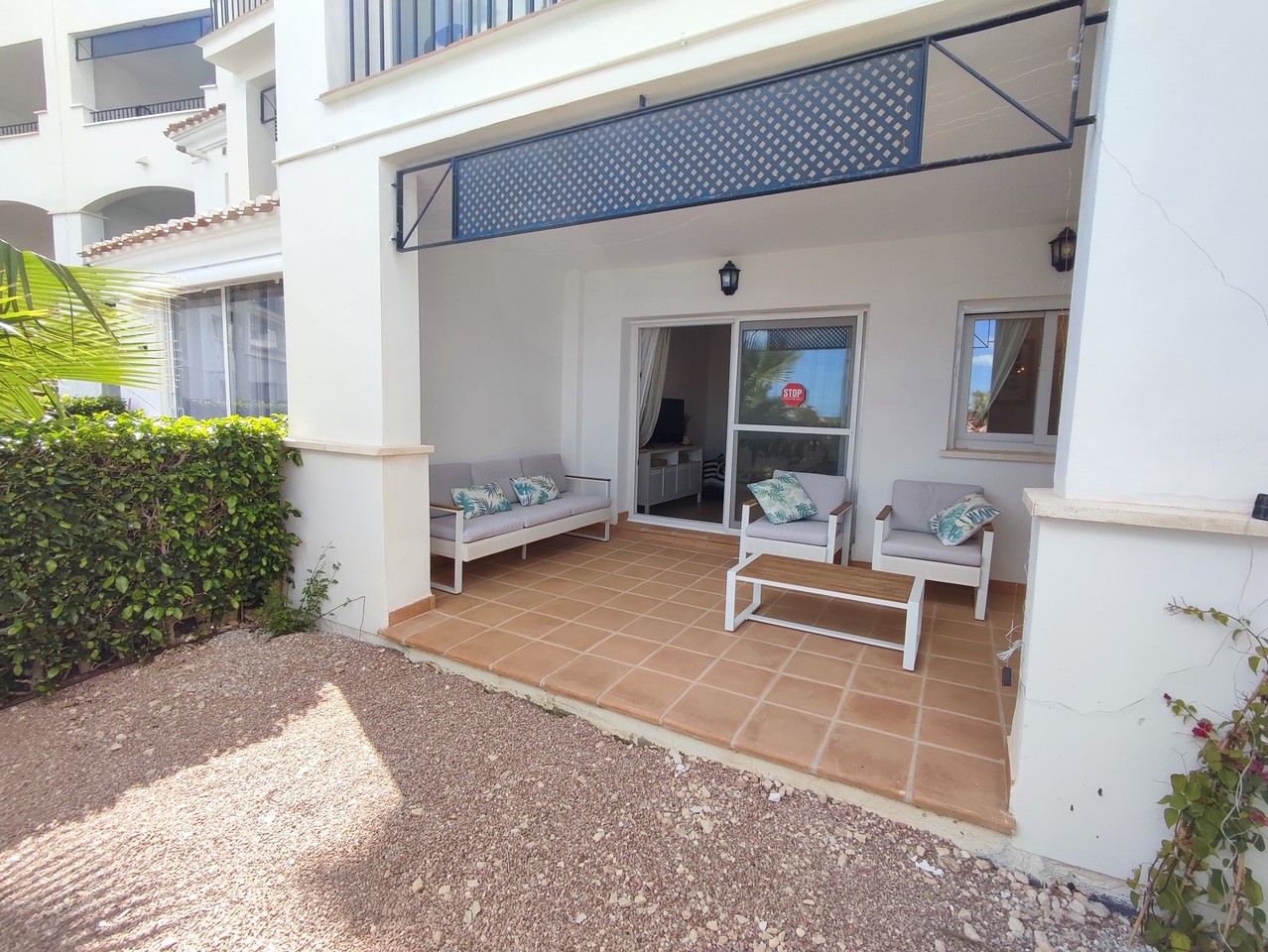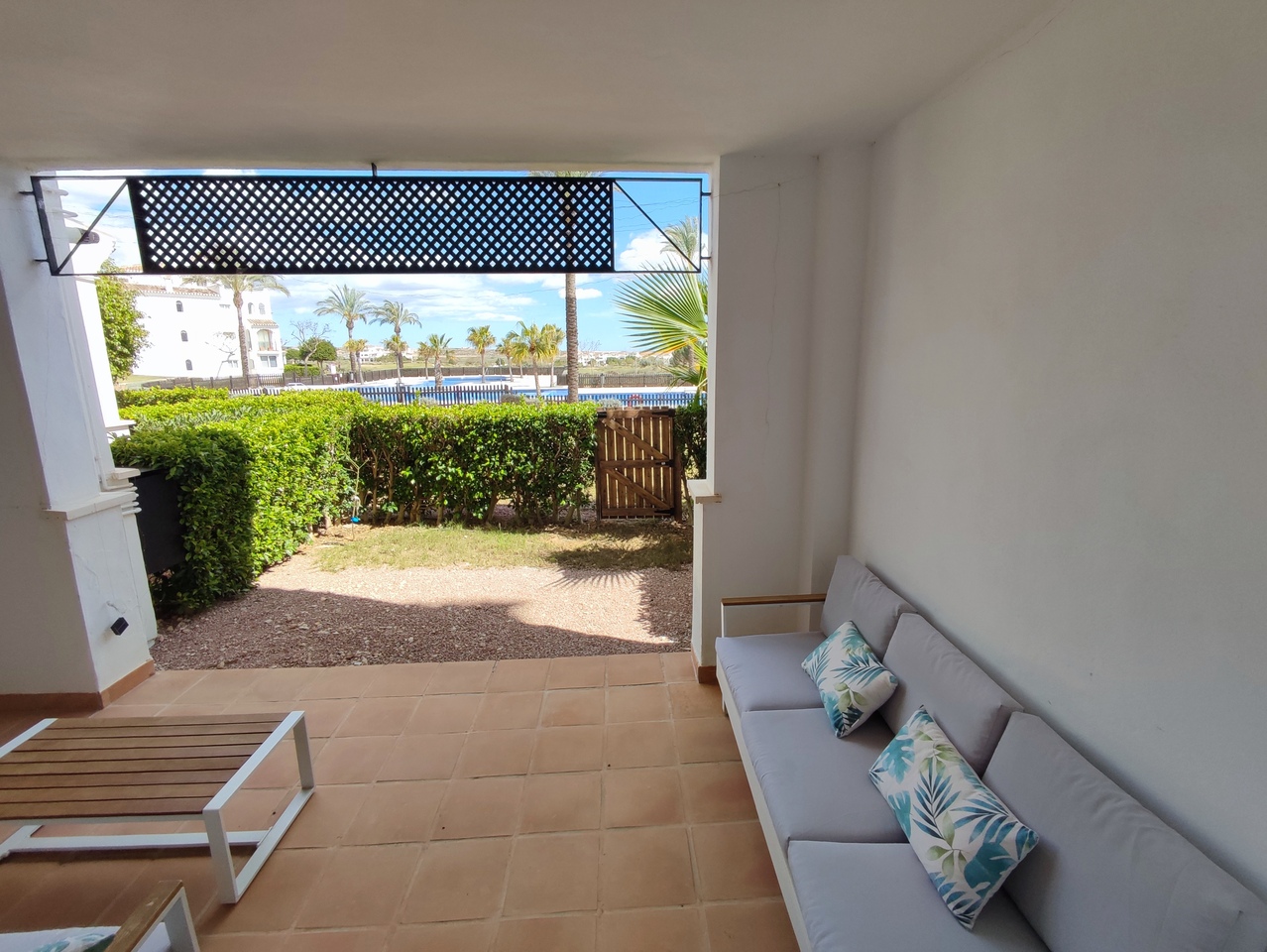 Welcome to this beautiful ground floor apartment sold fully furnished.It consists of a lounge and dining area , 2 double bedrooms with built in wardrobes, kitchen and the largest bathroom sizes complete with bath and shower screen,outside there is a large tiled covered terrace that over looks the largest pool on the resort. The garden area consists of part gravel ,part grass with Bougainville, jasmine and a small lemon tree.The apartment has had a number of upgrades and added extras,  The kitchen has recently been upgraded and comes with new appliances (washing machine,dishwasher, electic hob and oven. The apartment also has new air conditioning units fitted throughtout and also has ceiling fans in the bedrooms. Mosiquitto nets have also been fitted.The first thing that impresses you about Hacienda Riquelme Golf Resort is the wide-open spaces, the extensive gardens and the low-density construction, which create a relaxing environment to enjoy a very safe and peaceful life or holiday. The apartments are set out spaciously around the magnificent and challenging 18 hole golf course part of the Jack Nicklaus Golf Trail.All apartments have unlimited internet, air-conditioning for summer and heating for winter, private underground parking space and a communal lift.In the heart of the resort you will find the beautiful renovated Hacienda where you will find a supermarket, clubhouse, restaurant and bar. The inner court yard becomes the hive of entertainment in the Summer, whilst the large terrace set in the stunning gardens is open all year for “al fesco” dining and drinking.Facilities:Gated Community.24 hour security."El Cason" Bar, Restaurant, Clubhouse. "Sips" Coffee ShopSupermarket.Summer Entertainment.19 large community swimming pools.Communal gardens.Trees, 5 lakes.Wild flowers & local wildlife.Driving range & Golf ShopTennis courts.Paddle tennis courts.Football / Basketball court.Outside gym area.Children's play areas.Hacienda Riquelme is very well connected by the main motorways. Murcia Airport (20 mins)Mar Menor beaches (15 mins)Mediterranean beaches (20 mins)For those who like historical buildings, architecture or a desire to shop, the lovely cities of Murcia and Cartagena provide plenty of entertainment. Murcia (30 mins)Cartagena (45 mins) Murcia Airport (20 mins)Near to the bustling popular village of Sucina with shops, restaurants, bars, chemist, supermarket and lots more (5 minutes)For more information on the apartments available please contact us.