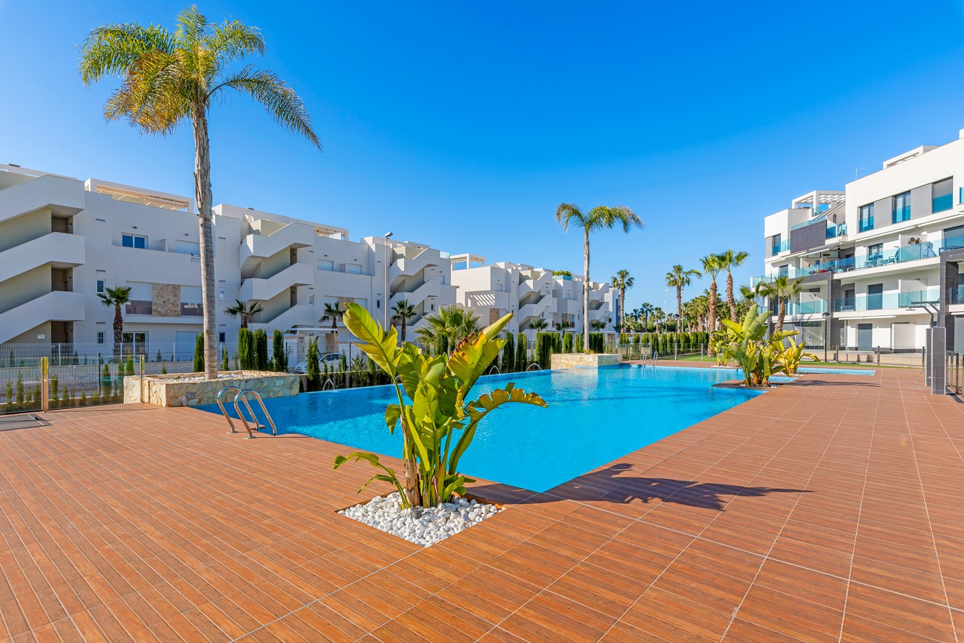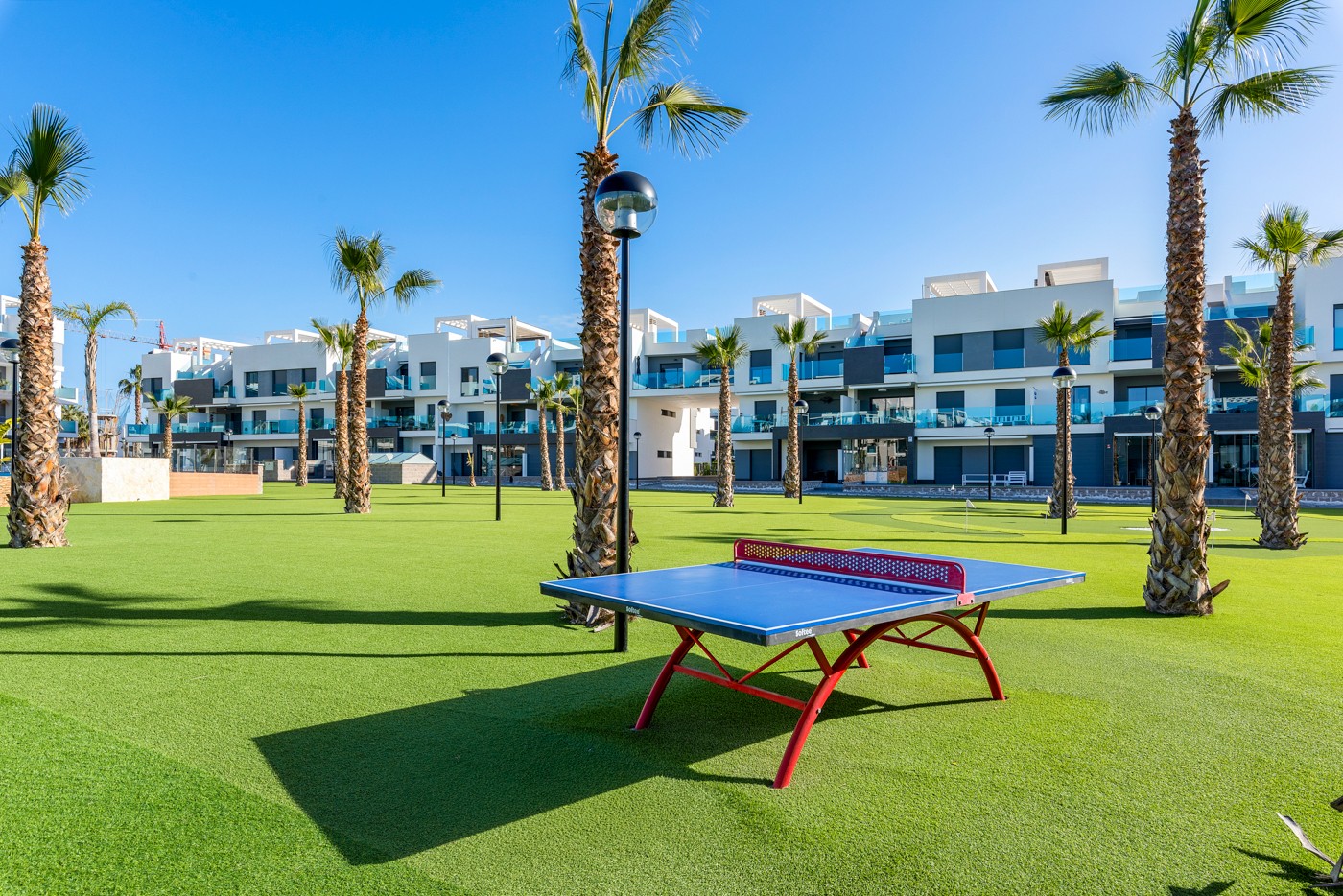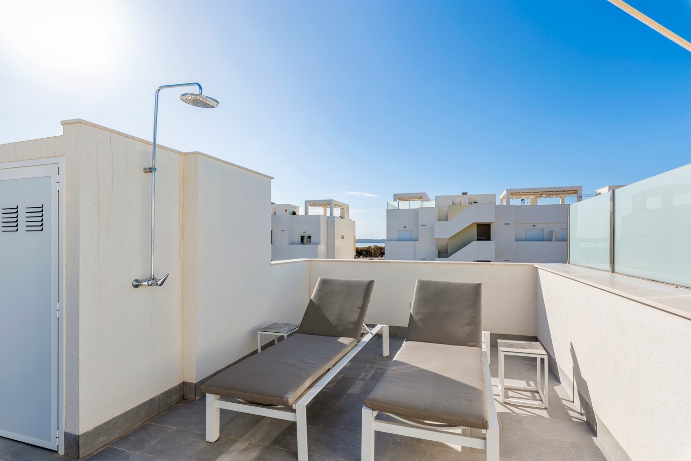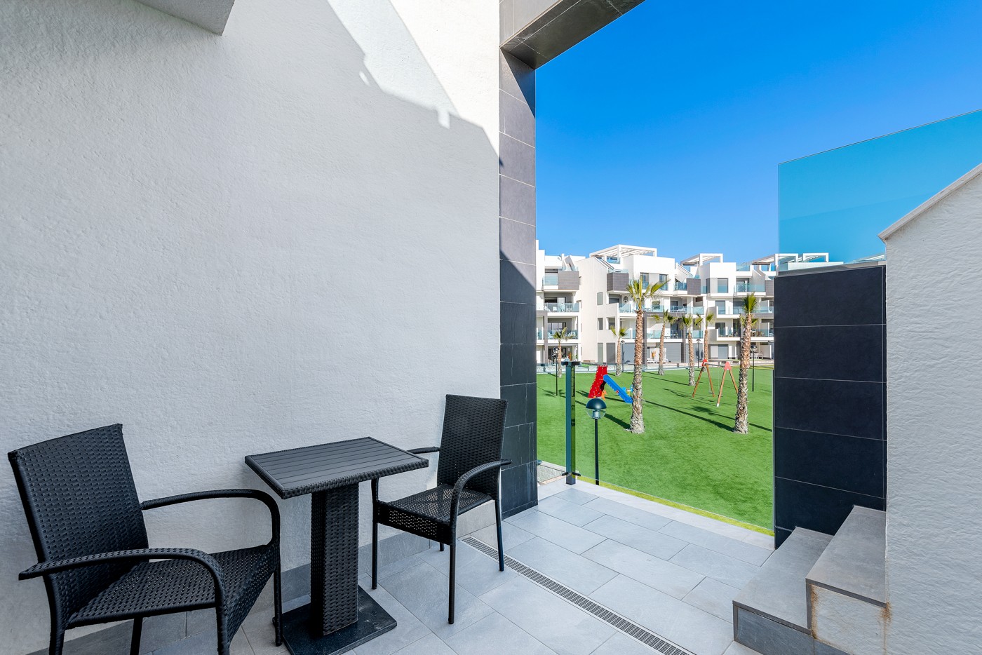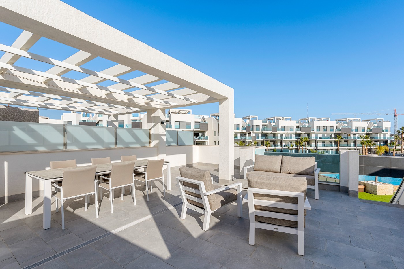 This stunning property is located in a modern residential complex in El Raso, Guardamar del Segura. The home features two bedrooms, two bathrooms, and a spacious open-plan living room with a kitchen. Situated on the top floor, it includes a private solarium with a canopy. The residential complex is designed for comfort and relaxation, offering amenities such as a large swimming pool, green areas, golf courses, a spa, a playground, fitness equipment, and sports facilities. The surroundings are green and tranquil, close to the salt lake and within walking distance of a commercial center, bars, and restaurants. El Raso is part of Guardamar del Segura, a town renowned for its natural beauty and extensive amenities. Guardamar is located on the Costa Blanca South and boasts eleven kilometers of natural beaches, surrounded by a large pine forest. The town features a harbor with year-round activities, a sports center with paddle tennis, tennis courts, football fields, and a heated pool that is accessible all year round. Additionally, there is a modern library where visitors can enjoy free Wi-Fi and computers. The strategic location of Guardamar del Segura, just twenty kilometers from Alicante - Elche Airport (El Altet), makes it an attractive destination. The airport offers daily connections to major European cities, contributing to the region's popularity among international buyers and tourists.