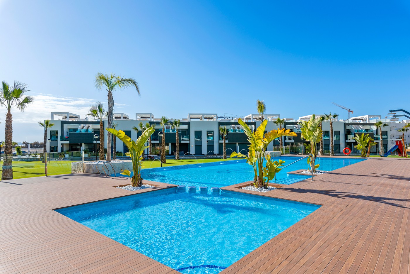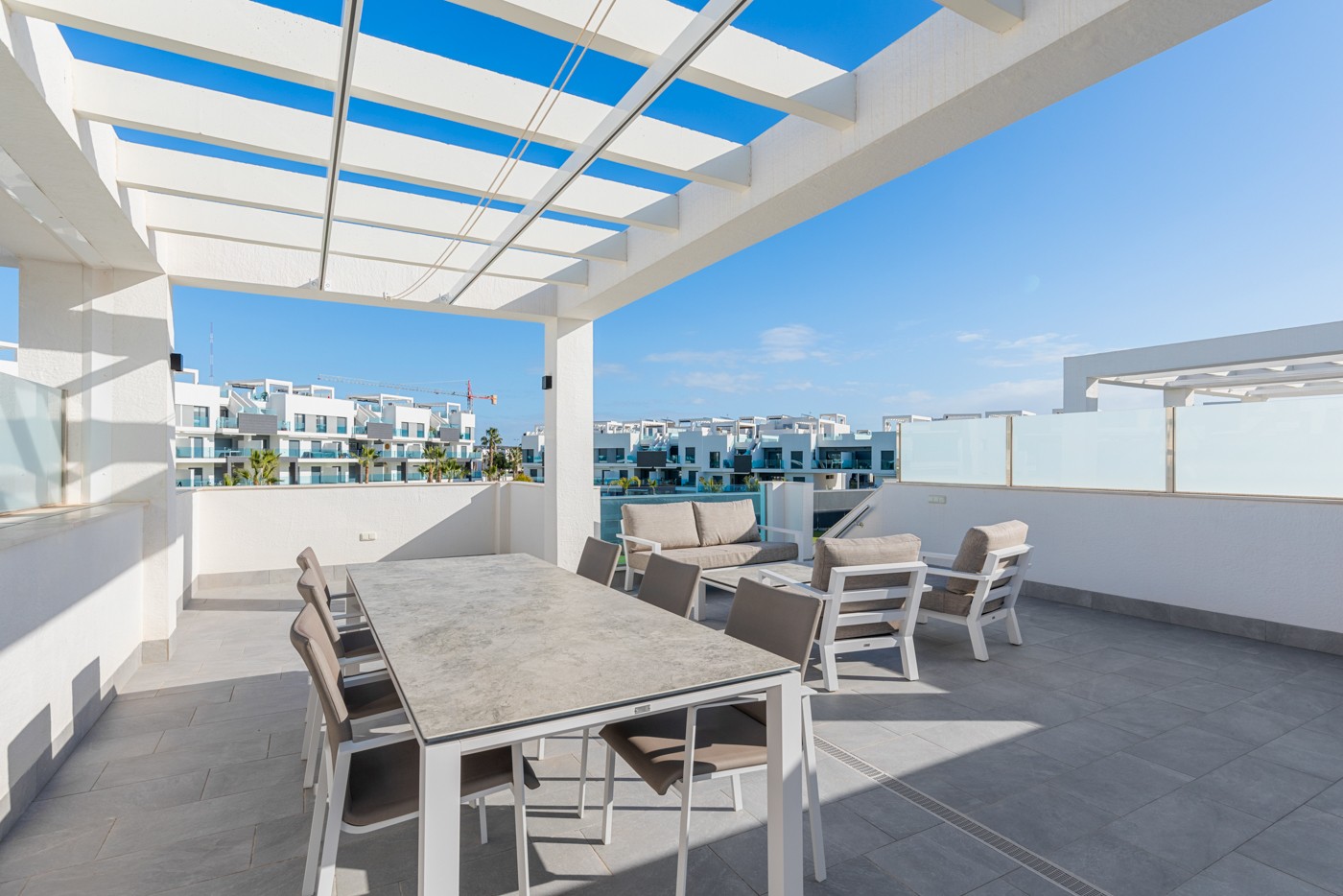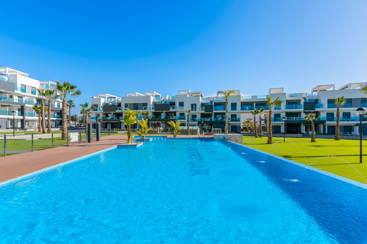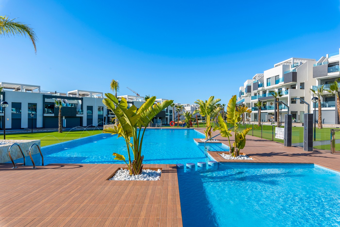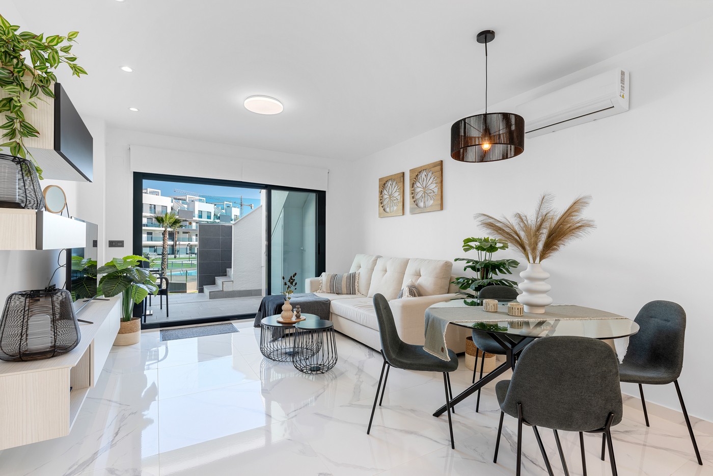 This stunning property is located in a modern residential complex in El Raso, Guardamar del Segura. The home features two bedrooms, two bathrooms, and a spacious open-plan living room with a kitchen. Situated on the top floor, it includes a private solarium with a canopy. The residential complex is designed for comfort and relaxation, offering amenities such as a large swimming pool, green areas, golf courses, a spa, a playground, fitness equipment, and sports facilities. The surroundings are green and tranquil, close to the salt lake and within walking distance of a commercial center, bars, and restaurants. El Raso is part of Guardamar del Segura, a town renowned for its natural beauty and extensive amenities. Guardamar is located on the Costa Blanca South and boasts eleven kilometers of natural beaches, surrounded by a large pine forest. The town features a harbor with year-round activities, a sports center with paddle tennis, tennis courts, football fields, and a heated pool that is accessible all year round. Additionally, there is a modern library where visitors can enjoy free Wi-Fi and computers. The strategic location of Guardamar del Segura, just twenty kilometers from Alicante - Elche Airport (El Altet), makes it an attractive destination. The airport offers daily connections to major European cities, contributing to the region's popularity among international buyers and tourists.