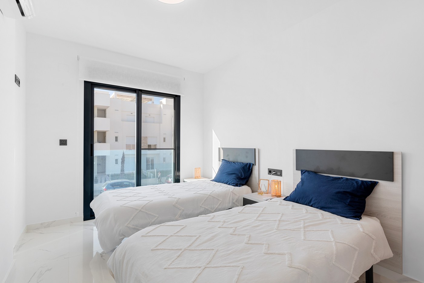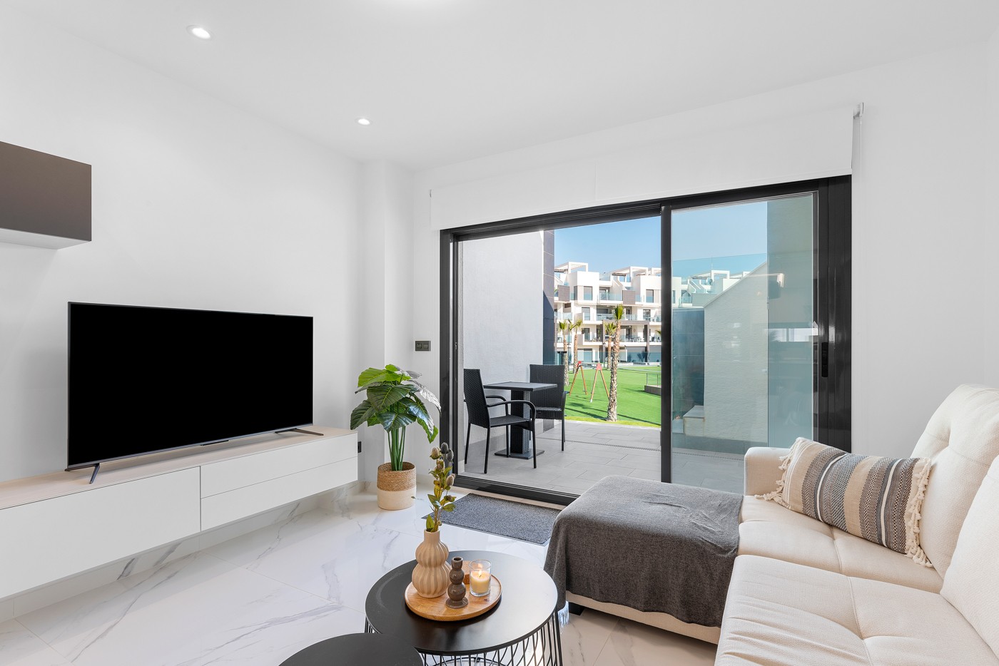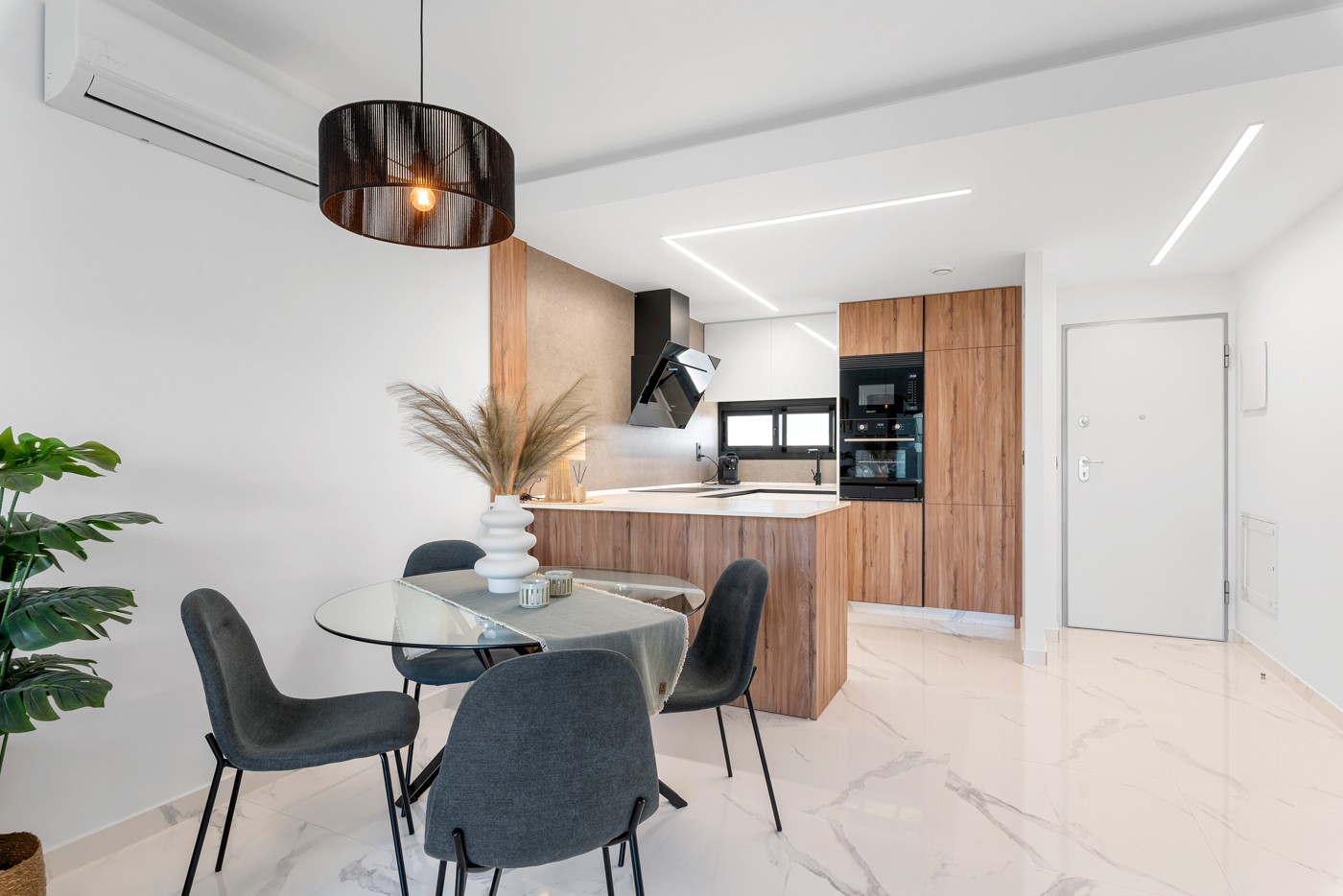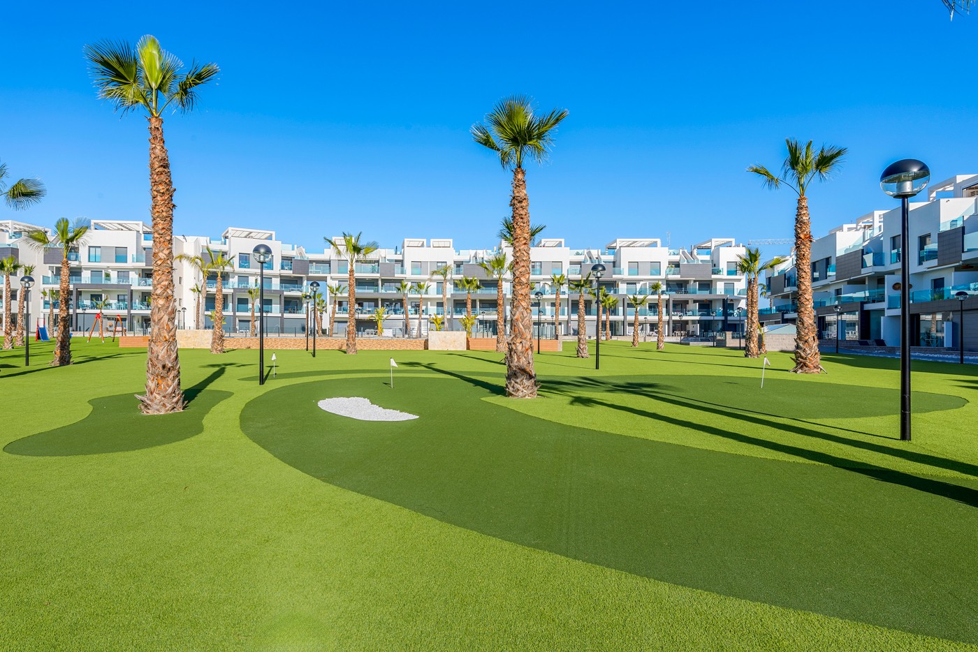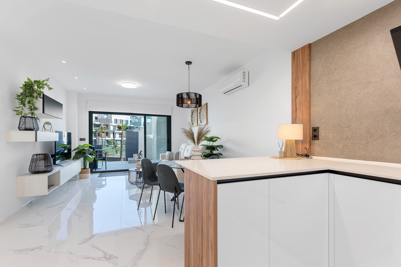 This stunning property is located in a modern residential complex in El Raso, Guardamar del Segura. The home features two bedrooms, two bathrooms, and a spacious open-plan living room with a kitchen. Situated on the top floor, it includes a private solarium with a canopy. The residential complex is designed for comfort and relaxation, offering amenities such as a large swimming pool, green areas, golf courses, a spa, a playground, fitness equipment, and sports facilities. The surroundings are green and tranquil, close to the salt lake and within walking distance of a commercial center, bars, and restaurants. El Raso is part of Guardamar del Segura, a town renowned for its natural beauty and extensive amenities. Guardamar is located on the Costa Blanca South and boasts eleven kilometers of natural beaches, surrounded by a large pine forest. The town features a harbor with year-round activities, a sports center with paddle tennis, tennis courts, football fields, and a heated pool that is accessible all year round. Additionally, there is a modern library where visitors can enjoy free Wi-Fi and computers. The strategic location of Guardamar del Segura, just twenty kilometers from Alicante - Elche Airport (El Altet), makes it an attractive destination. The airport offers daily connections to major European cities, contributing to the region's popularity among international buyers and tourists.