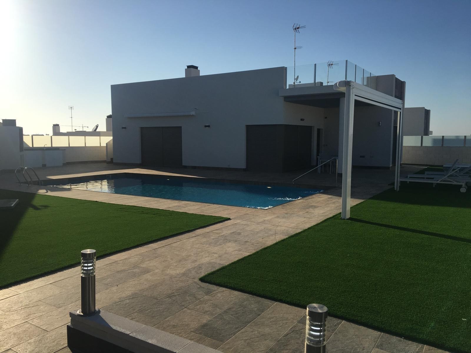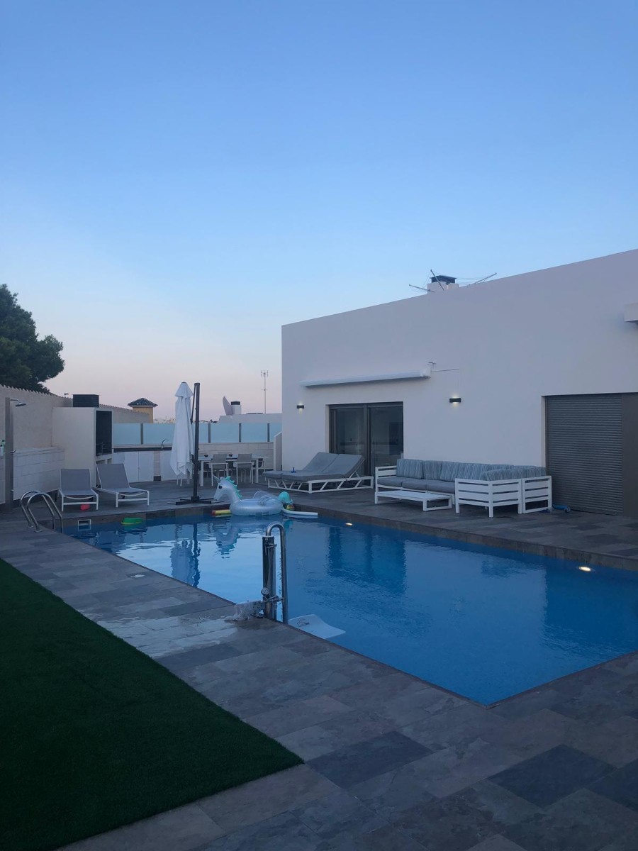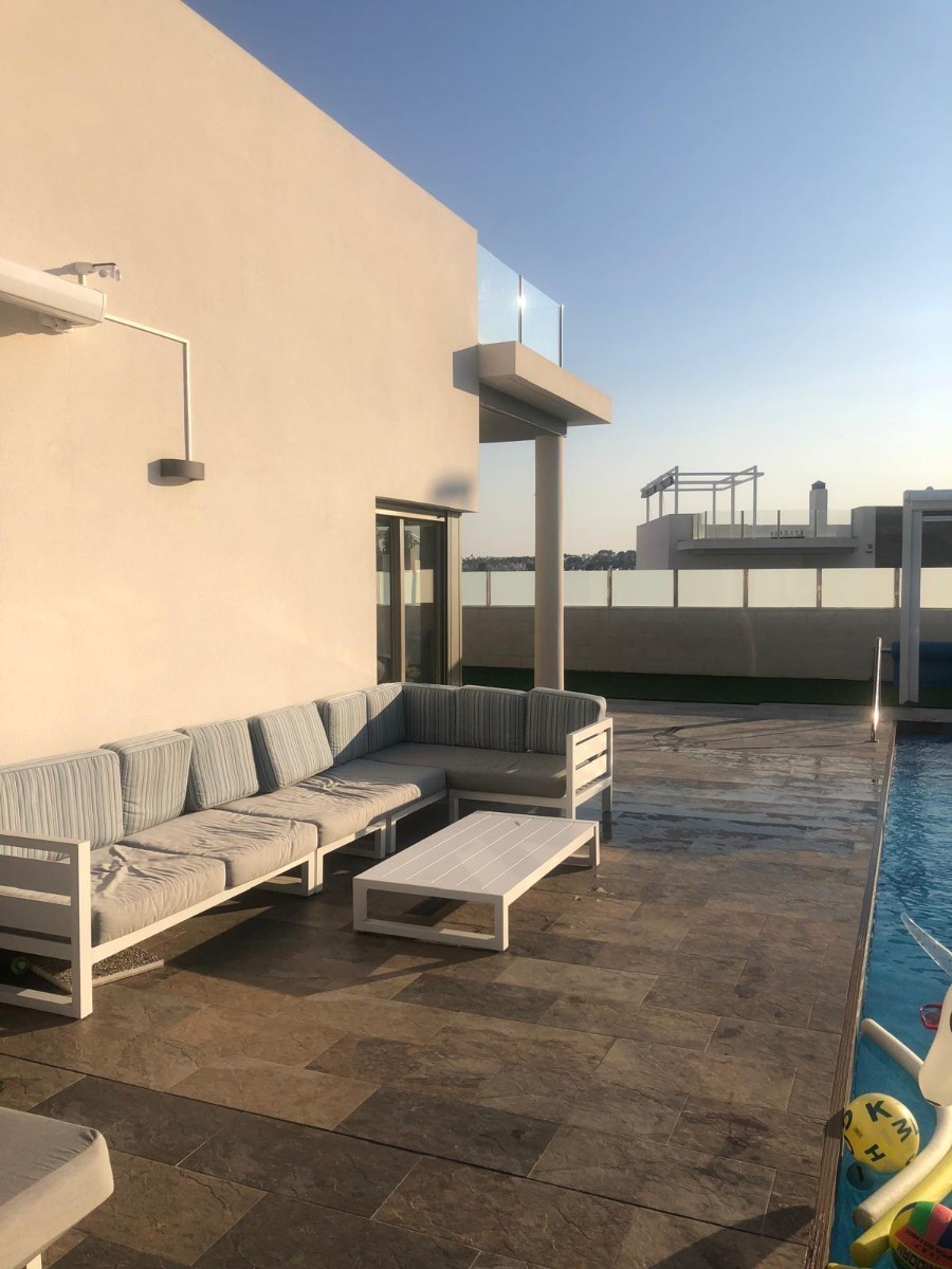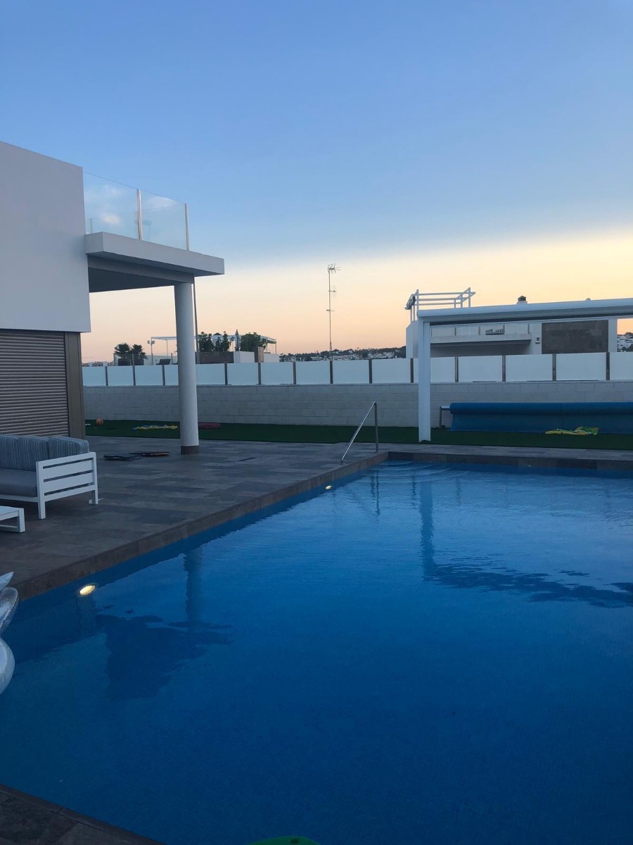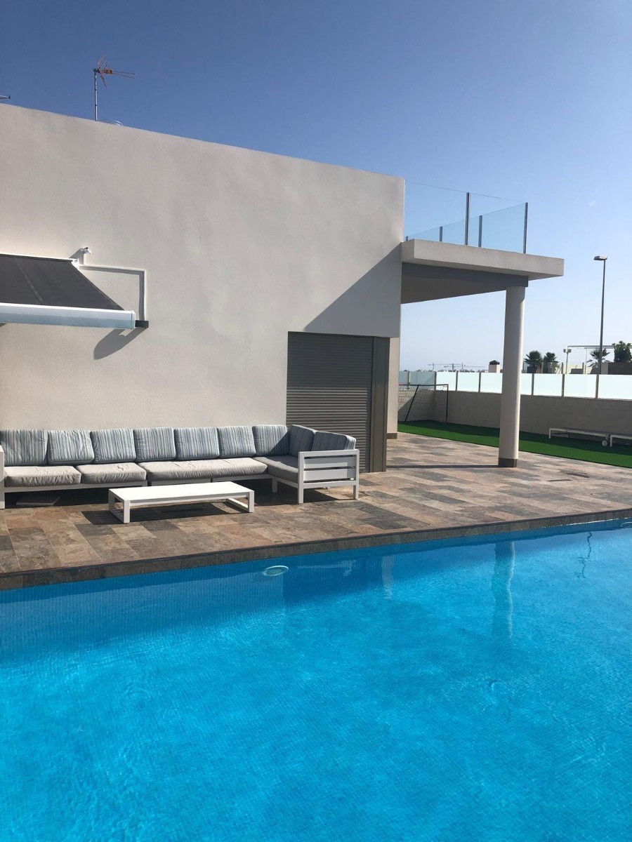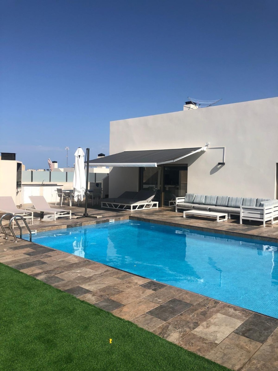Welcome to your dream home in Villamartin! This captivating 4-bedroom Innova villa, nestled in the Pau 8 area of Villamartin, epitomizes luxury living on a single level. Embrace the essence of opulence with a private swimming pool, expansive roof solarium, off-road parking, and a generously-sized L-shaped garden with covered terrace perfect for entertaining and unwinding. Step into a world of elegance with an open-plan lounge-dining area seamlessly connected to an American-style kitchen featuring top-notch built-in appliances, including a fridge-freezer and dishwasher. A separate utility room adds practicality to the sophisticated layout. The three bedrooms, adorned with ample fitted wardrobes, provide direct access to the garden, creating a seamless indoor-outdoor flow. Pamper yourself in the family bathroom, boasting a chic walk-in shower, while the master bedroom boasts an en-suite bathroom for an added touch of luxury. Revel in the abundance of natural light streaming through large windows, accentuating the spacious feel of the villa enhanced by high ceilings. Electric blinds add a modern touch, allowing you to effortlessly control the ambiance and privacy of each room. Indulge in year-round comfort with ducted hot and cold air-conditioning throughout the entire property, Additional convenience comes in the form of a discreet storage room at the rear of the villa. Ascend the external stairs to discover a colossal roof solarium spanning the entire footprint of the house. This impressive space features a seating area adorned with retractable awnings, offering a perfect spot to soak in the Spanish sunshine! Situated just 1km from an ALDI supermarket and the Via Park commercial centre, this villa ensures convenience at your fingertips. Enjoy a diverse range of bars and restaurants within reach, while the renowned Villamartin Plaza and golf course are just a few minutes' drive away. Seize the opportunity to elevate your lifestyle in this exceptional villa, where every detail exudes sophistication and comfort. Your dream home awaits!