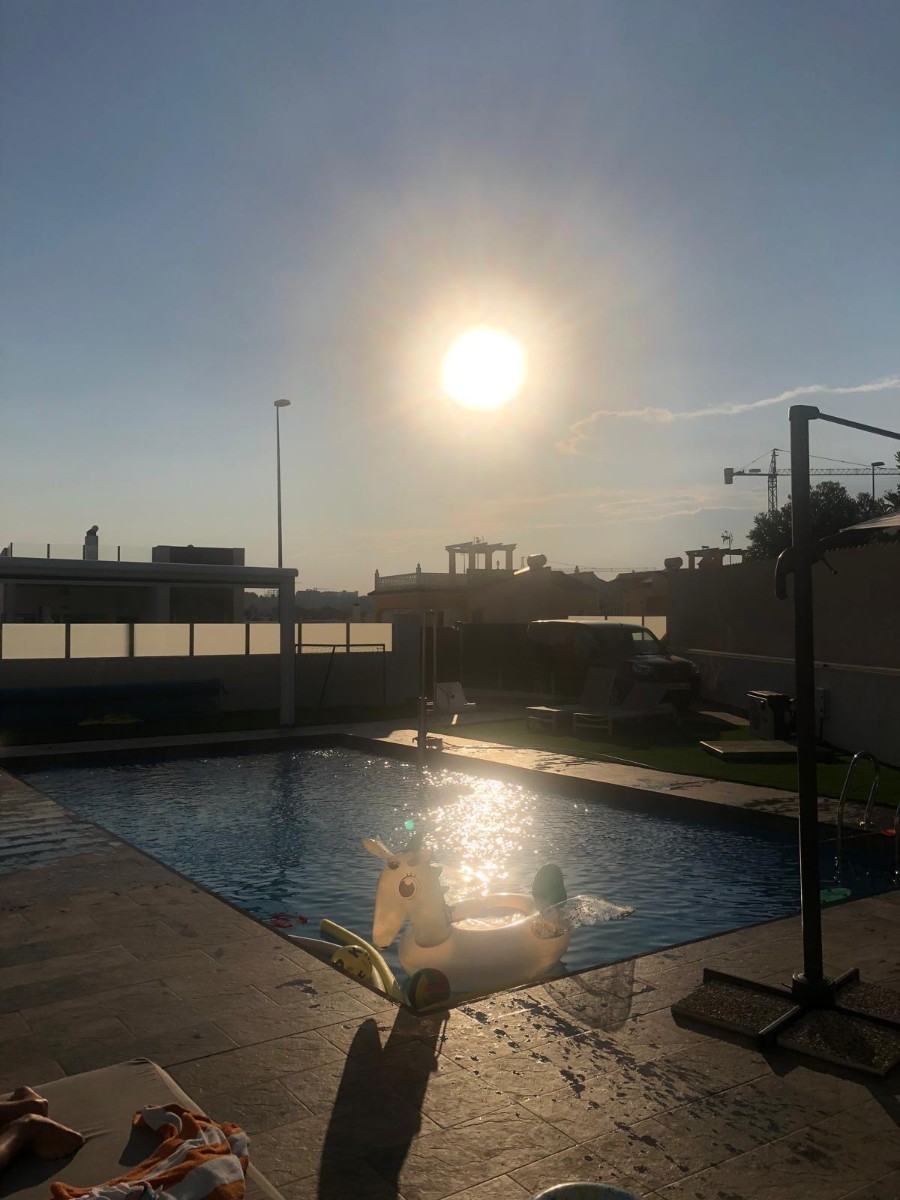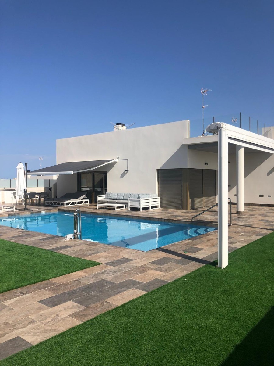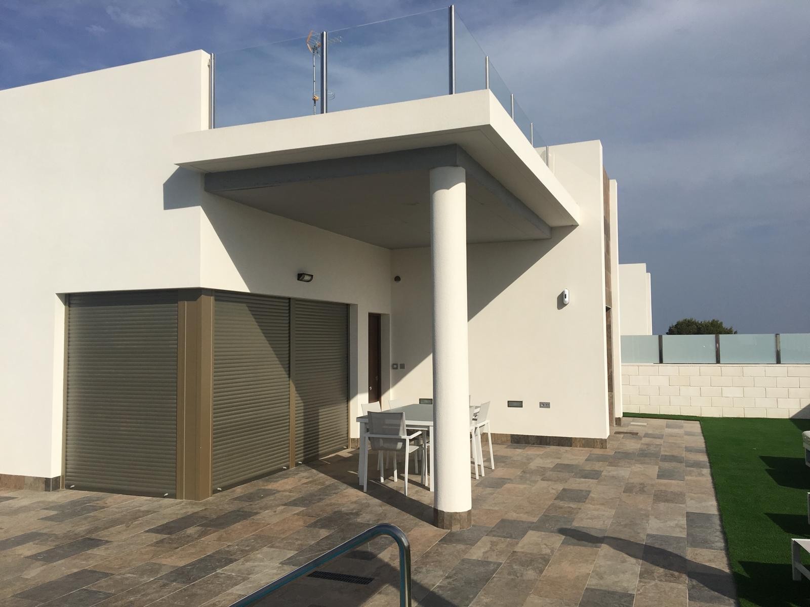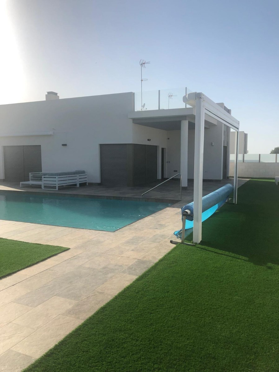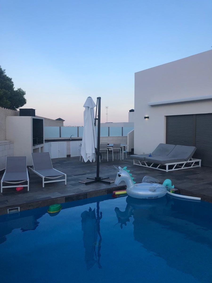 Welcome to your dream home in Villamartin! This captivating 4-bedroom Innova villa, nestled in the Pau 8 area of Villamartin, epitomizes luxury living on a single level. Embrace the essence of opulence with a private swimming pool, expansive roof solarium, off-road parking, and a generously-sized L-shaped garden with covered terrace perfect for entertaining and unwinding. Step into a world of elegance with an open-plan lounge-dining area seamlessly connected to an American-style kitchen featuring top-notch built-in appliances, including a fridge-freezer and dishwasher. A separate utility room adds practicality to the sophisticated layout. The three bedrooms, adorned with ample fitted wardrobes, provide direct access to the garden, creating a seamless indoor-outdoor flow. Pamper yourself in the family bathroom, boasting a chic walk-in shower, while the master bedroom boasts an en-suite bathroom for an added touch of luxury. Revel in the abundance of natural light streaming through large windows, accentuating the spacious feel of the villa enhanced by high ceilings. Electric blinds add a modern touch, allowing you to effortlessly control the ambiance and privacy of each room. Indulge in year-round comfort with ducted hot and cold air-conditioning throughout the entire property, Additional convenience comes in the form of a discreet storage room at the rear of the villa. Ascend the external stairs to discover a colossal roof solarium spanning the entire footprint of the house. This impressive space features a seating area adorned with retractable awnings, offering a perfect spot to soak in the Spanish sunshine! Situated just 1km from an ALDI supermarket and the Via Park commercial centre, this villa ensures convenience at your fingertips. Enjoy a diverse range of bars and restaurants within reach, while the renowned Villamartin Plaza and golf course are just a few minutes' drive away. Seize the opportunity to elevate your lifestyle in this exceptional villa, where every detail exudes sophistication and comfort. Your dream home awaits!
