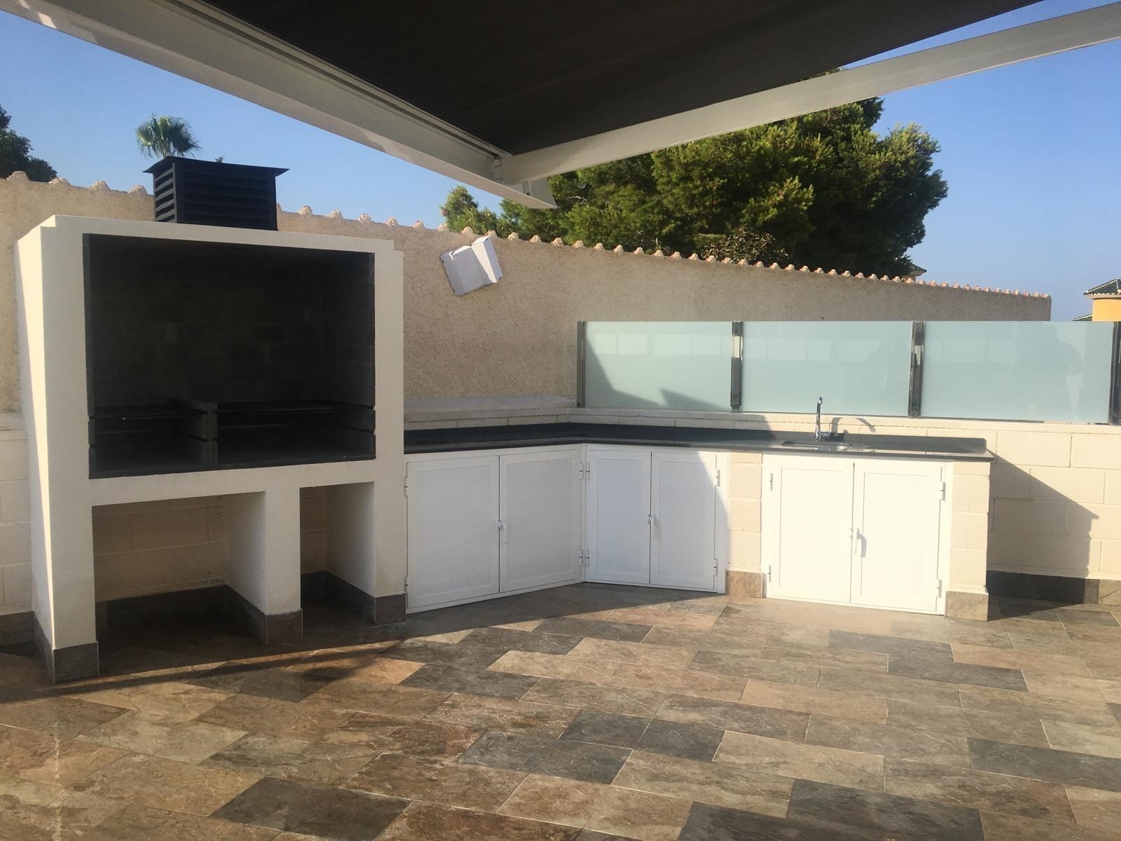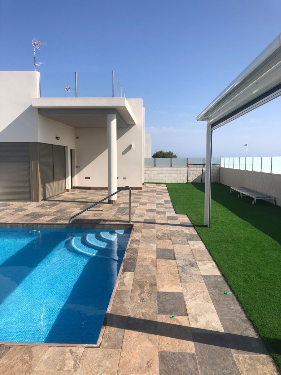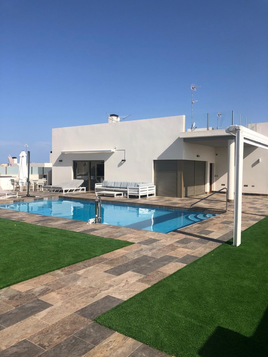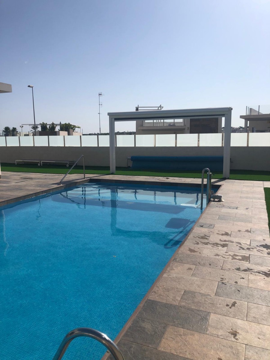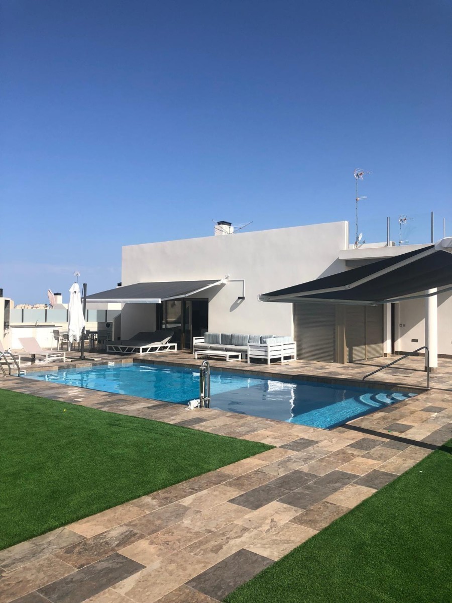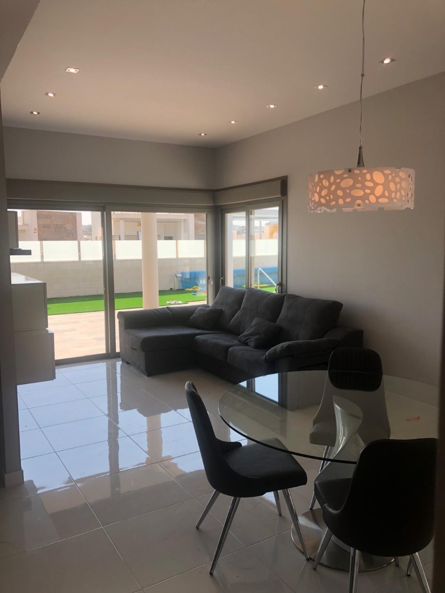 Welcome to your dream home in Villamartin! This captivating 4-bedroom Innova villa, nestled in the Pau 8 area of Villamartin, epitomizes luxury living on a single level. Embrace the essence of opulence with a private swimming pool, expansive roof solarium, off-road parking, and a generously-sized L-shaped garden with covered terrace perfect for entertaining and unwinding. Step into a world of elegance with an open-plan lounge-dining area seamlessly connected to an American-style kitchen featuring top-notch built-in appliances, including a fridge-freezer and dishwasher. A separate utility room adds practicality to the sophisticated layout. The three bedrooms, adorned with ample fitted wardrobes, provide direct access to the garden, creating a seamless indoor-outdoor flow. Pamper yourself in the family bathroom, boasting a chic walk-in shower, while the master bedroom boasts an en-suite bathroom for an added touch of luxury. Revel in the abundance of natural light streaming through large windows, accentuating the spacious feel of the villa enhanced by high ceilings. Electric blinds add a modern touch, allowing you to effortlessly control the ambiance and privacy of each room. Indulge in year-round comfort with ducted hot and cold air-conditioning throughout the entire property, Additional convenience comes in the form of a discreet storage room at the rear of the villa. Ascend the external stairs to discover a colossal roof solarium spanning the entire footprint of the house. This impressive space features a seating area adorned with retractable awnings, offering a perfect spot to soak in the Spanish sunshine! Situated just 1km from an ALDI supermarket and the Via Park commercial centre, this villa ensures convenience at your fingertips. Enjoy a diverse range of bars and restaurants within reach, while the renowned Villamartin Plaza and golf course are just a few minutes' drive away. Seize the opportunity to elevate your lifestyle in this exceptional villa, where every detail exudes sophistication and comfort. Your dream home awaits!