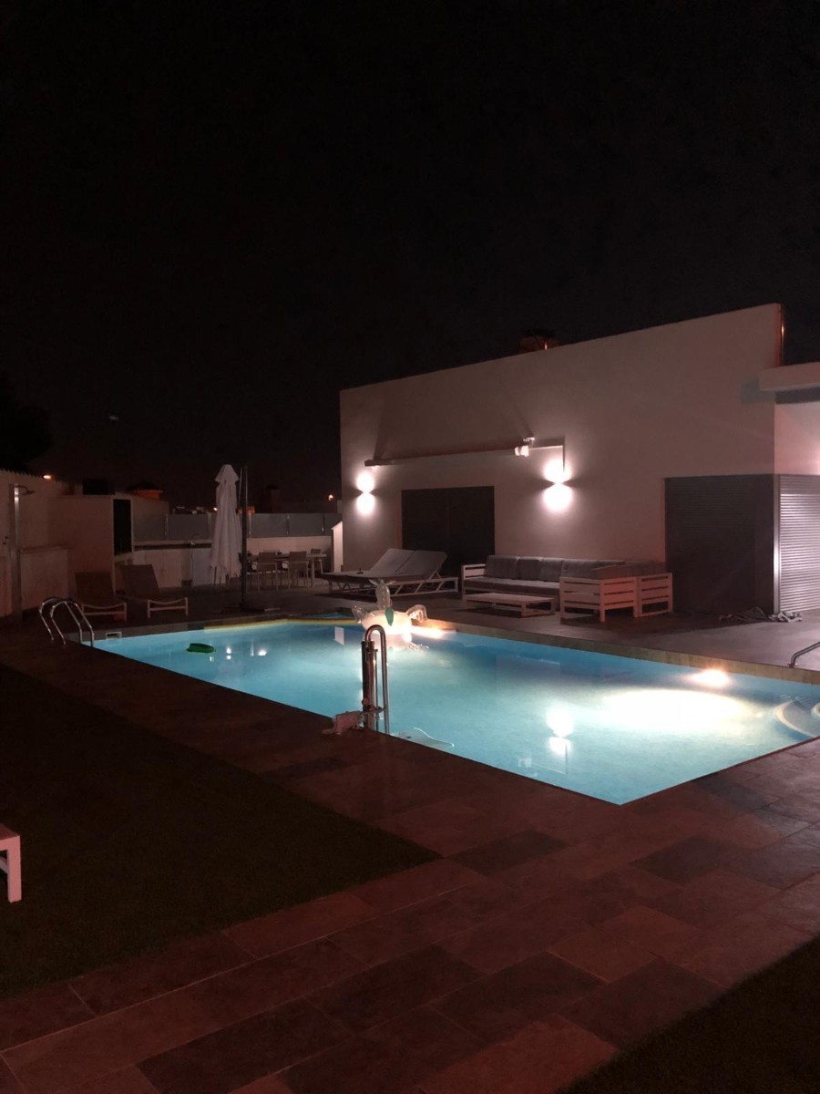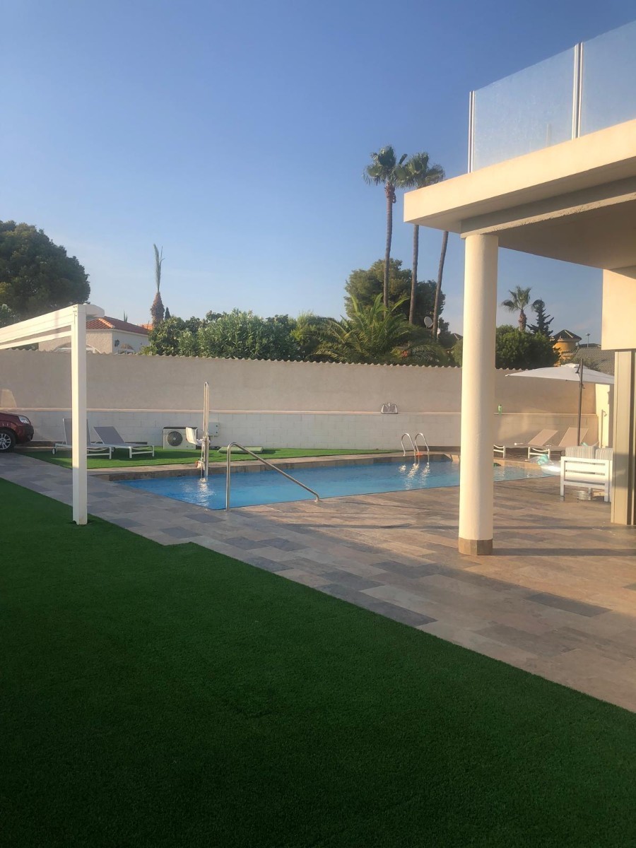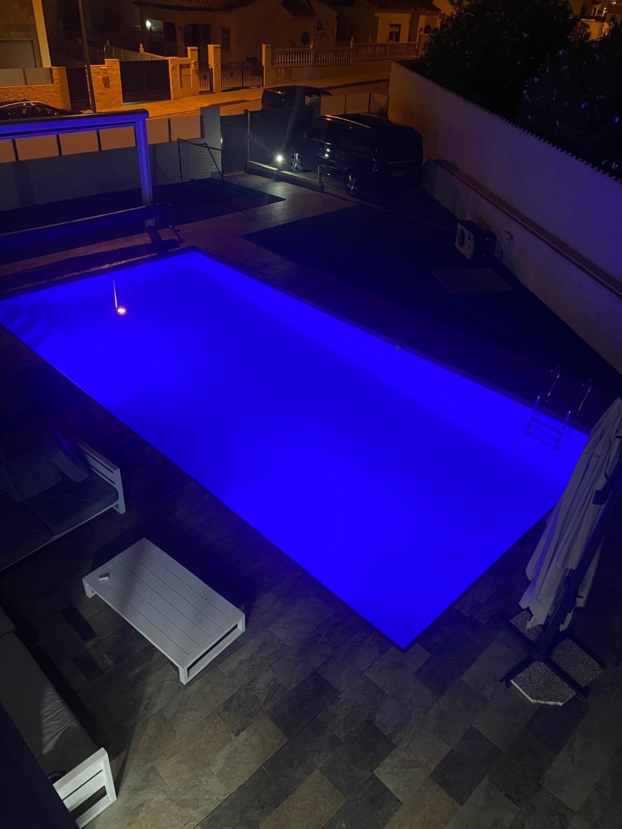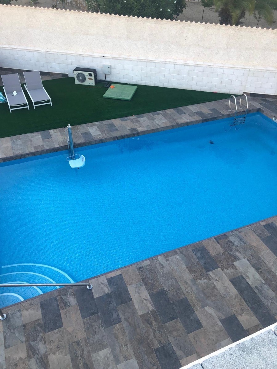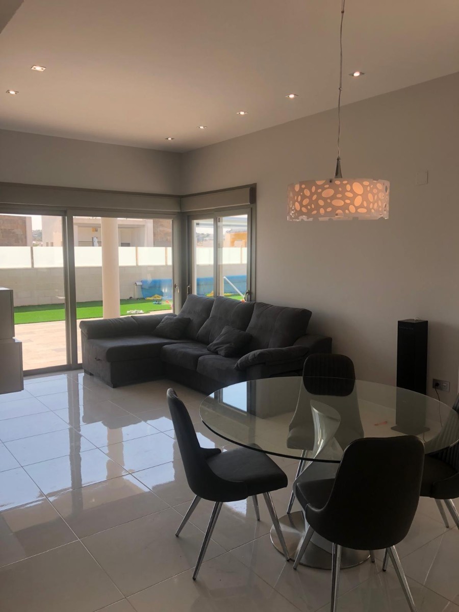 Welcome to your dream home in Villamartin! This captivating 4-bedroom Innova villa, nestled in the Pau 8 area of Villamartin, epitomizes luxury living on a single level. Embrace the essence of opulence with a private swimming pool, expansive roof solarium, off-road parking, and a generously-sized L-shaped garden with covered terrace perfect for entertaining and unwinding. Step into a world of elegance with an open-plan lounge-dining area seamlessly connected to an American-style kitchen featuring top-notch built-in appliances, including a fridge-freezer and dishwasher. A separate utility room adds practicality to the sophisticated layout. The three bedrooms, adorned with ample fitted wardrobes, provide direct access to the garden, creating a seamless indoor-outdoor flow. Pamper yourself in the family bathroom, boasting a chic walk-in shower, while the master bedroom boasts an en-suite bathroom for an added touch of luxury. Revel in the abundance of natural light streaming through large windows, accentuating the spacious feel of the villa enhanced by high ceilings. Electric blinds add a modern touch, allowing you to effortlessly control the ambiance and privacy of each room. Indulge in year-round comfort with ducted hot and cold air-conditioning throughout the entire property, Additional convenience comes in the form of a discreet storage room at the rear of the villa. Ascend the external stairs to discover a colossal roof solarium spanning the entire footprint of the house. This impressive space features a seating area adorned with retractable awnings, offering a perfect spot to soak in the Spanish sunshine! Situated just 1km from an ALDI supermarket and the Via Park commercial centre, this villa ensures convenience at your fingertips. Enjoy a diverse range of bars and restaurants within reach, while the renowned Villamartin Plaza and golf course are just a few minutes' drive away. Seize the opportunity to elevate your lifestyle in this exceptional villa, where every detail exudes sophistication and comfort. Your dream home awaits!