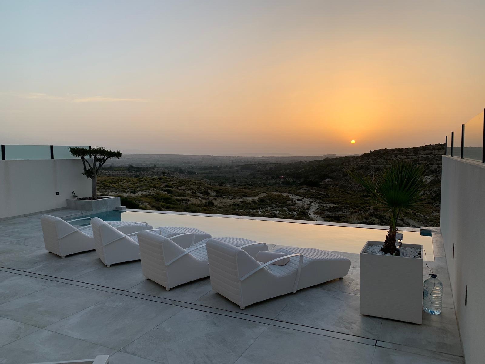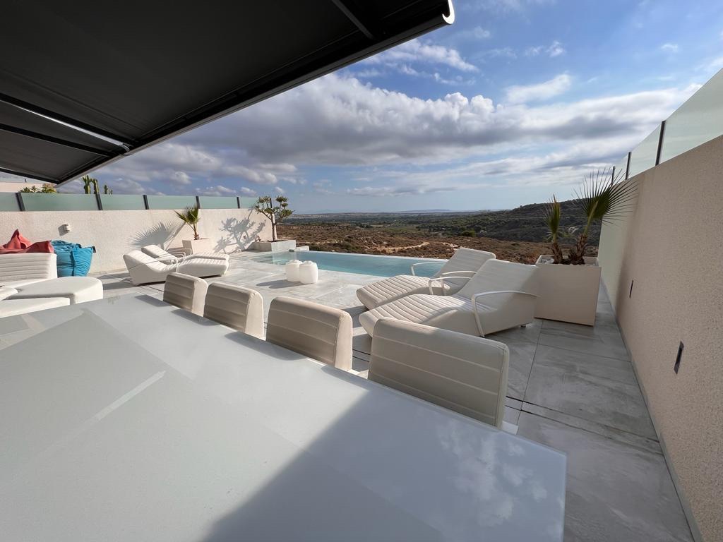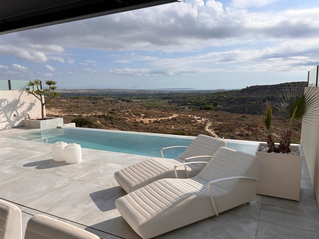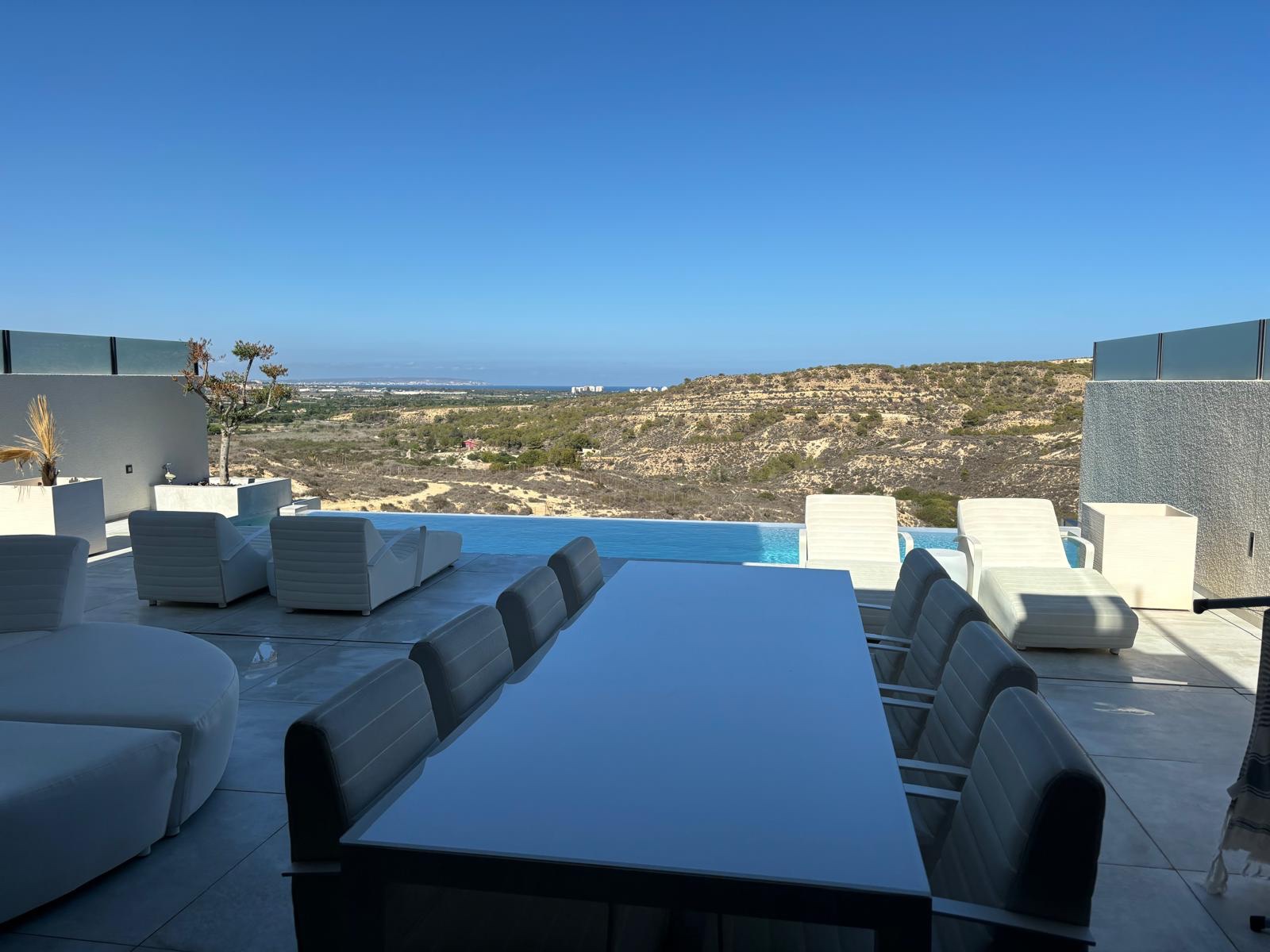 Welcome to this stunning luxurious villa, ideally located on the first line with unparalleled views over the El Recorral nature park. This exclusive property offers you a perfect blend of comfort, style, and functionality. Space and ComfortWith 5 spacious bedrooms and 5 stylish bathrooms, complemented by 2 separate guest toilets, this villa provides everything you need for a luxurious lifestyle. The large living room with an open kitchen is fully equipped with top-quality modern appliances, allowing you to enjoy both convenience and elegance. Some furniture is included. Versatile Ground FloorThe 300m2 ground floor features a spacious garage with room for multiple cars, a practical laundry area, and a versatile space perfectly suited for various purposes, from a gym to a home cinema. Patio and Terrace: Your Personal OasisA beautifully designed patio not only offers a charming outdoor space but also brings natural light to the ground floor. The terrace offers complete privacy and is equipped with a luxurious infinity pool and a solarium, where you can relax and enjoy the spectacular views. High-Quality FinishesThis villa is finished to the highest standards, with attention to detail in every corner. The bathrooms feature underfloor heating for added comfort, and the electric shutters are equipped with screens to provide a pleasant living environment all year round. The property is equipped with air conditioning for both heating and cooling, including Airzone technology, allowing you to control the temperature in each room individually. Additionally, there is a home automation system that enables you to control everything remotely. Your Dream Home Awaits!This unique property combines elegance, luxury, and functionality in an unrivaled location. Discover the perfect balance between nature and luxurious living in this magnificent villa.