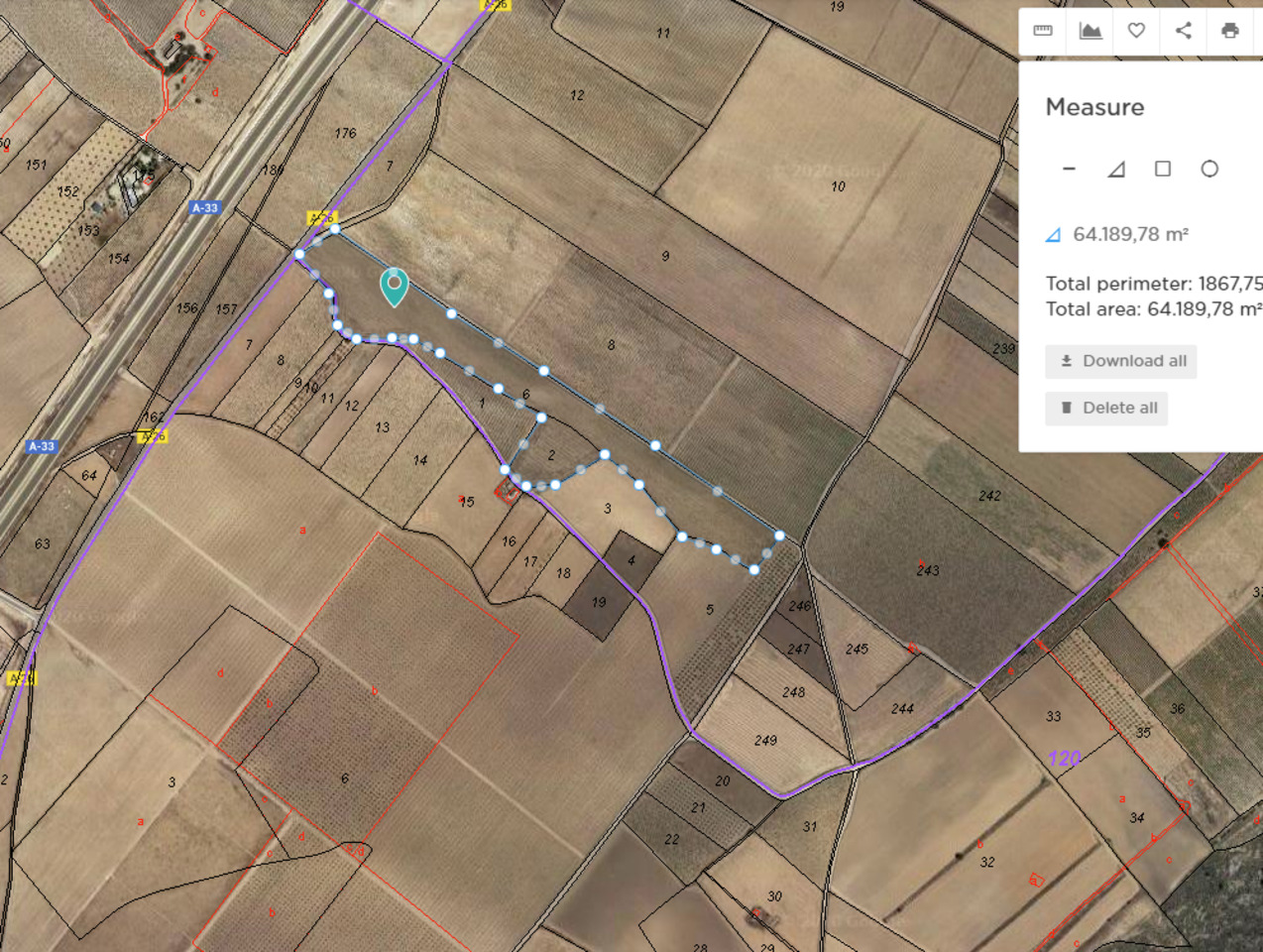 Building plot of land in Yecla, it has a main road frontage onto the A26 about 1km from its first junction from Yecla with the A33. This plot is just over 55,000m2, agricultural water is available but not connected and mains electricity is a few meters away which will need to be connected. Solar Panels would be ideal for this plot for those who want to be off-grid and energy-efficient. This plot and size of the land are ideal if someone wanted their stables, etc., and it is surrounded by many tracks ideal for hacking.