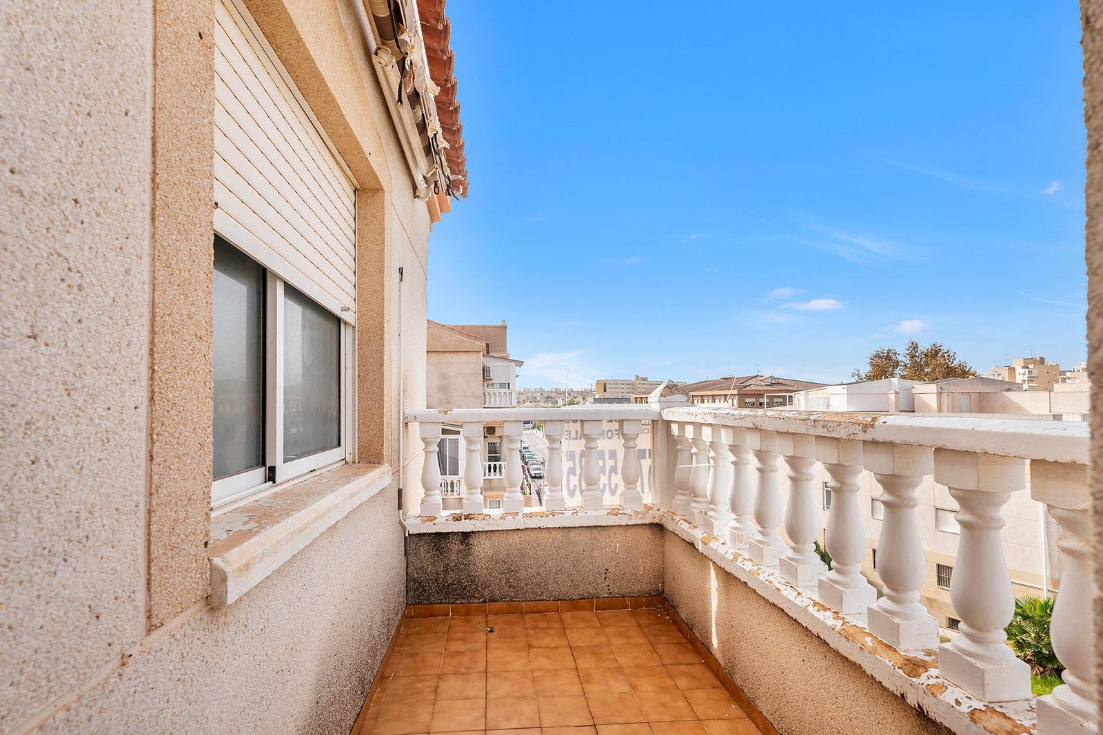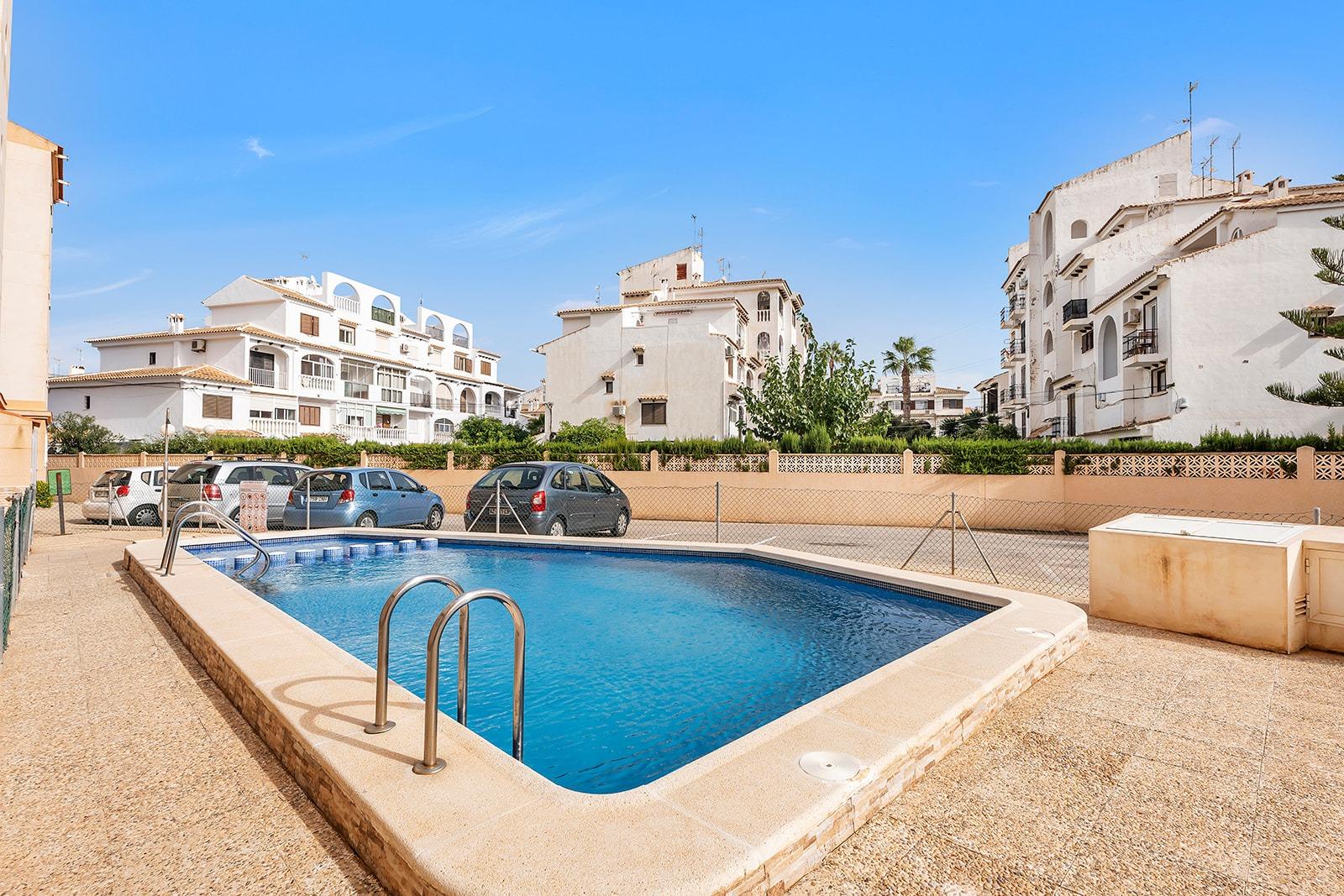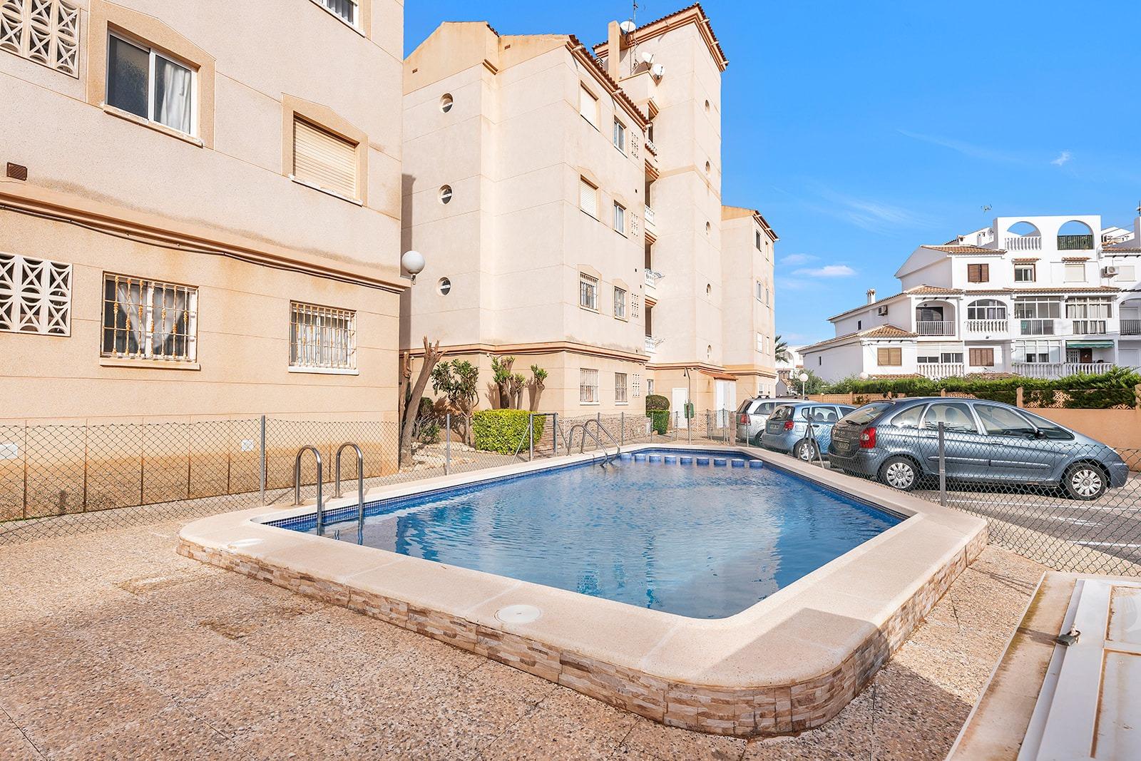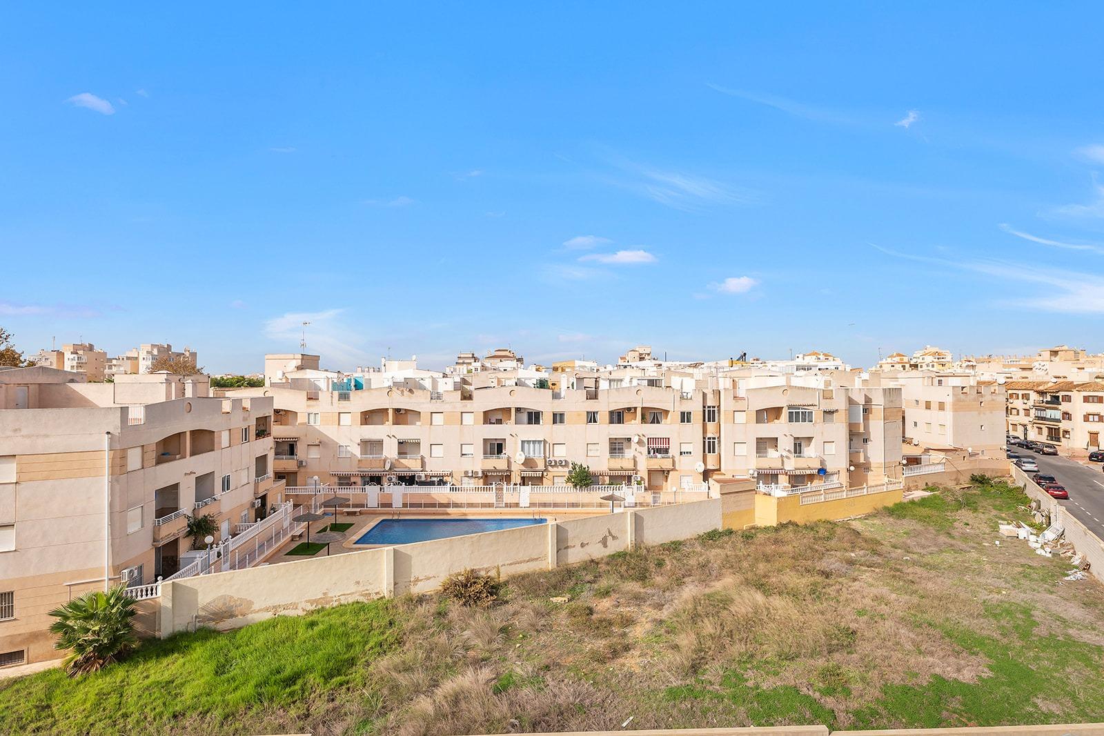 This is a great opportunity to purchase a property on the top floor of a four-storey building, with unobstructed views. It is an apartment with two bedrooms and one bathroom, an open-plan kitchen with a bar and a very bright living-dining room with access to a terrace of about 5 square metres. The building has a lift, a communal swimming pool and a surface parking area for residents. It is located in a quiet area of ​​Torrevieja, next to the Maestro Salvador Ruso school.