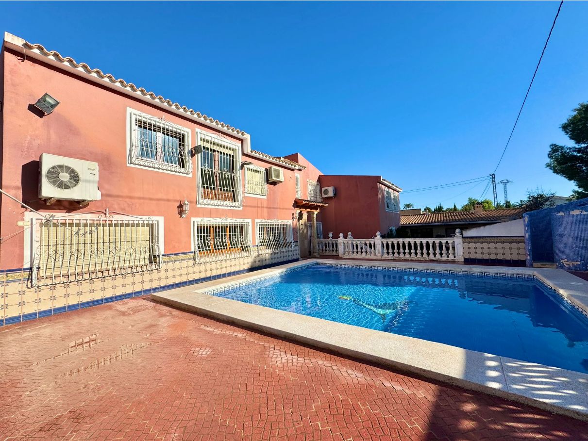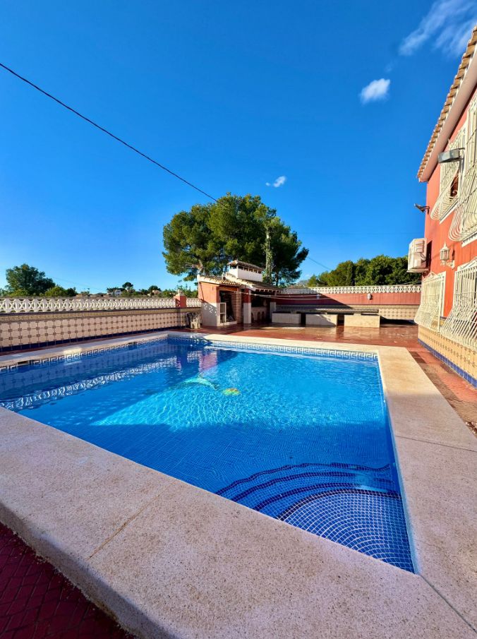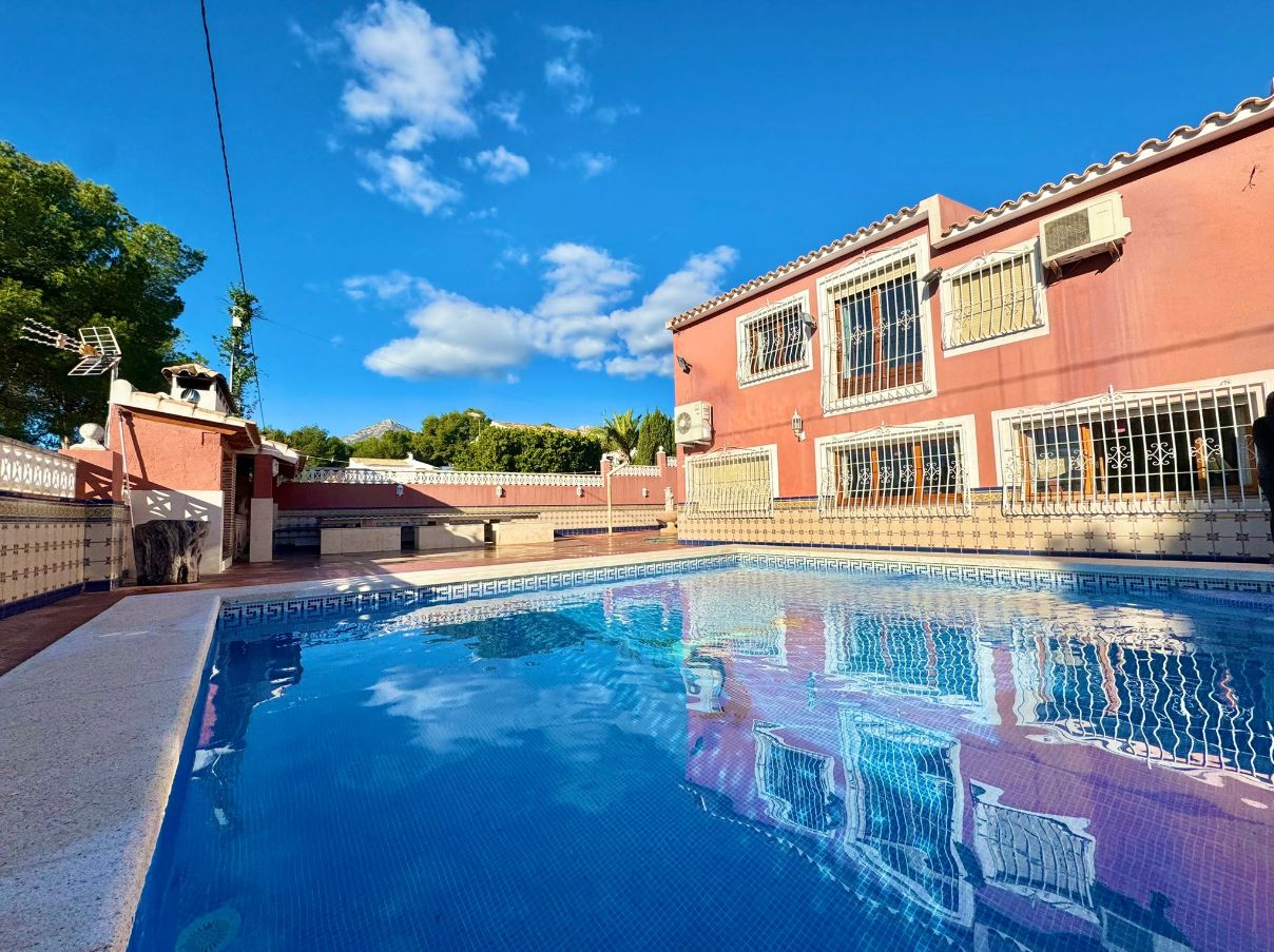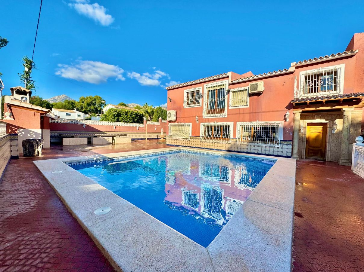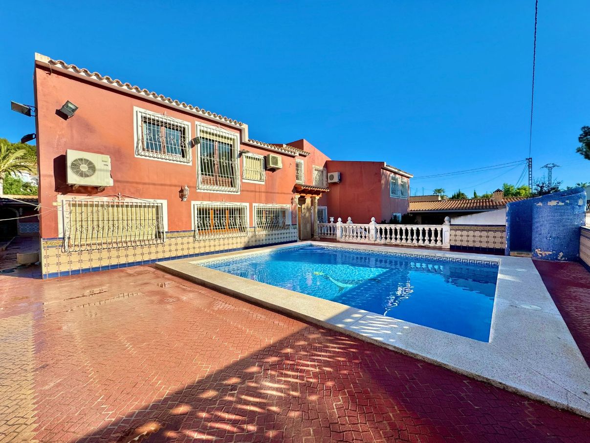 If you are looking to live in the best area of the Costa Blanca this villa is for you! We present this impressive villa located in a very quiet area of the Scandinavian area, very well connected to supermarkets, schools, shopping centers and other leisure areas. The Norwegian school is just a few minutes away.This Mediterranean design house has a south orientation, which makes it a very bright house. It has a plot of approximately 1200m2. The villa, which consists of about 800m2 built, will provide a lot of privacy to the family living there, due to the configuration of the house and the fact that it is positioned in a cul-de-sac that only the neighbors walk through.The outdoor areas and the pool area are south facing, so they are always sunny.This villa consists of a two-storey main house, separate guest house, kitchen, storage room, wine cellar, a huge parking area for 4-5 cars and a cabin garage, pool area and barbecue to delight family and friends.The guest house offers a completely independent home. It consists of 3 bedrooms, 2 full bathrooms, living-dining room and kitchen, all fully furnished and ready to move into. The main house was built on 2 floors. The ground floor will offer the buyer an infinite number of possibilities as it has a completely open space and can be modified and made to your liking. There is currently a toilet, a full bathroom, kitchen, pantry and a wine cellar.Going up to the upper floor we find the rest area. It has 4 bedrooms, 3 bathrooms, one of them with a jacuzzi, and a dressing room.If you have a remote job, don't worry as there is an office where you can work comfortably! Do not hesitate to contact us to arrange a visit!IBI 1100€