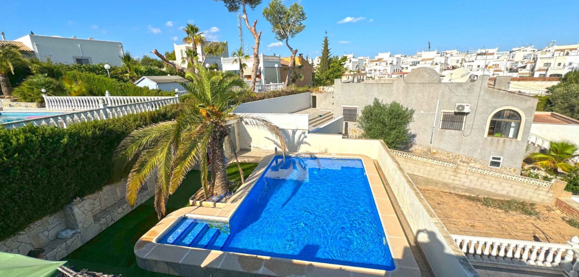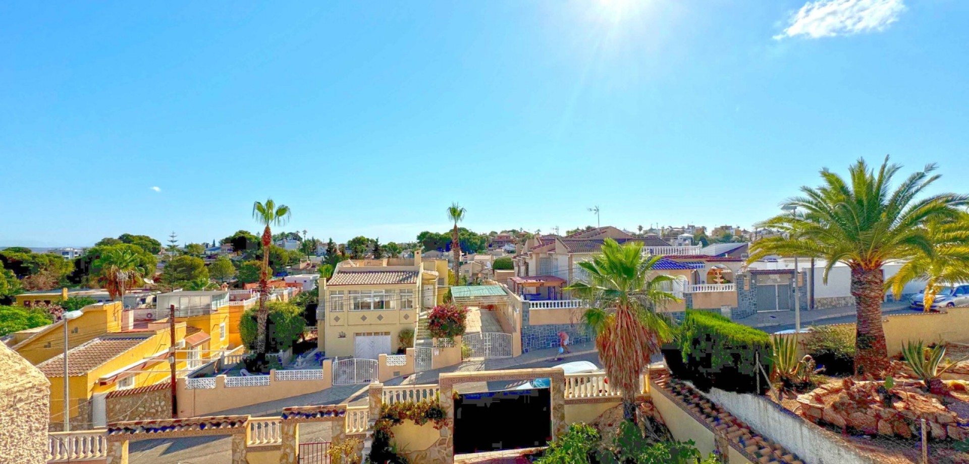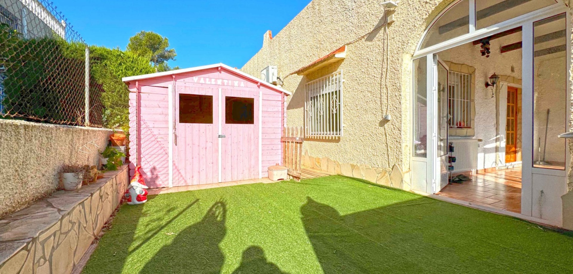 Charming Semi-Detached Villa in Los Balcones, Torrevieja – Your Dream Home Awaits! Welcome to this delightful semi-detached villa nestled in the sought-after area of Los Balcones, Torrevieja. This property offers a unique blend of comfort, privacy, and potential, making it the perfect home for both permanent living or a serene holiday retreat. Key Features: - Spacious Living: The villa boasts 2 cozy bedrooms, a full bathroom, and an additional WC, ensuring convenience for you and your guests. - Expansive Outdoor Space:The large garden is a true oasis, featuring a beautiful fig tree and thriving grapevines—perfect for enjoying the Mediterranean lifestyle. The private pool, with brand new equipment, invites you to cool off during the warm summer days, and the outdoor shower adds a touch of luxury to your outdoor experience. - Versatile Basement & Garage: The extensive basement provides ample space for storage, a workshop, or even the potential to add more bedrooms. The garage can easily accommodate a vehicle or be used for additional storage. Alternatively, if you’re looking to expand, this area offers plenty of options to create more living space. - Endless Potential: With the possibility to add another level on the solarium, you can further customize this home to meet your needs—whether it’s adding more bedrooms, creating a rooftop lounge, or simply expanding your living area. - Convenient Amenities: The property also includes a practical storage room and private parking, either in the garage or on the plot. The low annual IBI of just €240 is another attractive feature, making this an affordable choice. This villa offers a perfect combination of tranquility, privacy, and convenience, all within a vibrant community close to shops, restaurants, and the stunning beaches of Torrevieja. Don’t miss out on this rare opportunity to own a piece of paradise in Los Balcones—contact us today to arrange a viewing and see the full potential of this charming home!