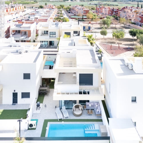 Welcome to your dream retreat in Los Montesinos, Alicante! These brand-new semi-detached villas offer the epitome of luxury living in the heart of the Costa Blanca. As you step into these stunning villas, you're greeted by a spacious layout designed for both comfort and elegance. The stylish exterior sets the tone for the exquisite interiors adorned with beautiful materials, creating a harmonious blend of sophistication and charm. Each villa boasts three bedrooms and three bathrooms, providing ample space for relaxation and privacy. The master suite is a sanctuary of indulgence, featuring a private ensuite bathroom and serene views of the surrounding landscape. Entertainment and relaxation await outdoors, where your own private pool beckons for refreshing dips on warm summer days. For those seeking panoramic vistas, the optional solarium offers breathtaking views of the tranquil lakes and verdant countryside, providing the perfect backdrop for unforgettable gatherings with friends and family. Convenience is key with private parking ensuring hassle-free access to your oasis of tranquility. Stay cool and comfortable year-round with pre-installed air conditioning, ensuring the perfect climate no matter the season. Situated in close proximity to both golf courses and vibrant city life, these villas offer the best of both worlds. Whether you're teeing off on world-class fairways or exploring the bustling streets of nearby towns, endless opportunities for leisure and adventure await just moments from your doorstep. Experience the pinnacle of Mediterranean living in these luxurious villas in Los Montesinos, where every day feels like a holiday in paradise. Plot sizes from 148-195 m2.
