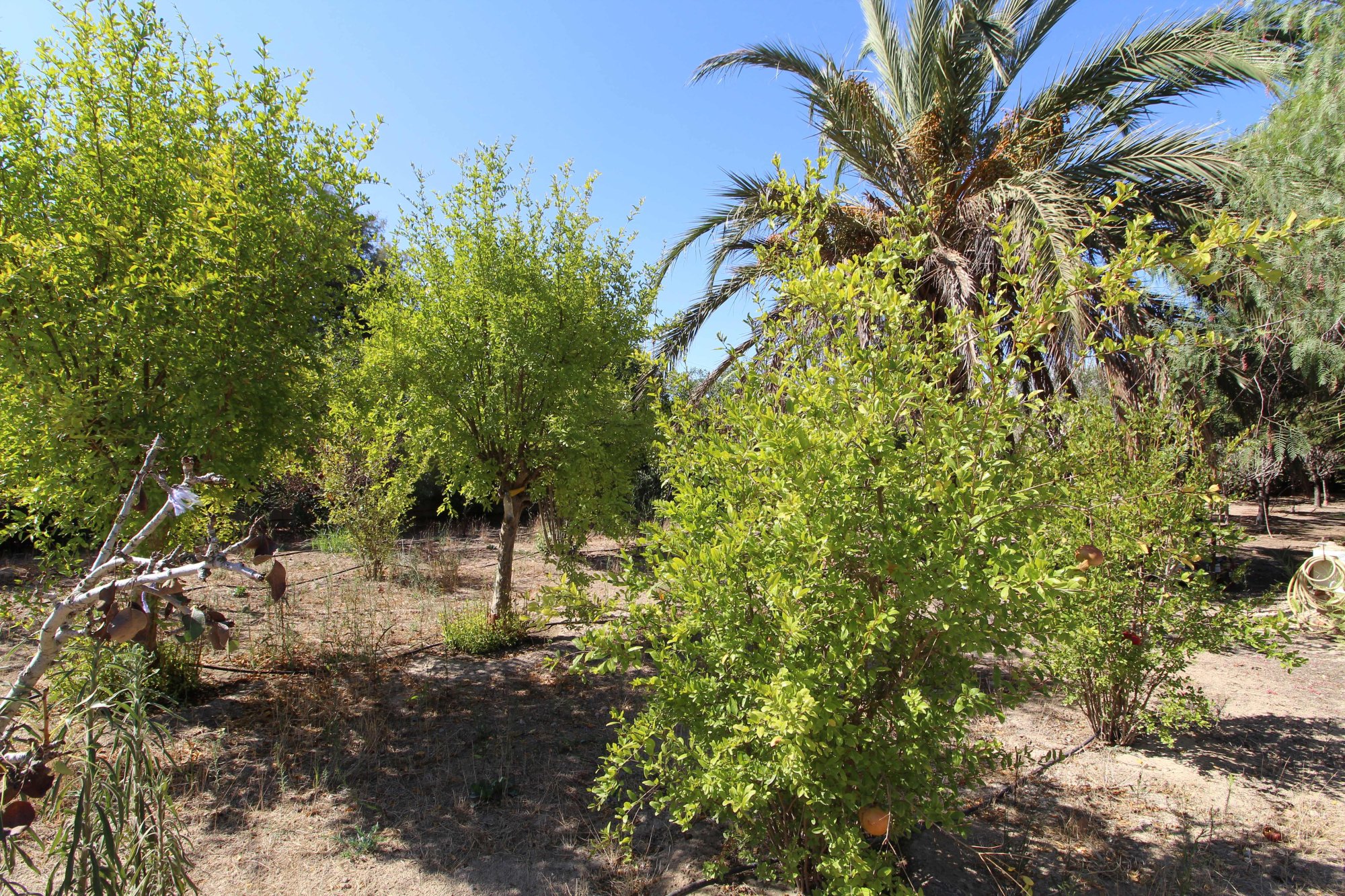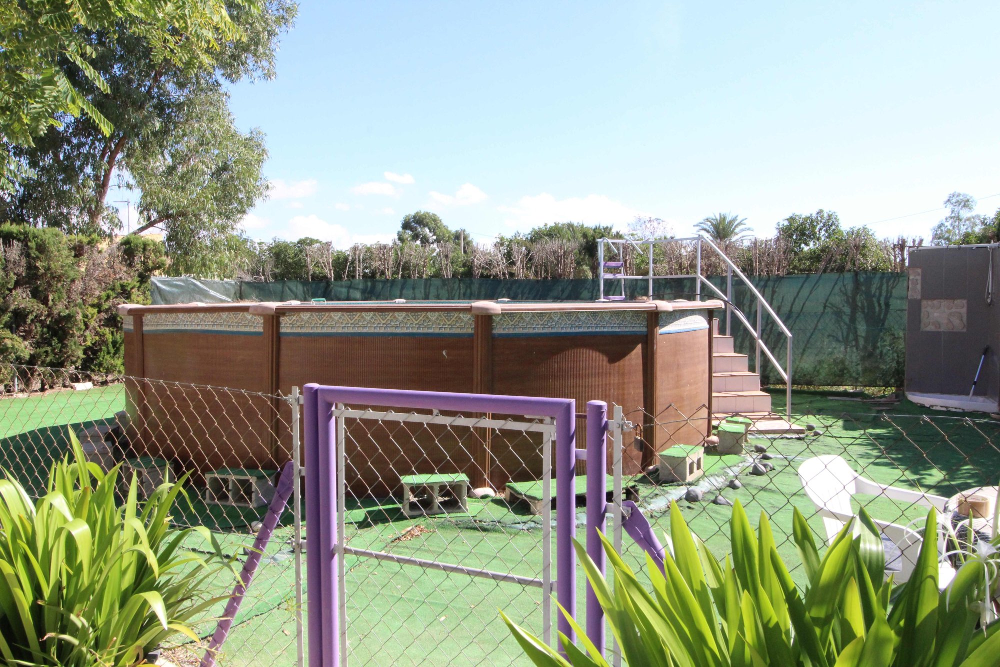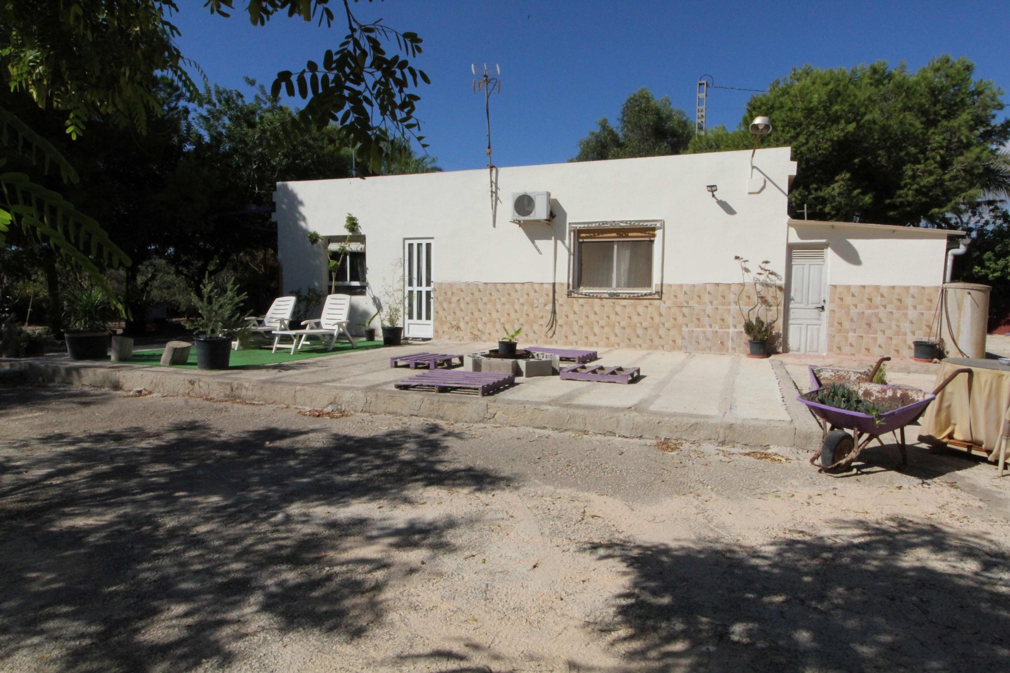Detached house or chalet, single-family home, 58 m2, with two additional outdoor areas. One of these is used as a second bedroom with a double bed, and the other area houses a second fully equipped kitchen with a barbecue. The main house has a living-dining room with large windows that let in light all day long. A new wood-burning stove (purchased in October 2024) heats the entire main house, as well as hot and cold air conditioning. The kitchen is fully equipped and well-sized, with a window that opens onto the living room. There is a dining table for four in the kitchen. Moving on to the bedroom, which has a double bed, a wardrobe, and access to the bathroom. The bathroom has a shower/bathtub and a second access door that leads to the garden, allowing guests to access the bathroom without having to go through the main room. The 2,000 m2 plot is fully fenced and hedged, providing a sense of privacy. It features a fenced, above-ground pool measuring 6 m in diameter x 1.20 cm high, with a built-in shed containing the easy-to-maintain, scheduled water treatment system, which runs three times a day, and an outdoor shower. The plot is home to many shade trees and various areas where a variety of fruit trees can be grown, including date palms, medlars, lemon trees, orange trees, quince trees, pomegranates, plum trees, and pear trees. There are also ornamental trees and Mediterranean plants such as pines, acacias, japonicas, Parkinsonias, eucalyptus, Brazilian pepper trees, black pepper trees, Washingtonias, jade trees, cacti, and succulents, all of which do not require much water. The plot has a drip irrigation system. Very importantly, the house has a certificate of no urban planning violations issued by Elche City Council technicians in autumn 2023. It also has an energy certification (2023), Iberdrola electricity, drinking water from Aigües de Elche, and irrigation water: a drip irrigation system for fruit trees and hose irrigation in other areas with water from the Segura Canal (separate meter). It has 1 cistern and 4 tanks to collect rainwater. There is also an area where sun loungers can be placed or used as a leisure area or even an outdoor dining area. The plot also has covered parking and/or a workbench. It has fiber optics for easy access and easy online work from home. The facades were painted in June 2025, a new electric water heater was installed in April 2025, a walkable solarium with waterproofed clay tiles was installed in April 2025, and new light sources were installed in April 2025. Privacy and tranquility in an area where all the neighbors live. It is located 4 km from the village of La Hoya (health center, pharmacies, supermarket, school, high school, dentist, restaurants, sports center, etc.). 6 km from La Marina de El Pinet Beach (natural park) and the El Hondo natural park and bird reserve. 13 km from Elche. 15 km from Santa Pola. The area is connected to Elche and La Marina by bus line R7 (every 45 minutes from 7:30 a.m. to 11:00 p.m. on weekends). The Inmaculada bus line connects you to Santa Pola and Guardamar del Segura. If you're a bike lover, there's also a bike lane to La Hoya and Santa Pola.