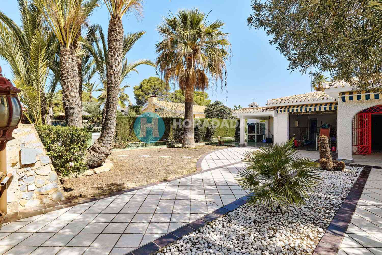 Fantastic opportunity to purchase a four bedroomed detached villa on a large plot in the very prestigious Dehesa de Campoamor. Positioned on a quiet road only a few minutes walk from the beach and an array of amenities This exceptional villa has a generous plot of 705m2 and a build of over 270m2 distributed over one floor.To the front of the villa is a beautiful mediterranean garden filled with palm trees and olive trees, and offers off street parking for several cars. The entrance to the villa is via a large covered terrace ideal for shade during the warm summer months, from here you step through the front door into a spacious entrance hallway. To the right hand side of the hallway is a large bright living and dining space with access to the garden. Leading off from the hallway straight ahead is a wide corridor which leads you to the rest of the rooms in the villa. There is a large independent kitchen to the left hand side and a bedroom with ensuite to the right. Further down the hall is a further three bedrooms another of which has an ensuite bathroom and dressing room. There is also a separate family bathroom. A garage can also be accessed from inside the villa.Part of a residential area, this villa benefits from use of a large swimming pool, padel courts, bar and garden.This charming traditional Spanish style villa is need of some modernisation to bring it up to date but once done would make an outstanding family home or luxury vacation villa.