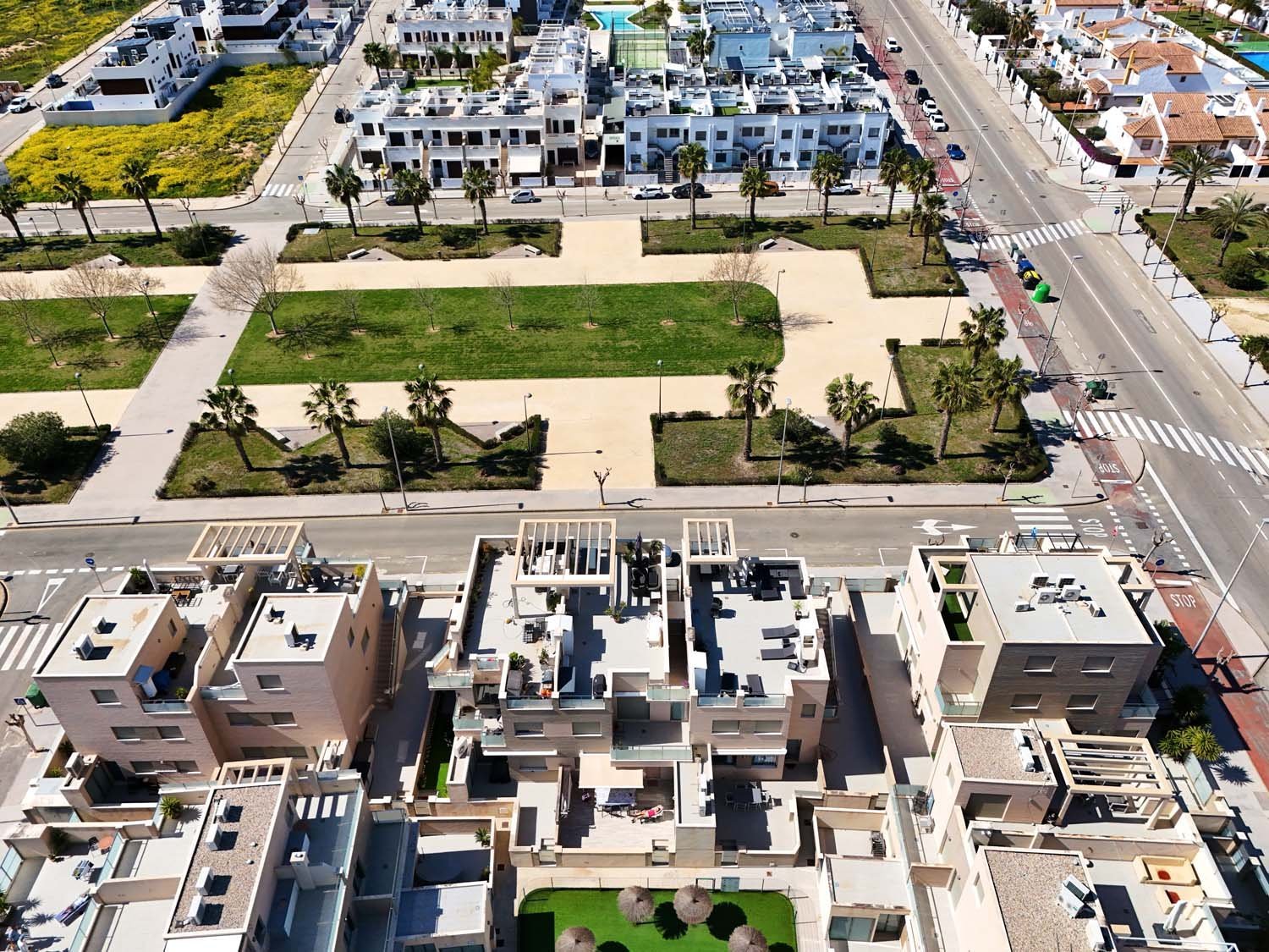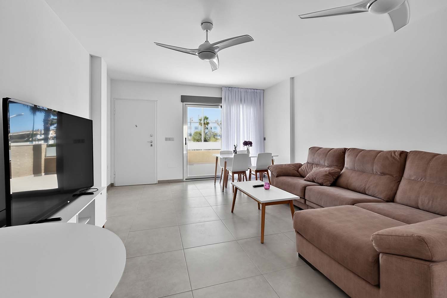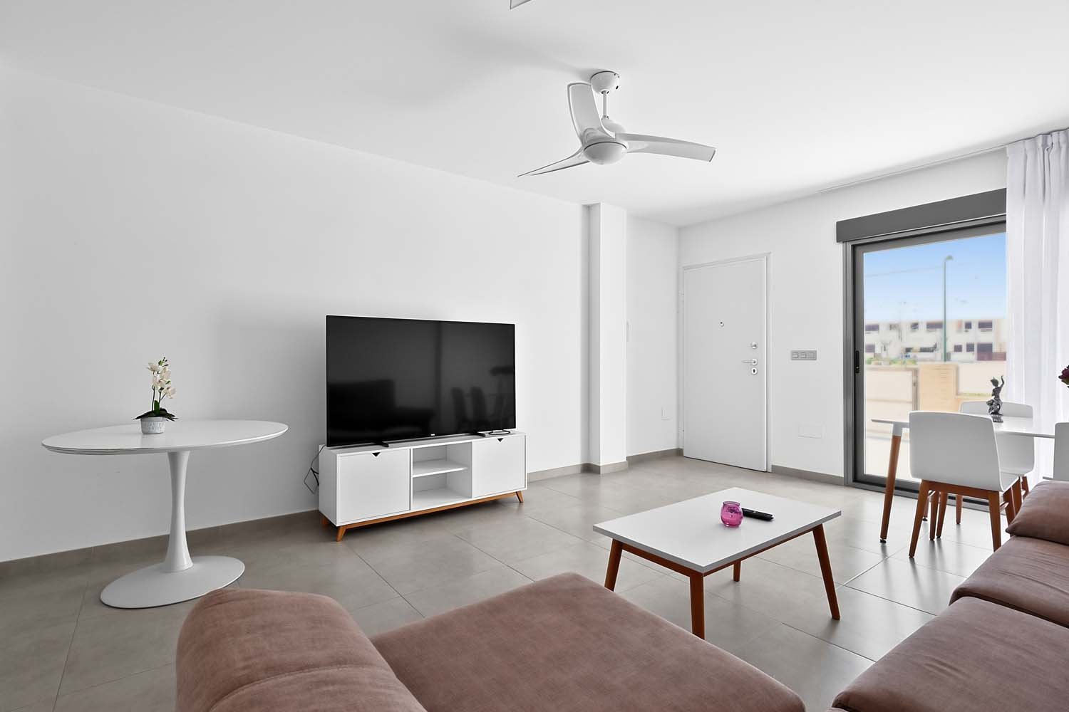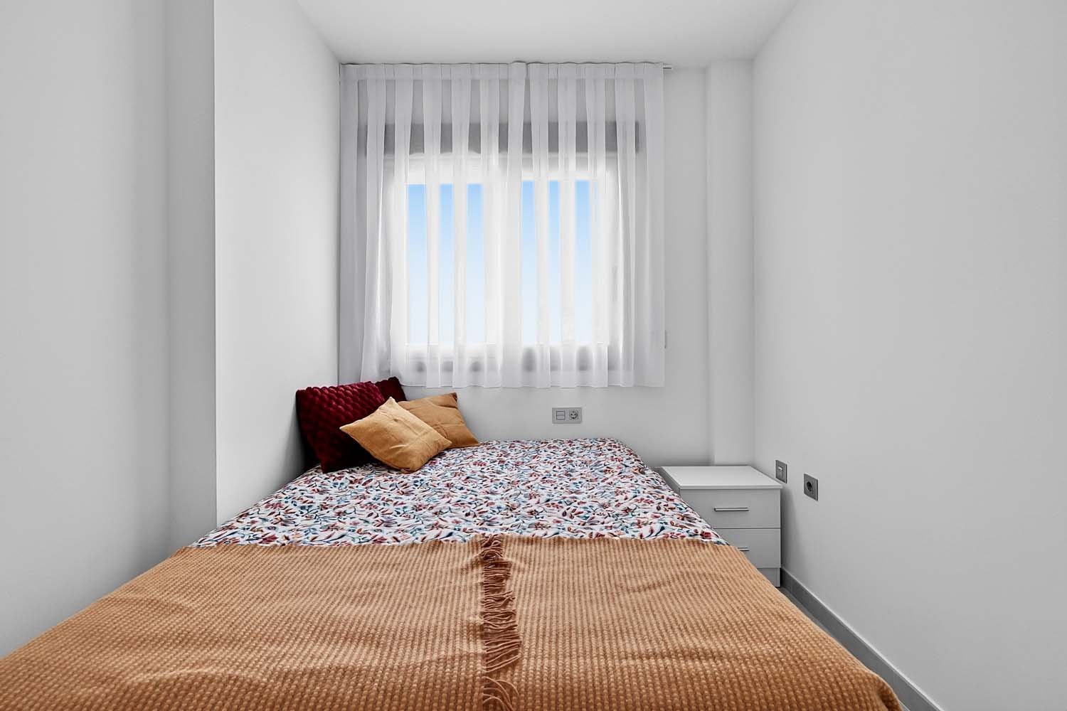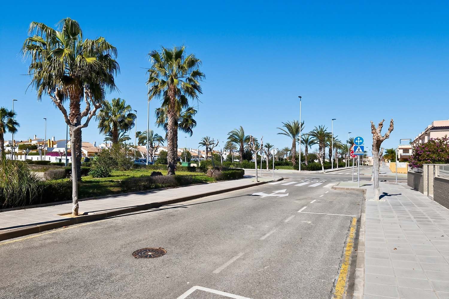 This modern, elegant, and centrally located three-bedroom, two-bathroom apartment is practically brand new in Torre de la Horadada. It's situated just 200 meters from the Plaza Nueva shopping center, about 700 meters from the sea, and boasts beautiful, unobstructed views of a park.The main entrance is accessed from the street opposite Antonio Gálvez Park. The spacious west-facing front porch is perfect for enjoying pleasant, cool breakfasts in the shade on summer mornings. From the main entrance, you enter the living-dining-room, which connects to the fully equipped kitchen with all appliances. A hallway leads to a bedroom, a full bathroom, and the master bedroom with an en-suite bathroom, both featuring walk-in showers and glass screens.Adjacent to the kitchen is a second open-plan living area: a large east-facing terrace. This terrace connects to a communal walkway that provides access to the swimming pool and gardens. This private terrace offers a tranquil, pleasant, and sunny atmosphere throughout the morning, providing abundant natural light to the apartment year-round. It's also a perfect space for relaxing or gathering with friends and family. Here you'll find a wall-to-wall aluminum cabinet housing a washing machine, dryer, electric water heater, and storage space.The property was built in 2015 with high-quality finishes, including electric blinds, underfloor heating in the bathrooms, fans and ducted central air-conditioning throughout. It features electric awnings on the interior terrace and is being sold fully-furnished and equipped with all appliances.The rear of the property provides direct access to the communal area with a swimming pool, gardens, and shaded areas. Just a two-minute walk away is the new Plaza Nueva shopping center, with its bars, cafes, and restaurants, and five minutes further on are the renowned crystal-clear beaches of El Conde and Los Jesuitas, along with the seafront promenade and the port.This property offers an excellent opportunity for investors due to its high market value for holiday rentals, as a vacation home, or as a permanent residence, given its proximity to all amenities.Book your viewing today!