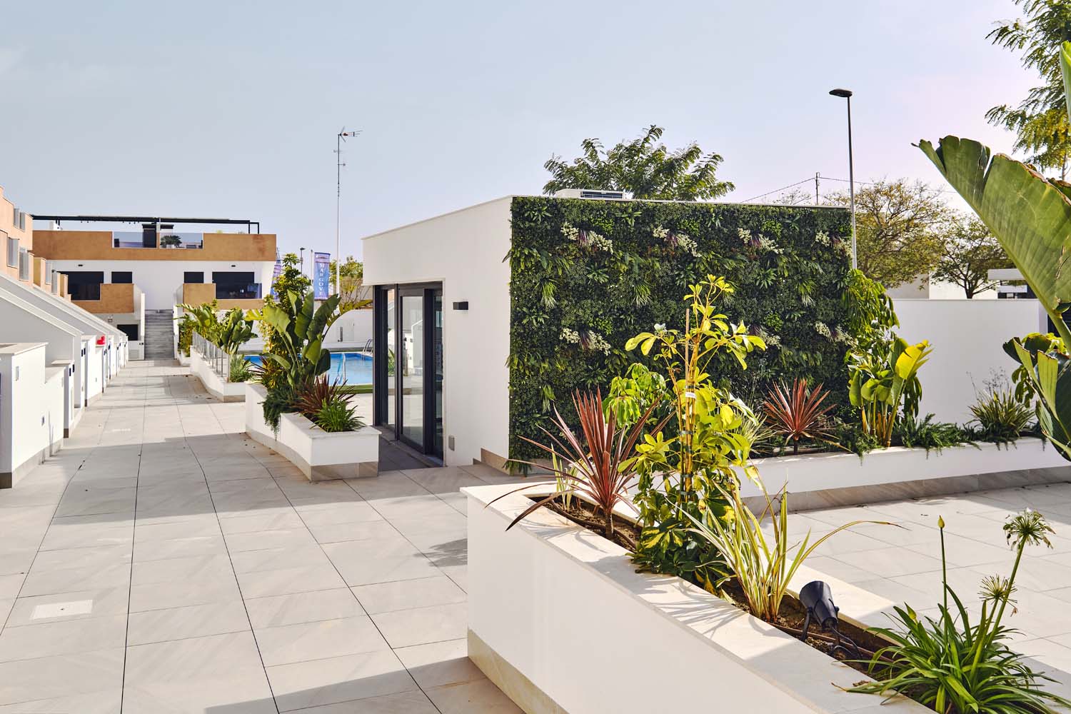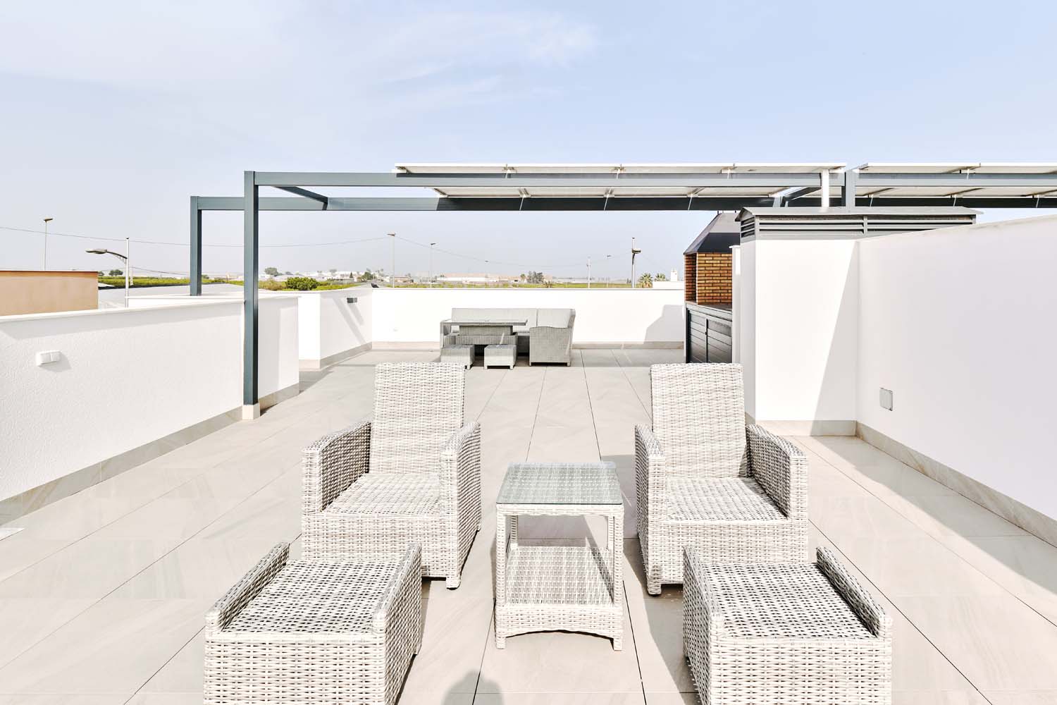 Fantastic opportunity to purchase a resale new build 3 bedroom, 2 bathroom top floor apartment in the beautiful gated community Rambla Beach II with communal pool in the popular Spanish town of Pilar de la Horadada. This stunning modern apartment is situated only 8 minutes walk from the busy high street with an array of amenities including boutique shops, cafes, restaurants and many large supermarkets, the beautiful beaches of Torre de la Horadada are only 3km and can be easily reached on foot via the "Rambla" which was originally built to carry excess flood water away to the sea during rare heavy downpours, it has been designed as a beautiful 3km walk/cycling route with local art installations along the way. To access the apartment a set of stairs lead up to a private terrace where the front door is located, the front door is a patio door and opens into a light and bright open plan living/dining room with the fully fitted kitchen with breakfast bar located at the rear. A door from the side of the living area leads into the master bedroom with en suite bathroom, built in wardrobes and patio doors which also lead onto the front terrace. The second and third bedrooms are located at the rear of the apartment they are both good sized doubles with built in wardrobes, also located off the living room is the second family bathroom with walk in shower. This apartment also benefits from a large private solarium which is accessed via a door from the kitchen opening to a utility area and external stairs leading up to the solarium. The spacious private solarium is equipped with shower, outside kitchen with BBQ and plenty of space for sun loungers and a dining area, it also enjoys countryside views to the front and sea views to the rear. This apartment was constructed in 2022 and has lots of added extras including ducted hot/cold air conditioning, underfloor heating in the bathrooms and living room, allocated parking space, storage room and also has access to a beautiful communal swimming pool with jacuzzi and a gym. Contact us today to arrange a viewing.