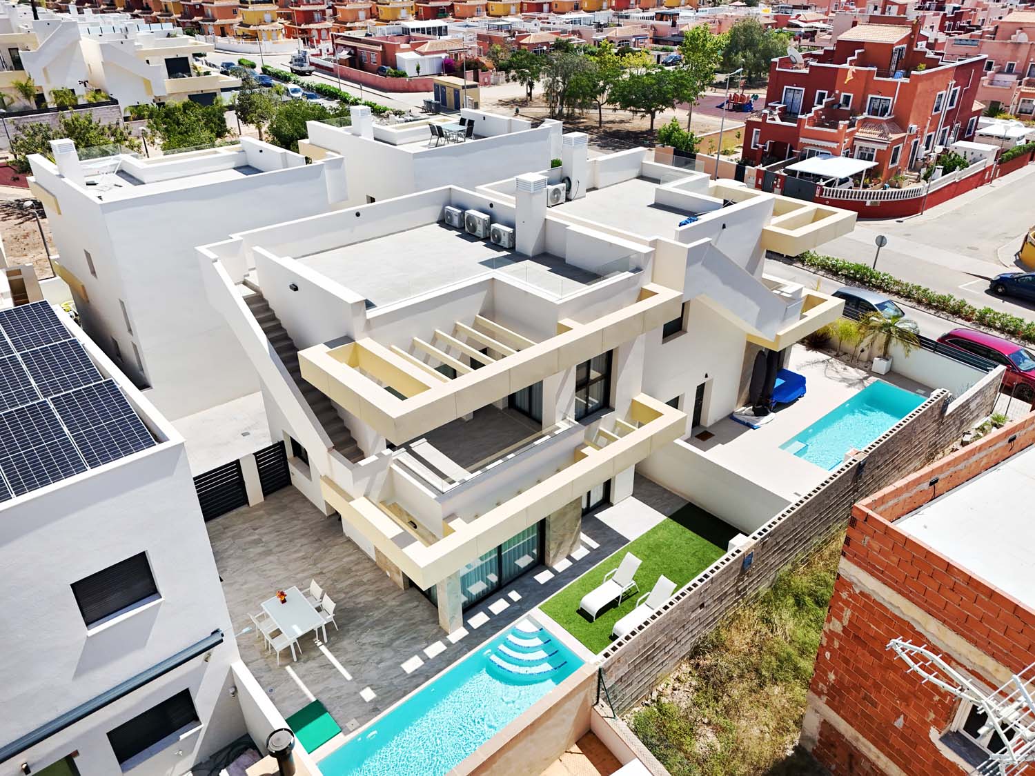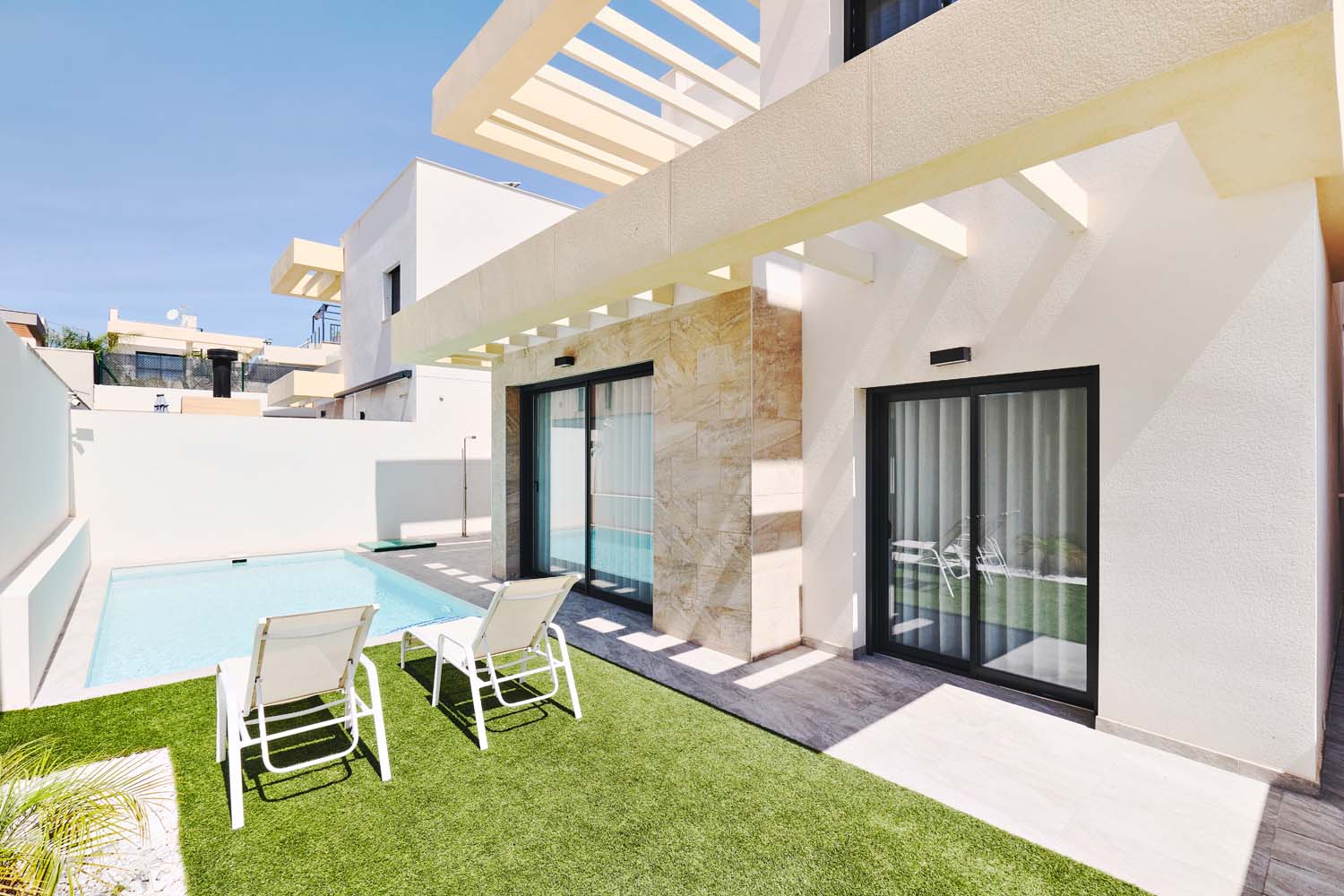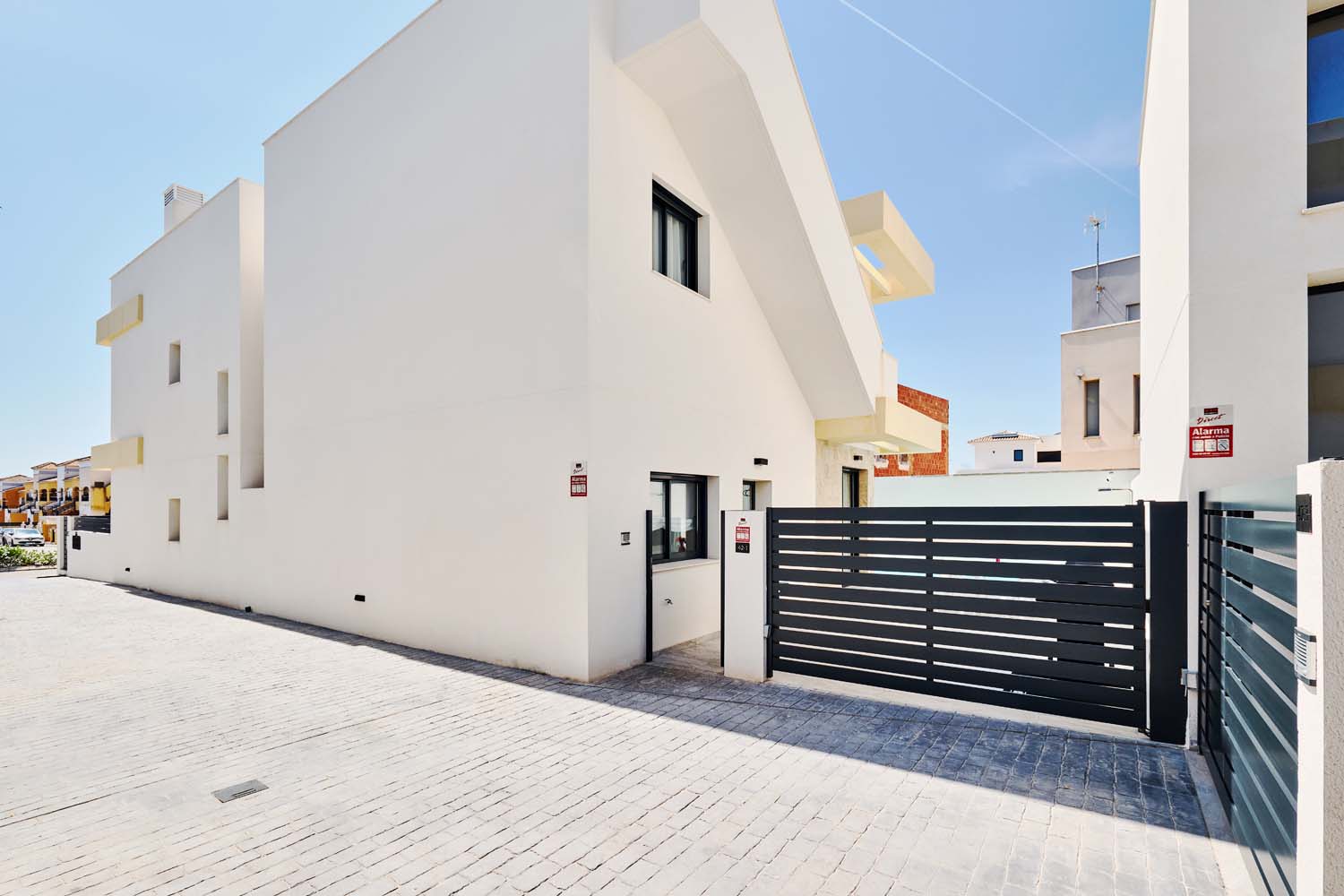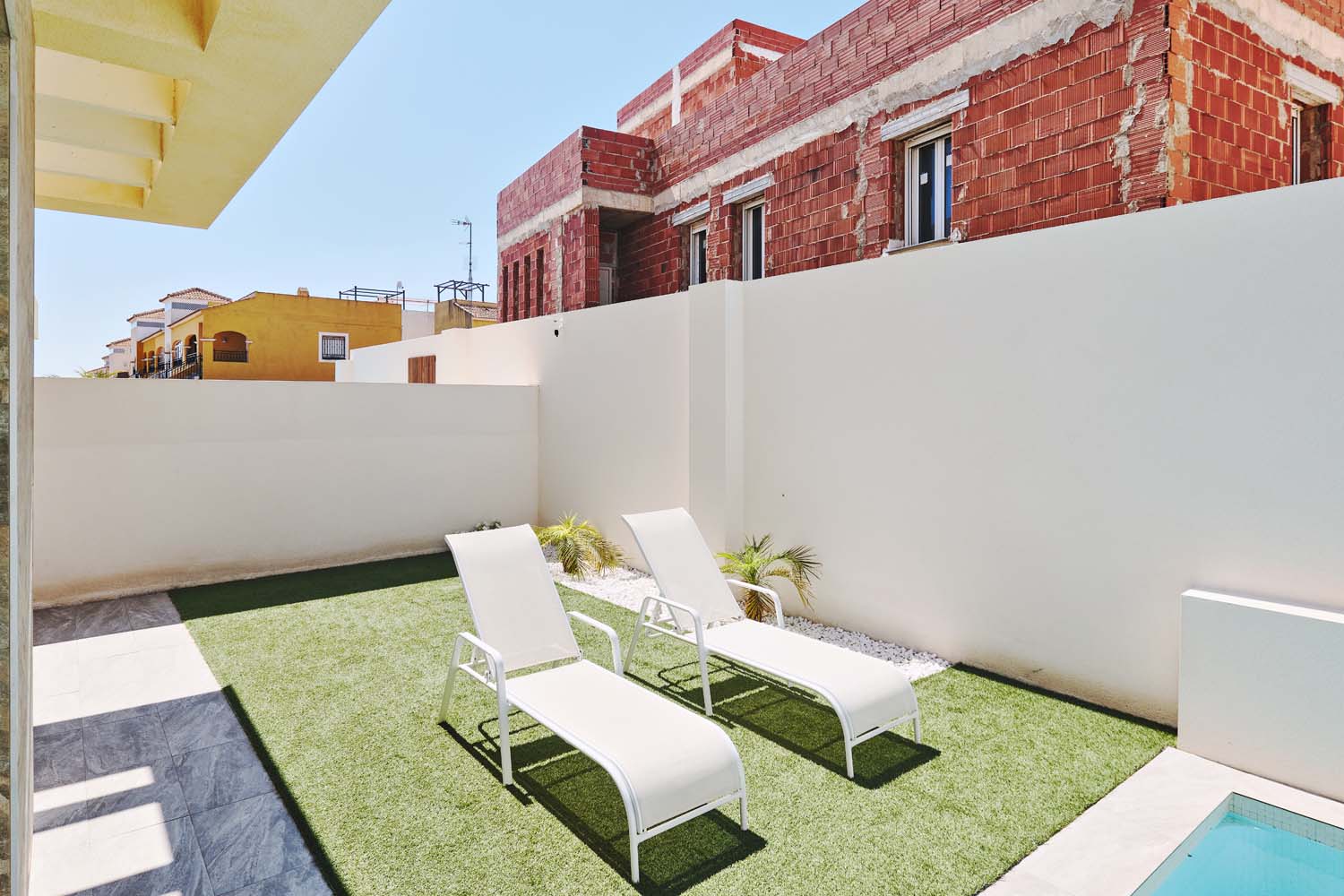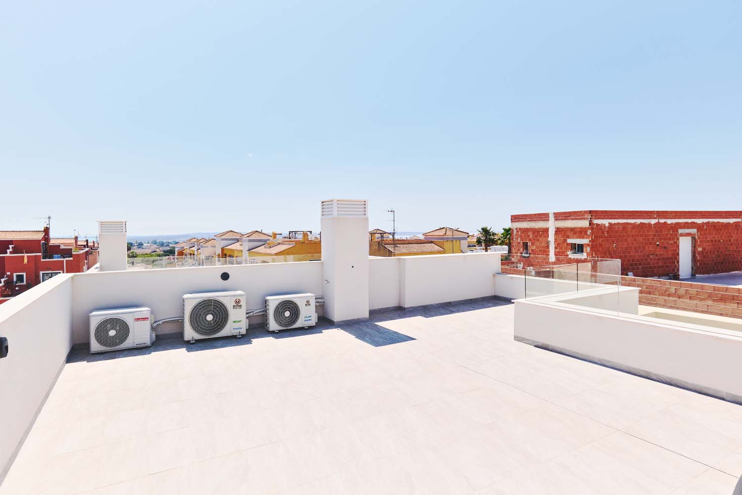 Fantastic opportunity to purchase a modern 3 bedroom, 2 bathroom detached villa with private swimming pool and off street parking, situated in a quiet cul de sac and small urbanisation on the edge of Los Montesinos town with an array of amenities and only 20 minutes drive to the beach. This beautiful villa is part of a community of only 6 detached villas in a small quiet cul de sac situated next to a green/park area and is only a few minutes walk to a large supermarket. To the outside of the villa is a spacious low maintenance plot with driveway accessible via a electric sliding gate, there is a private swimming pool with plenty of space for sunbathing and entertaining. The front door of the villa opens into a light and spacious open plan living/dining room with kitchen, the kitchen is a good size U shape with plenty of storage and there is a separate utility room next to the kitchen it is hidden and accessible by double white doors, in the living room there are patio doors which flood the room with natural light and give direct access out to the pool area. Also located on the ground floor is a bathroom with walk in shower and a large double bedroom with built in wardrobes and patio doors leading to the garden. A beautiful modern stone and glass staircase leads from the living area to the first floor of the villa, here there are two double bedrooms and a spacious family bathroom. Both bedrooms are light and good sized doubles with built in wardrobes, one of the bedrooms also benefits from direct access to the family bathroom and patio doors out to a terrace. The jack and jill bathroom has a large walk in shower and can also be accessed via a door from the hallway. There is another door in the hallway that leads onto the terrace where an external staircase leads to a large sunny roof terrace with lovely views, water and electric points should you wish to add a outside kitchen. This villa has a long list of added extras including ducted air conditioning, under floor heating in the bathrooms, private swimming pool, outside shower and electric gate. This property is immaculate, requires no work and is sold fully furnished, just pack your suitcase and enjoy! Viewing is highly recommended!