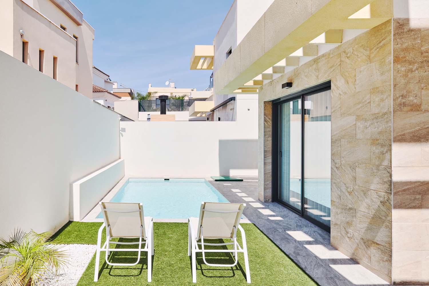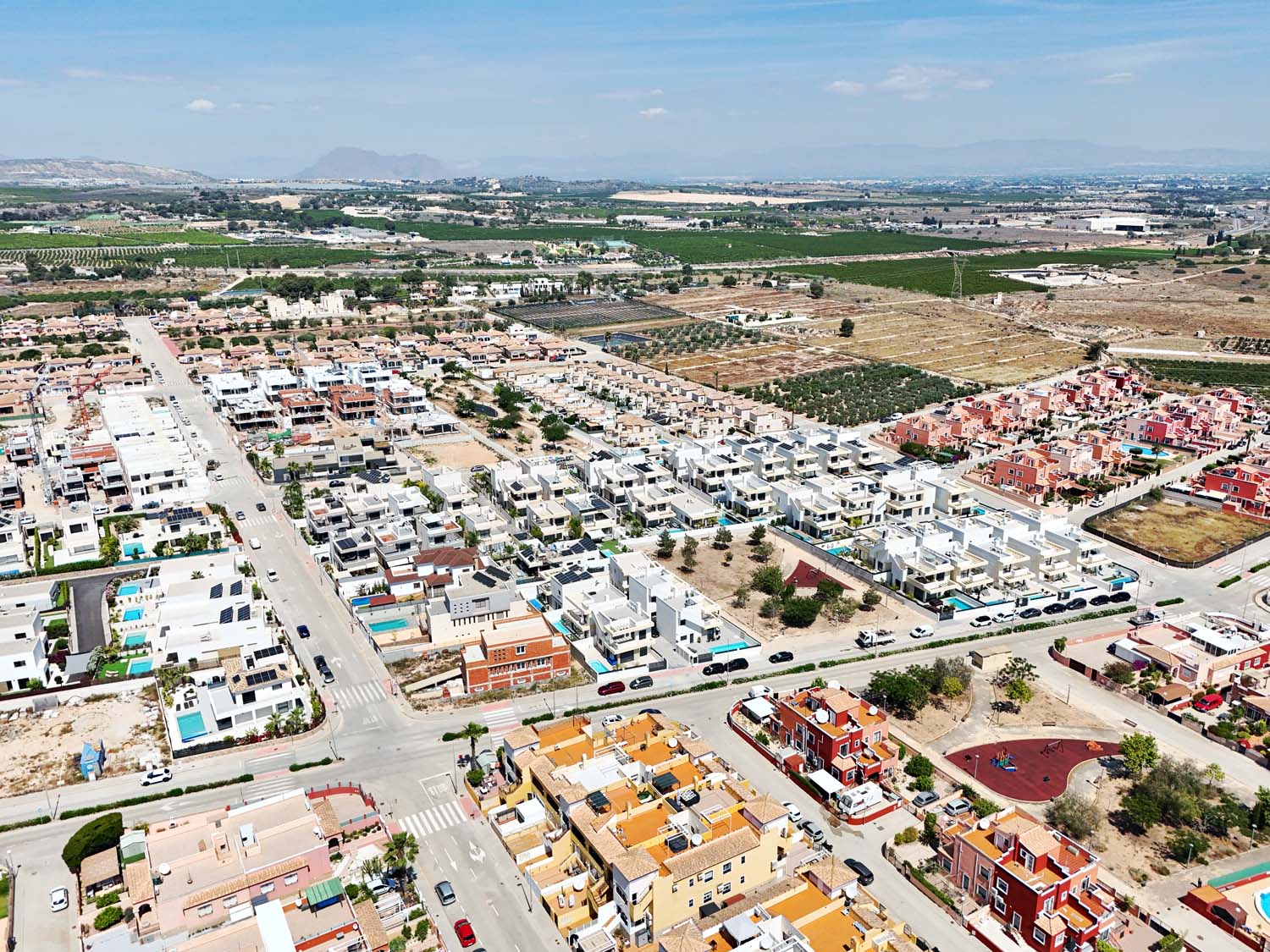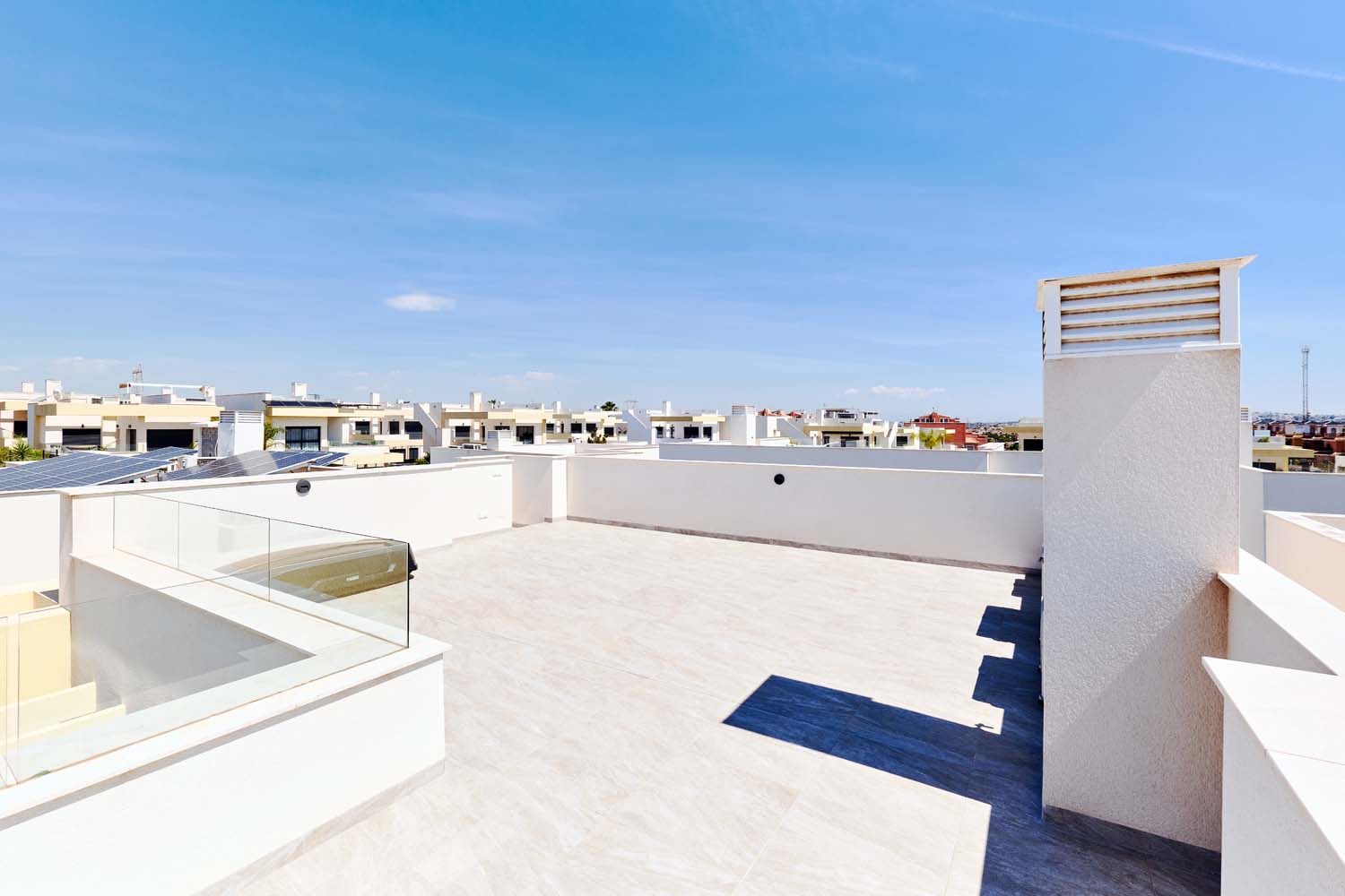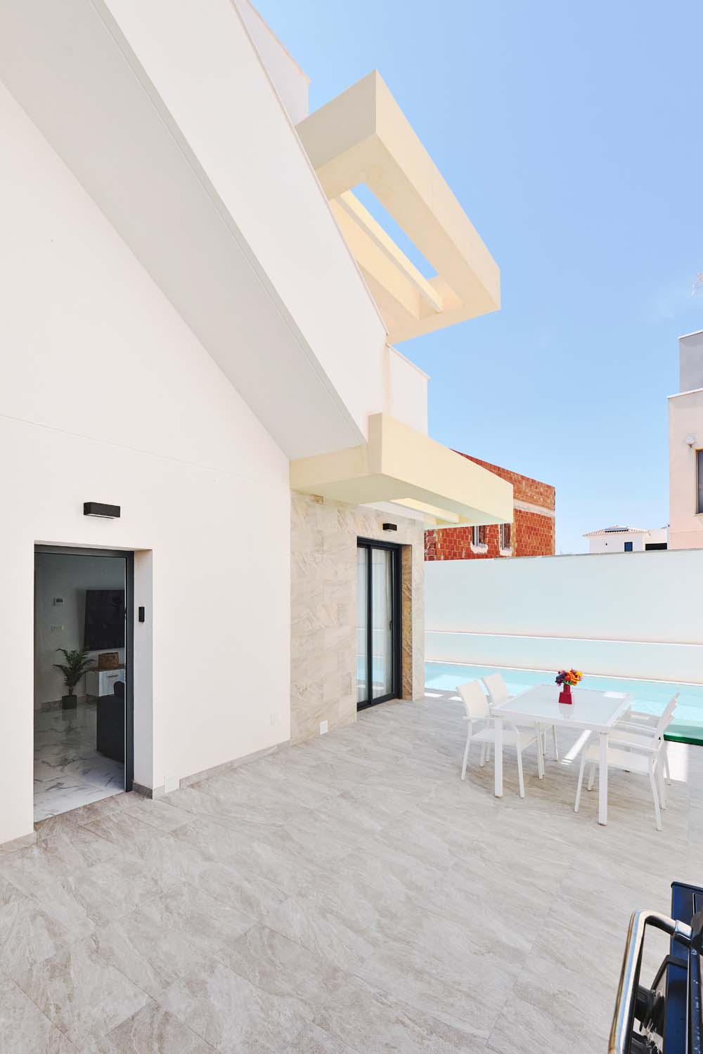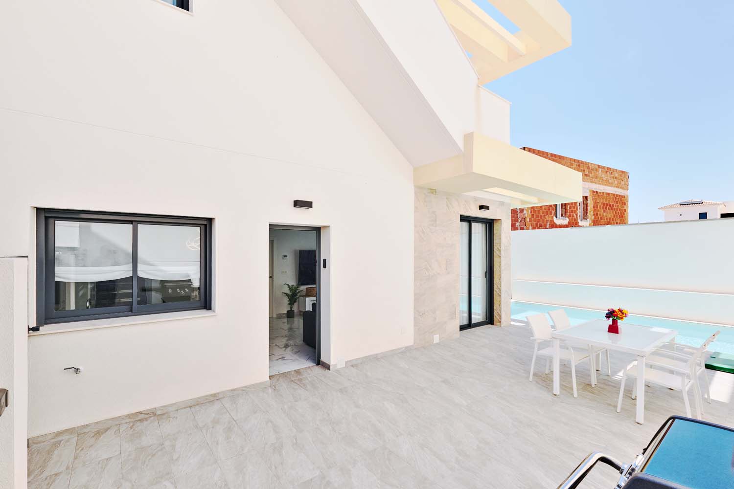 Fantastic opportunity to purchase a modern 3 bedroom, 2 bathroom detached villa with private swimming pool and off street parking, situated in a quiet cul de sac and small urbanisation on the edge of Los Montesinos town with an array of amenities and only 20 minutes drive to the beach. This beautiful villa is part of a community of only 6 detached villas in a small quiet cul de sac situated next to a green/park area and is only a few minutes walk to a large supermarket. To the outside of the villa is a spacious low maintenance plot with driveway accessible via a electric sliding gate, there is a private swimming pool with plenty of space for sunbathing and entertaining. The front door of the villa opens into a light and spacious open plan living/dining room with kitchen, the kitchen is a good size U shape with plenty of storage and there is a separate utility room next to the kitchen it is hidden and accessible by double white doors, in the living room there are patio doors which flood the room with natural light and give direct access out to the pool area. Also located on the ground floor is a bathroom with walk in shower and a large double bedroom with built in wardrobes and patio doors leading to the garden. A beautiful modern stone and glass staircase leads from the living area to the first floor of the villa, here there are two double bedrooms and a spacious family bathroom. Both bedrooms are light and good sized doubles with built in wardrobes, one of the bedrooms also benefits from direct access to the family bathroom and patio doors out to a terrace. The jack and jill bathroom has a large walk in shower and can also be accessed via a door from the hallway. There is another door in the hallway that leads onto the terrace where an external staircase leads to a large sunny roof terrace with lovely views, water and electric points should you wish to add a outside kitchen. This villa has a long list of added extras including ducted air conditioning, under floor heating in the bathrooms, private swimming pool, outside shower and electric gate. This property is immaculate, requires no work and is sold fully furnished, just pack your suitcase and enjoy! Viewing is highly recommended!