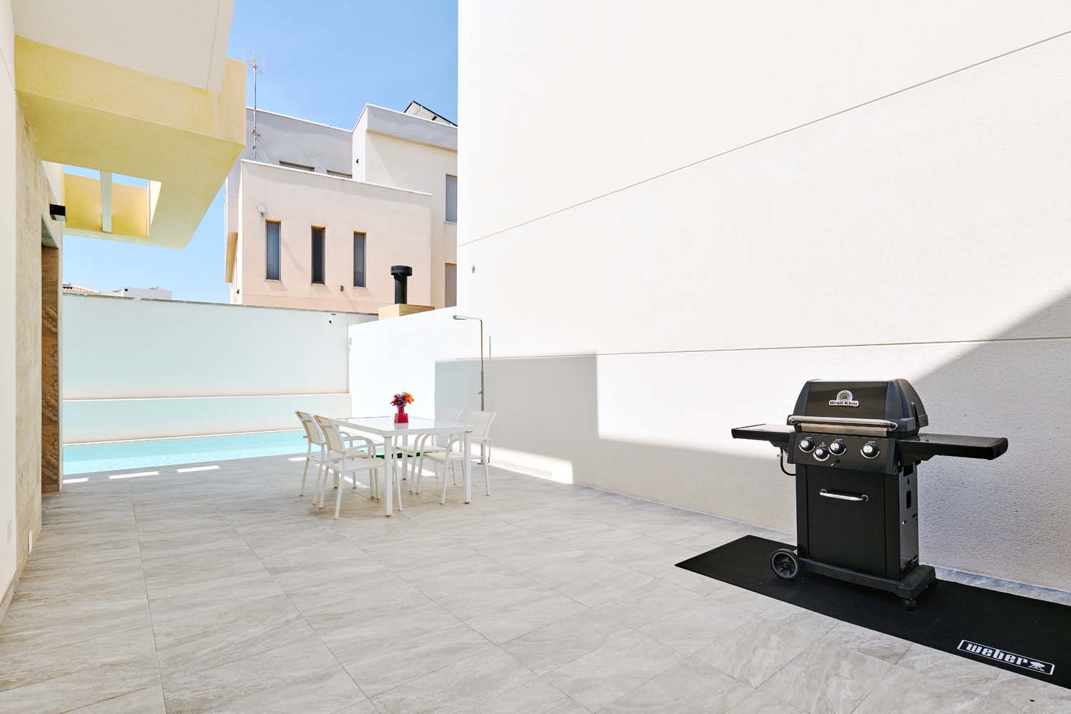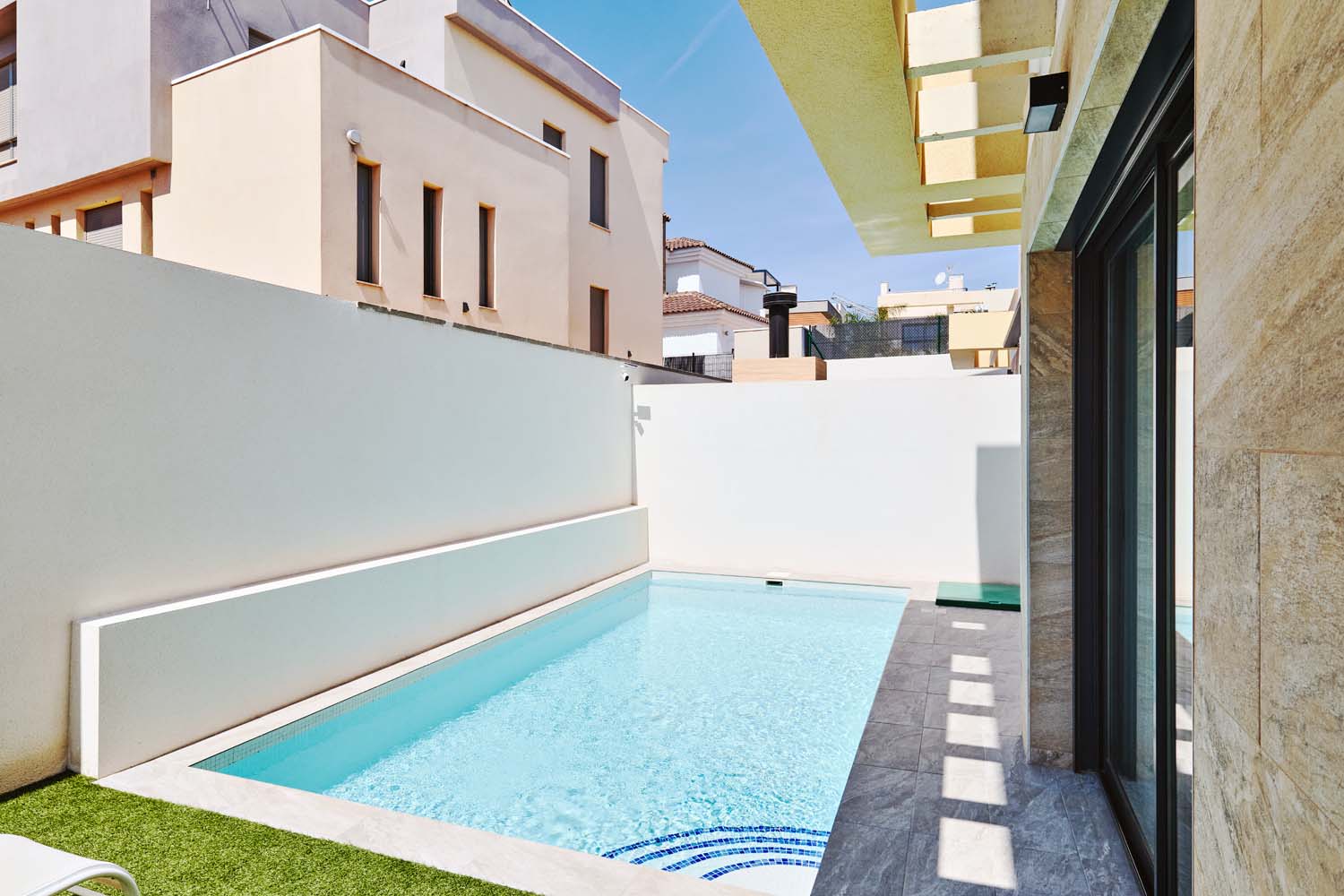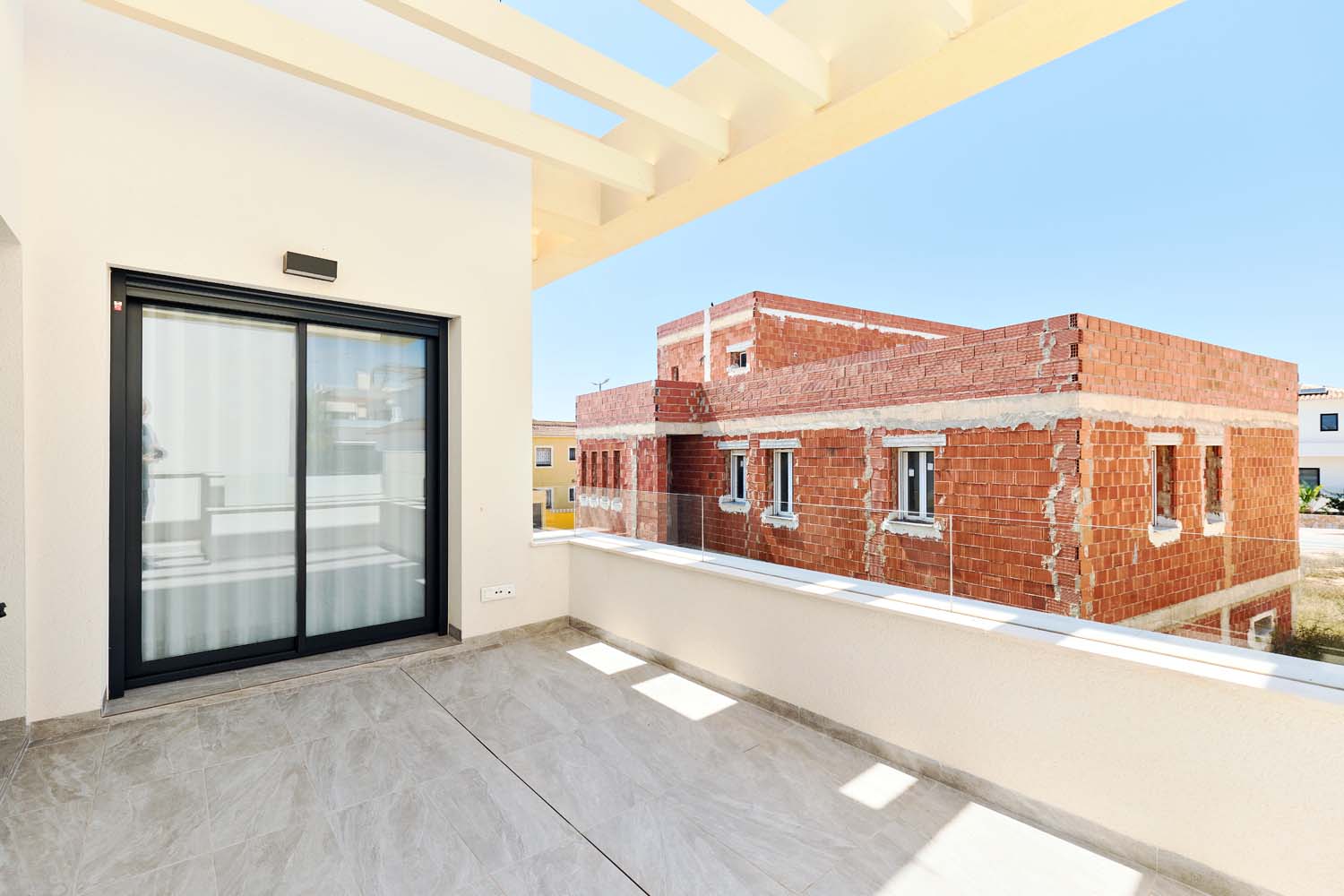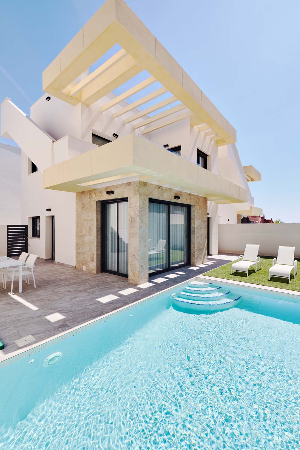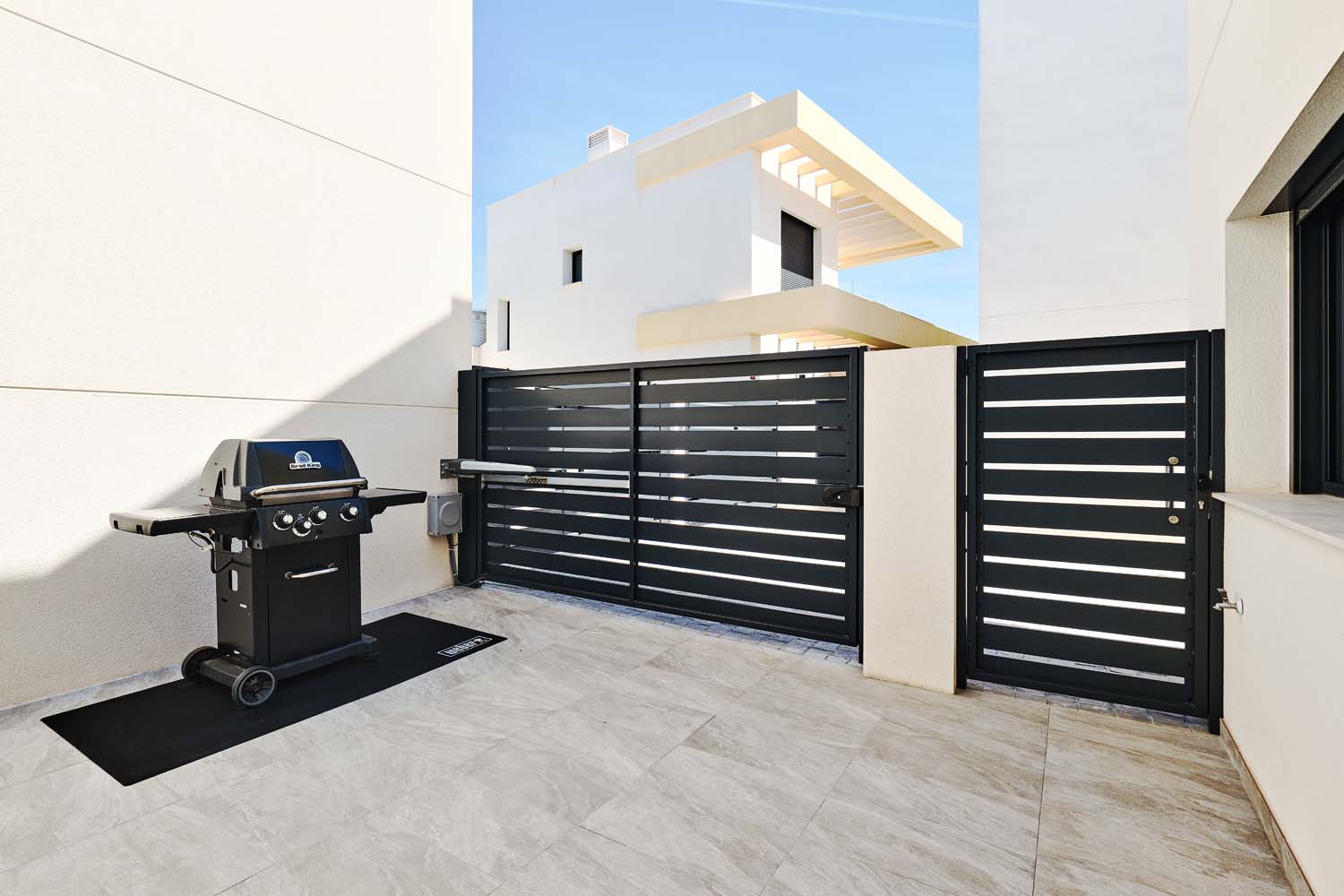 Fantastic opportunity to purchase a modern 3 bedroom, 2 bathroom detached villa with private swimming pool and off street parking, situated in a quiet cul de sac and small urbanisation on the edge of Los Montesinos town with an array of amenities and only 20 minutes drive to the beach. This beautiful villa is part of a community of only 6 detached villas in a small quiet cul de sac situated next to a green/park area and is only a few minutes walk to a large supermarket. To the outside of the villa is a spacious low maintenance plot with driveway accessible via a electric sliding gate, there is a private swimming pool with plenty of space for sunbathing and entertaining. The front door of the villa opens into a light and spacious open plan living/dining room with kitchen, the kitchen is a good size U shape with plenty of storage and there is a separate utility room next to the kitchen it is hidden and accessible by double white doors, in the living room there are patio doors which flood the room with natural light and give direct access out to the pool area. Also located on the ground floor is a bathroom with walk in shower and a large double bedroom with built in wardrobes and patio doors leading to the garden. A beautiful modern stone and glass staircase leads from the living area to the first floor of the villa, here there are two double bedrooms and a spacious family bathroom. Both bedrooms are light and good sized doubles with built in wardrobes, one of the bedrooms also benefits from direct access to the family bathroom and patio doors out to a terrace. The jack and jill bathroom has a large walk in shower and can also be accessed via a door from the hallway. There is another door in the hallway that leads onto the terrace where an external staircase leads to a large sunny roof terrace with lovely views, water and electric points should you wish to add a outside kitchen. This villa has a long list of added extras including ducted air conditioning, under floor heating in the bathrooms, private swimming pool, outside shower and electric gate. This property is immaculate, requires no work and is sold fully furnished, just pack your suitcase and enjoy! Viewing is highly recommended!
